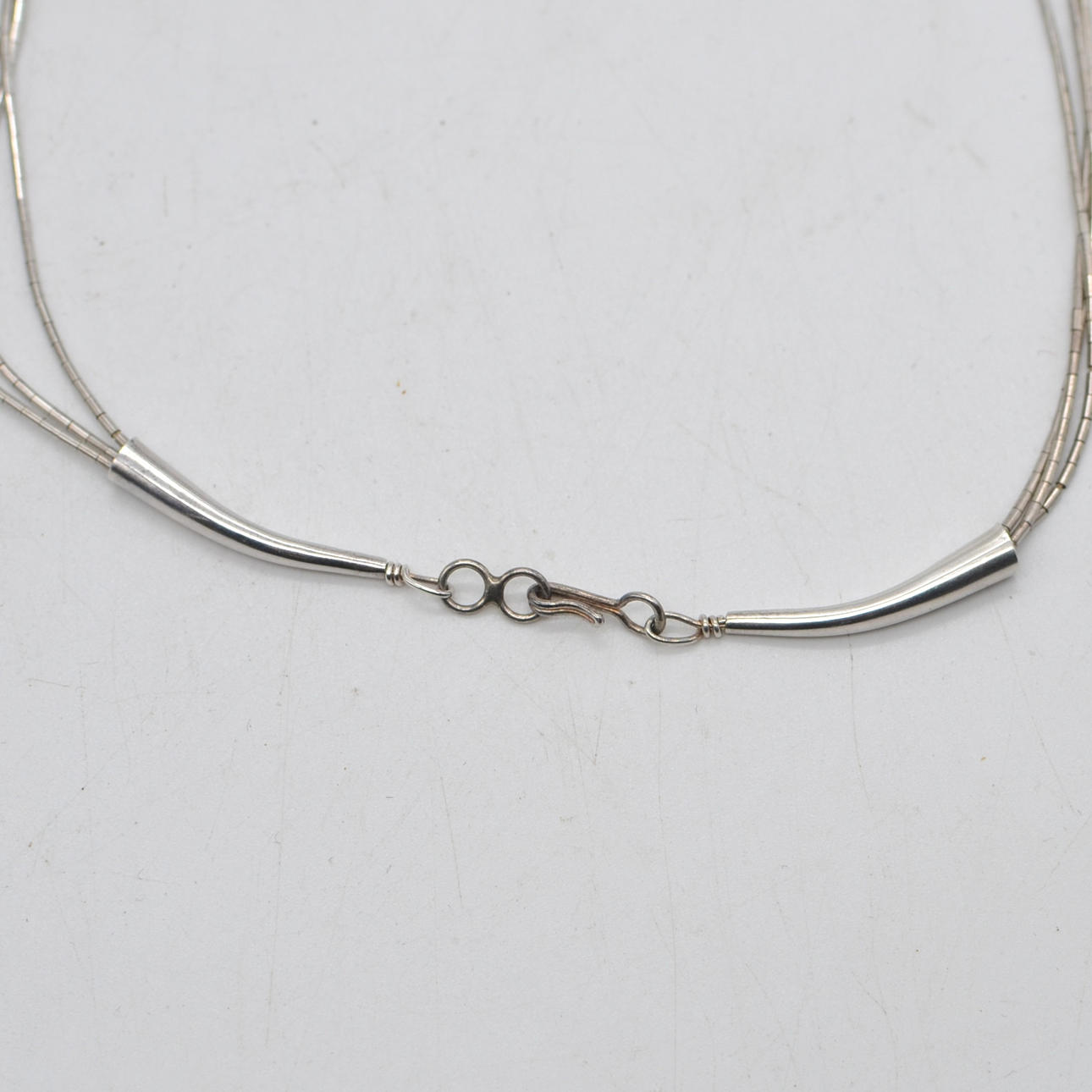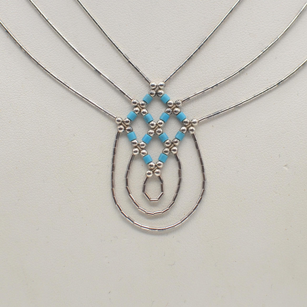 Sterling silver necklace with small turquoise beads from the 20th century. Three-strand necklace in structure tied with a white thread. There is a hook closure at the end of the chain. The necklace has no hallmark - the material was tested for 925 silver.