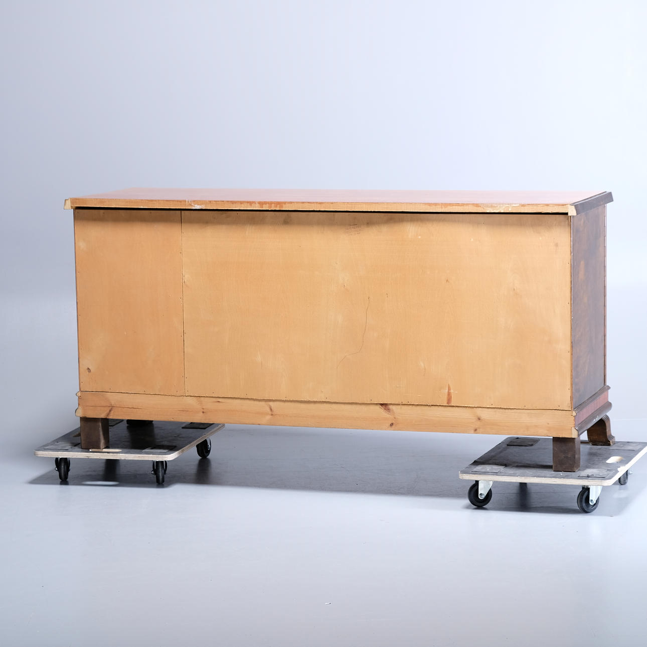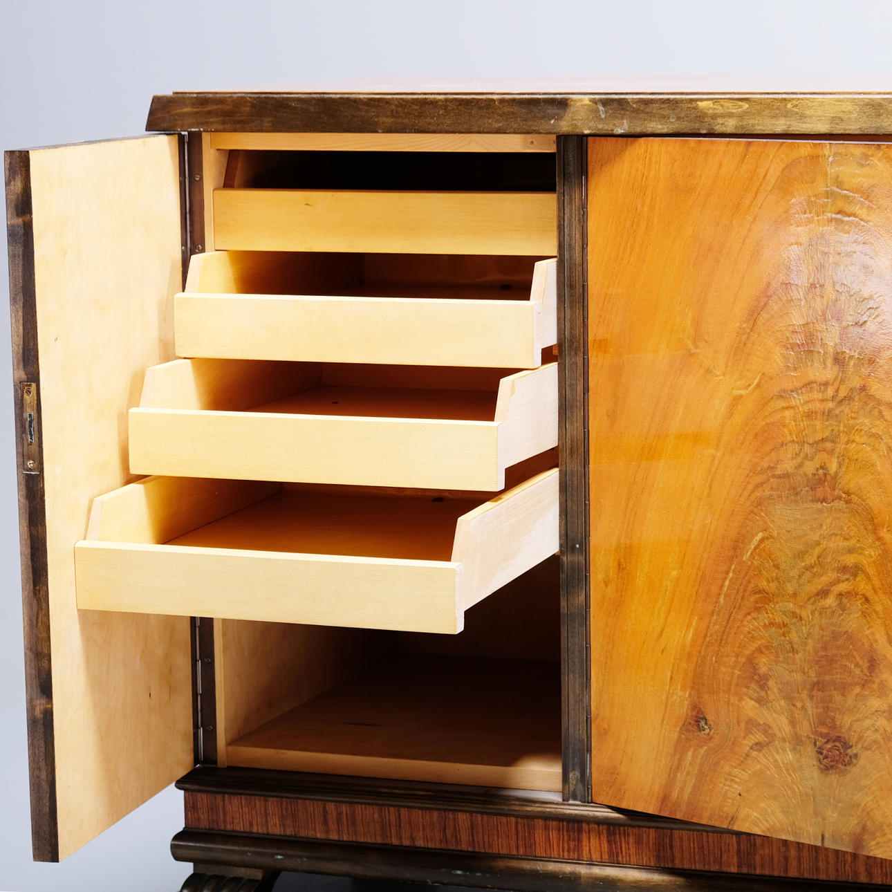 Veneered in different types of wood. Decorate with flowers on two of the doors. A pair of doors with a back shelf. A door with shelves.