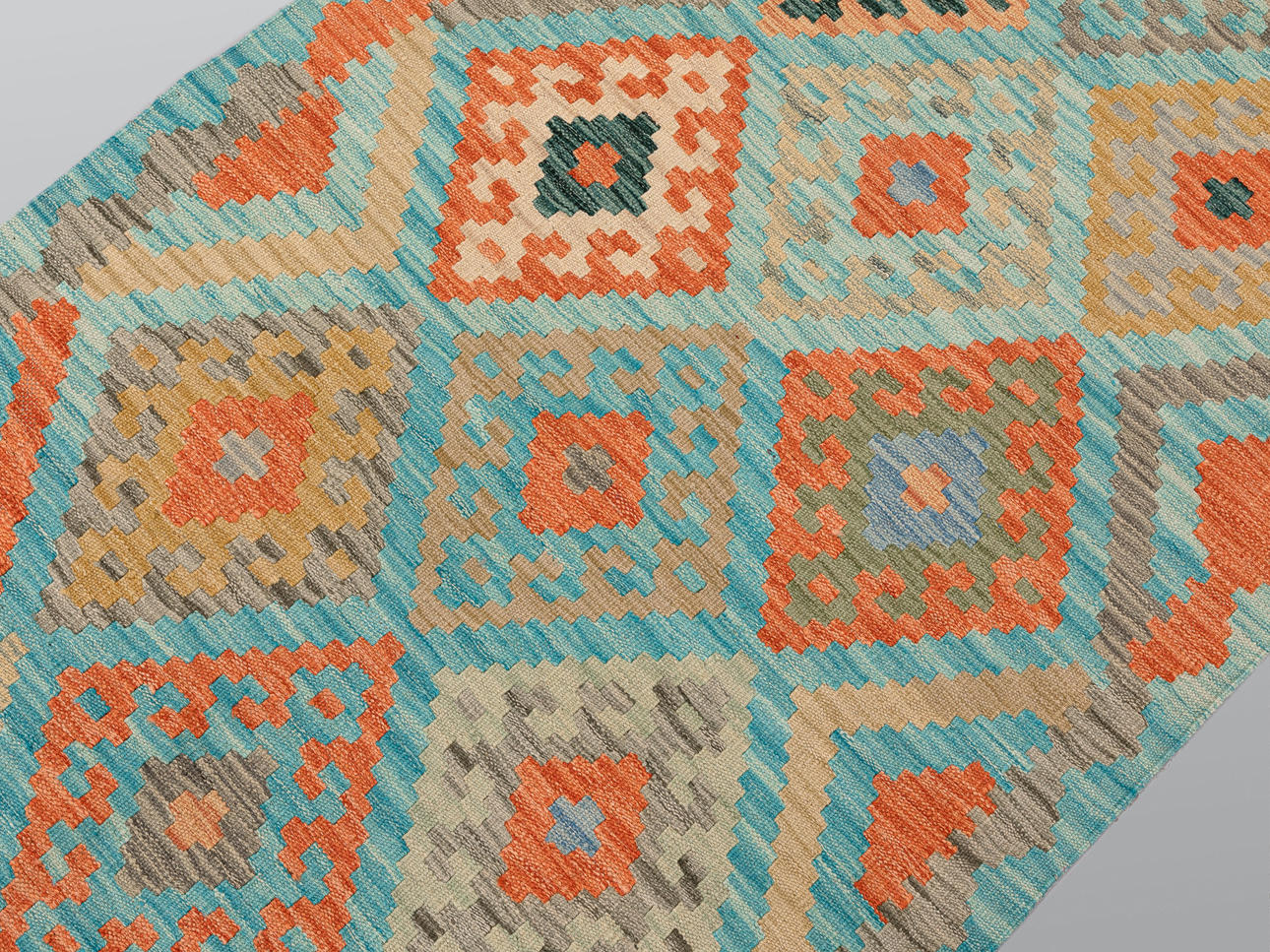 Handwoven Kelim in classic design with blue bottom color and geometric pattern in polychrome color scale. The center field consists of rhomboid figures in varying shades framed by a border with similar motifs.