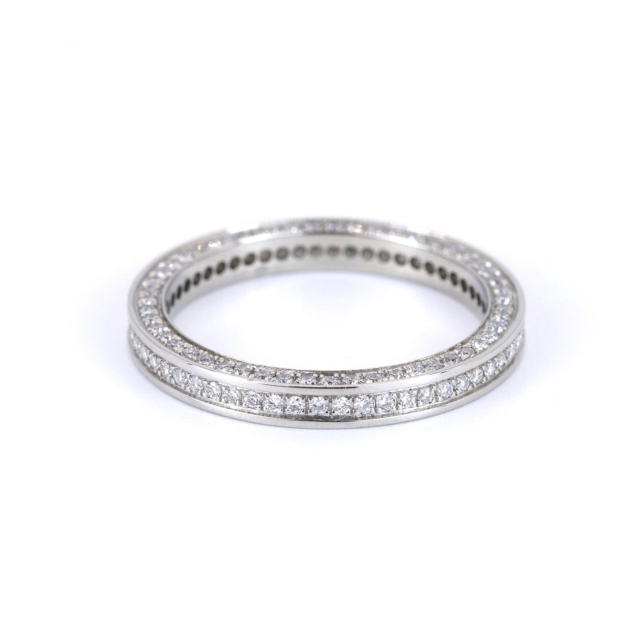 A platinum full eternity ring with diamonds on the sides.