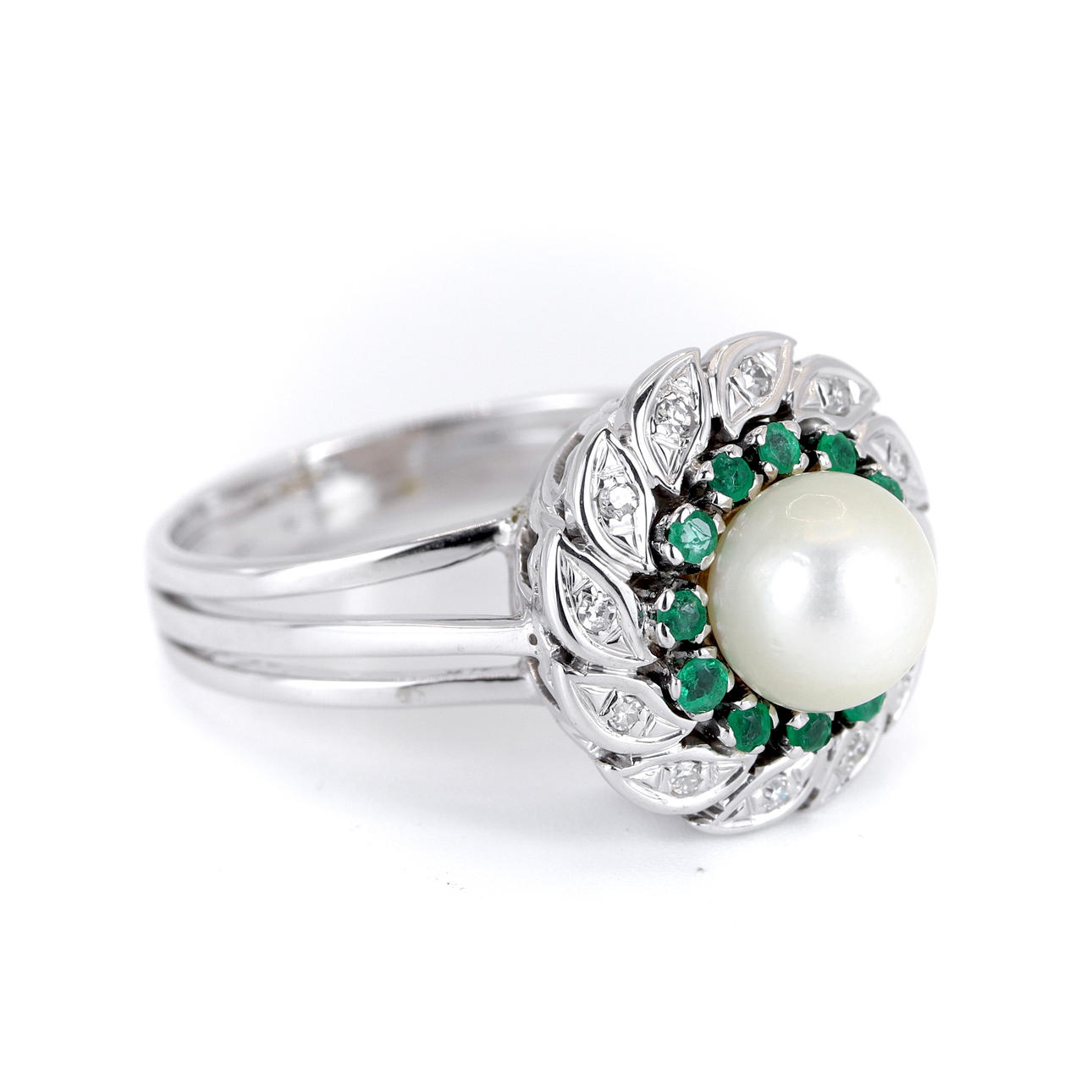 An 18ct white gold ring set with natural pearl surrounded by emeralds and diamonds.