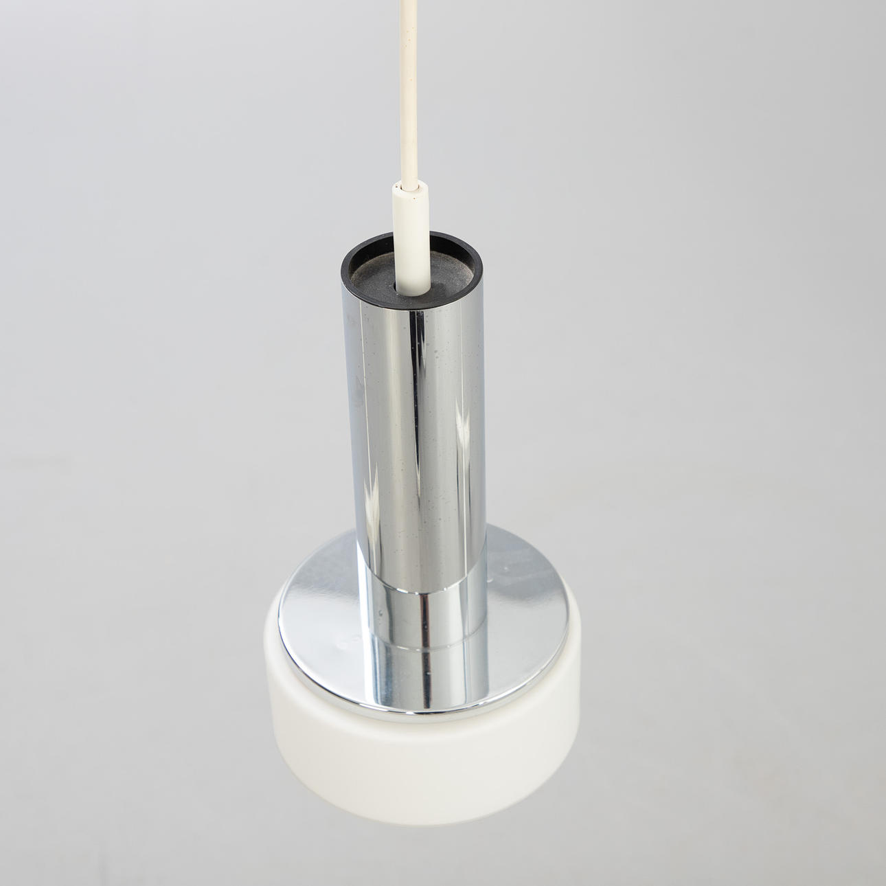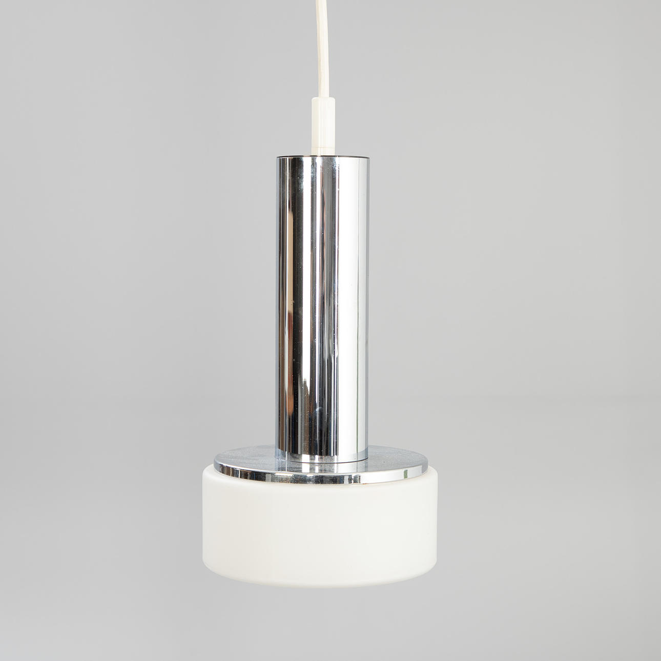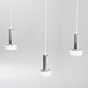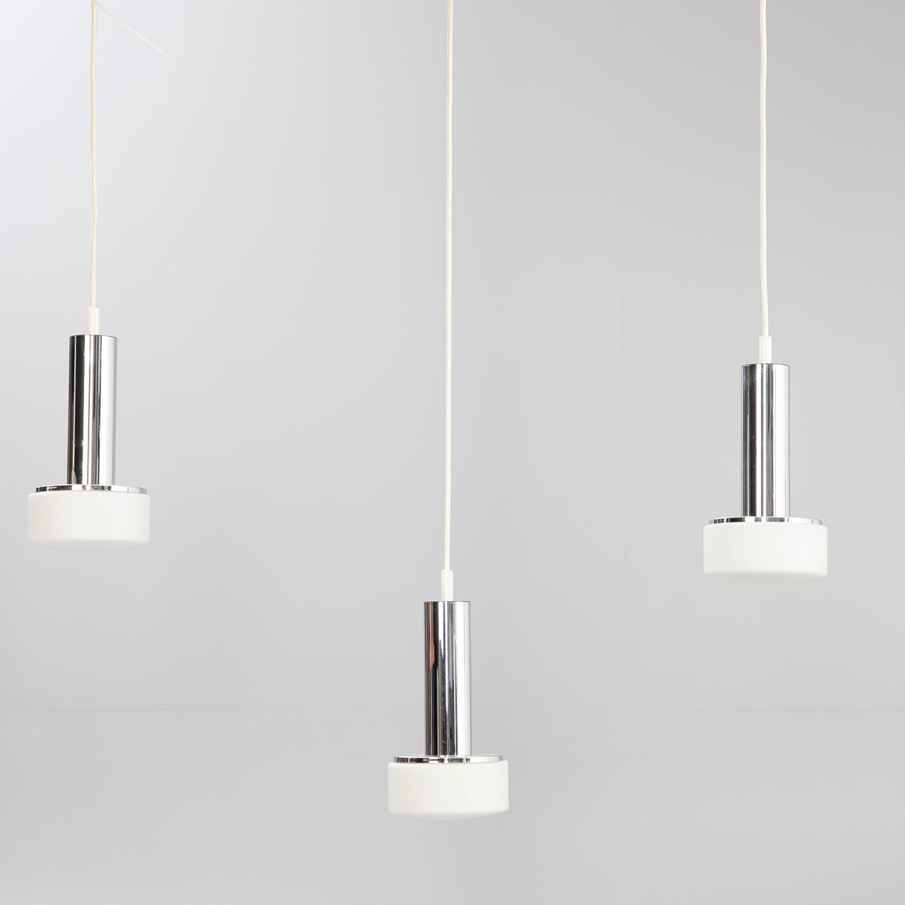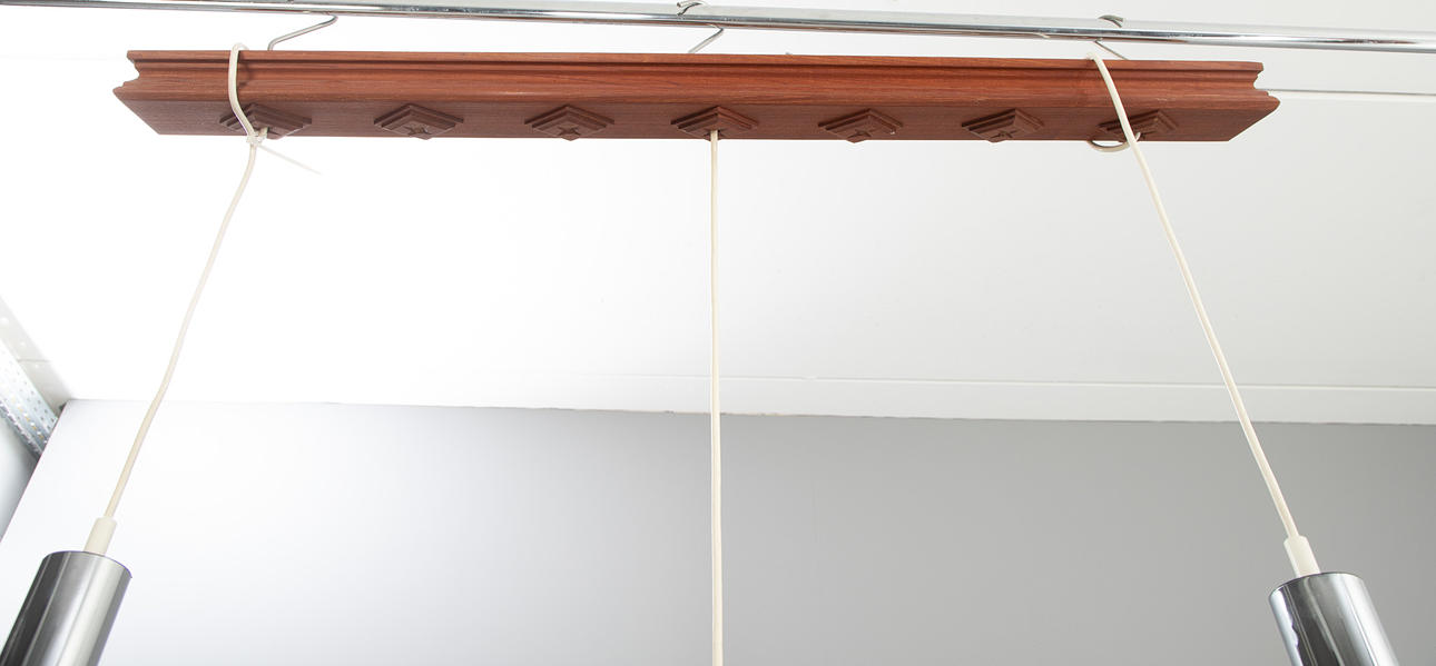 opal glass and chrome. 3 lamps mounted on a wooden strip. L. ca. 115 cm, diameter per lamp cca 16 cm.