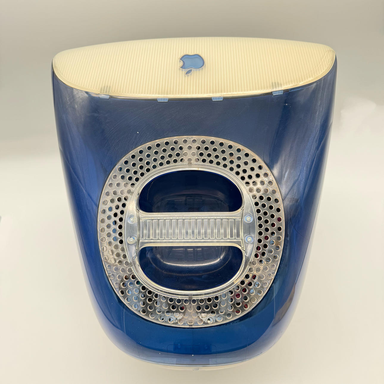 Apple iMac, probably G3, transparent dark blue, without accessories. Just the device without anything.