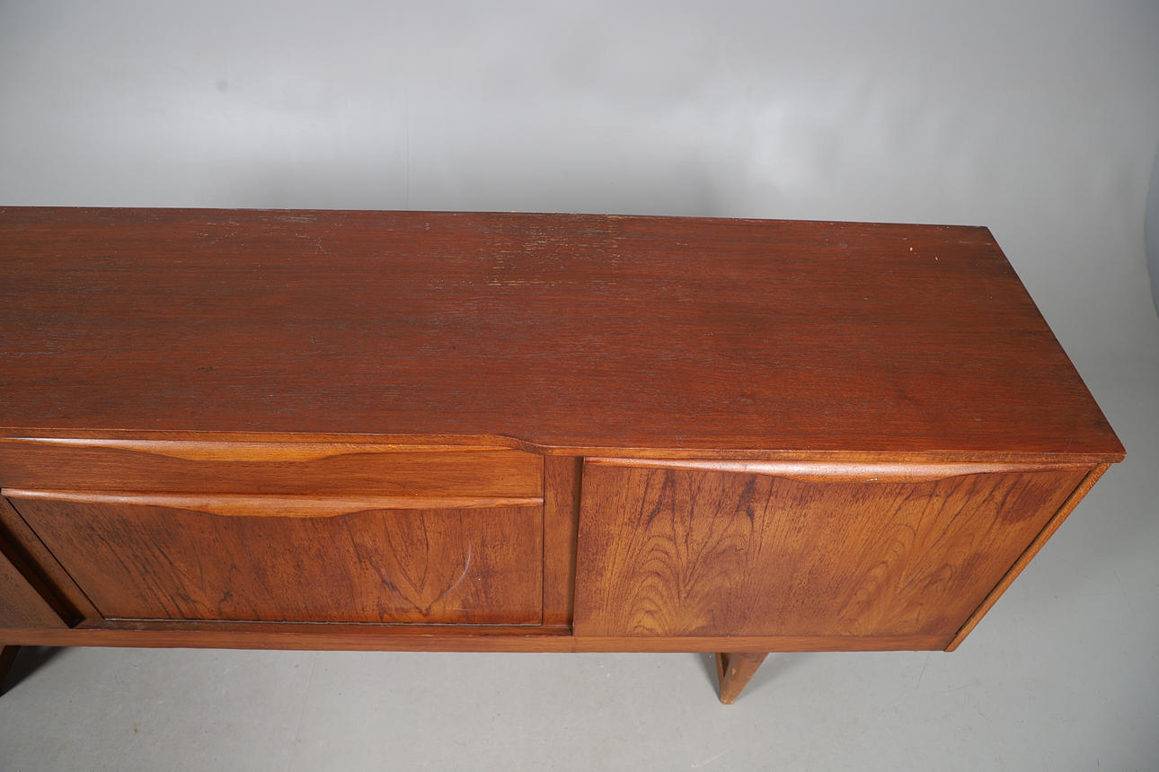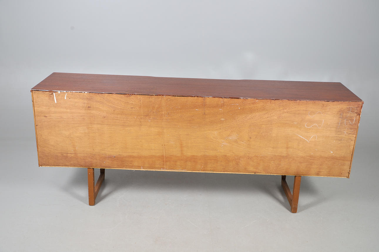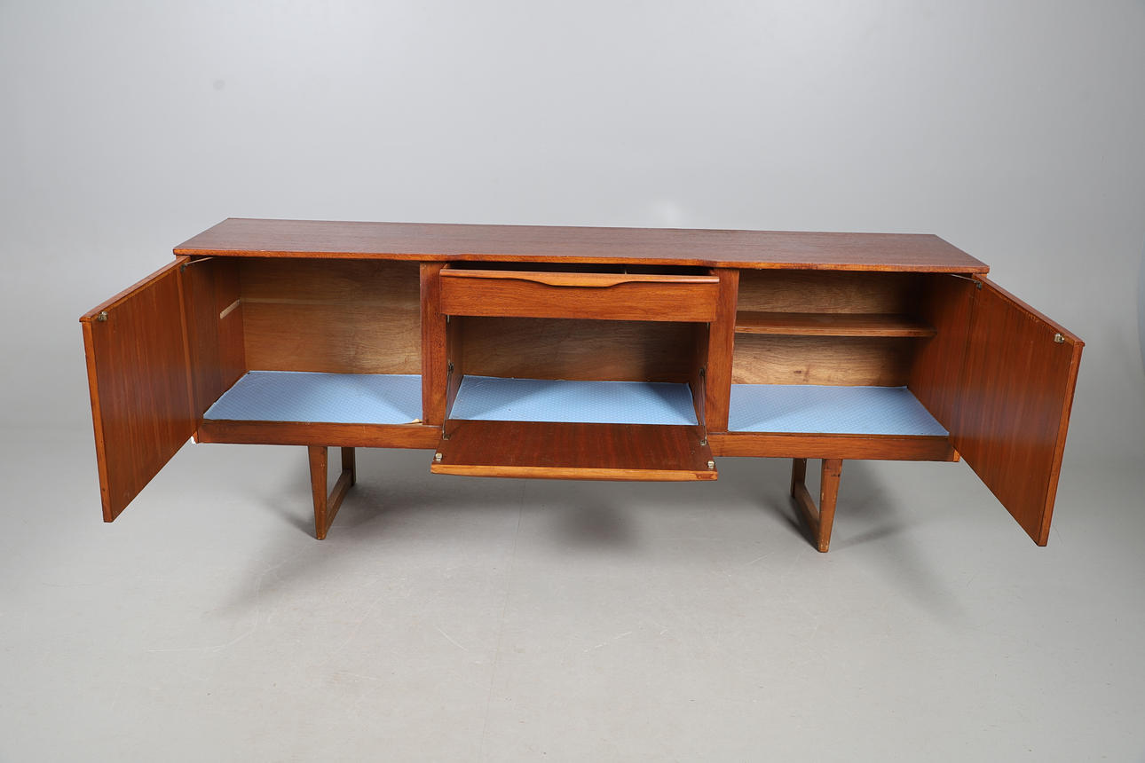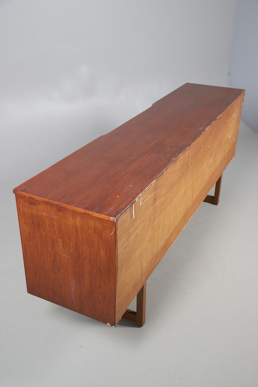 Possibly by McIntosh, with a central drawer and cupboard flanked by larger cupboards on each side. No makers label. 182cms long, 73.5cms high.