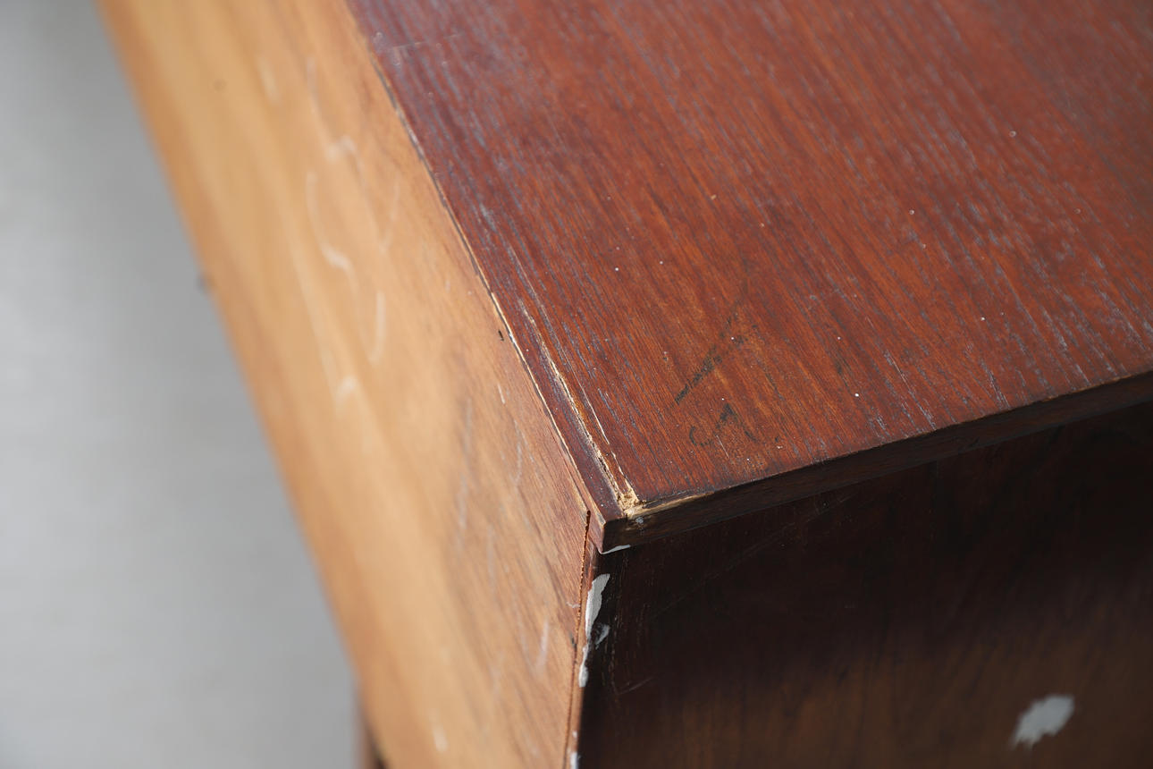 various marks and scratches and areas of colour loss to the top, small chip to the side at the bottom, small splashes of paint on the other end, left hand back corner of the top has had a small repair to the wood.