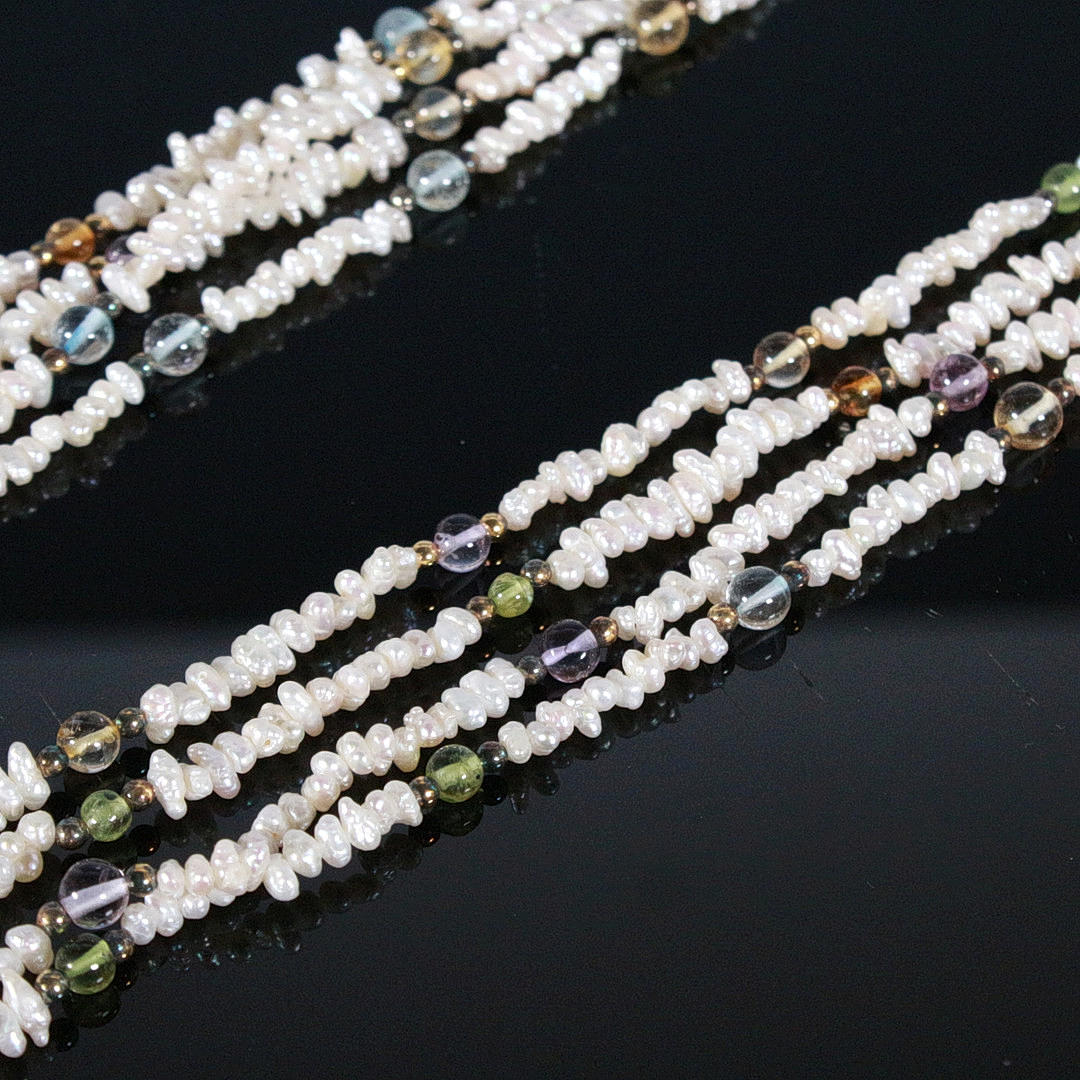 4-row necklace with small rice beads and plastic balls.