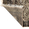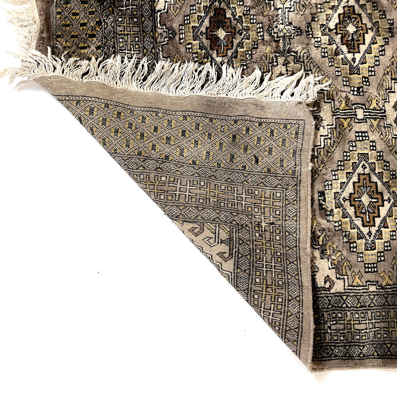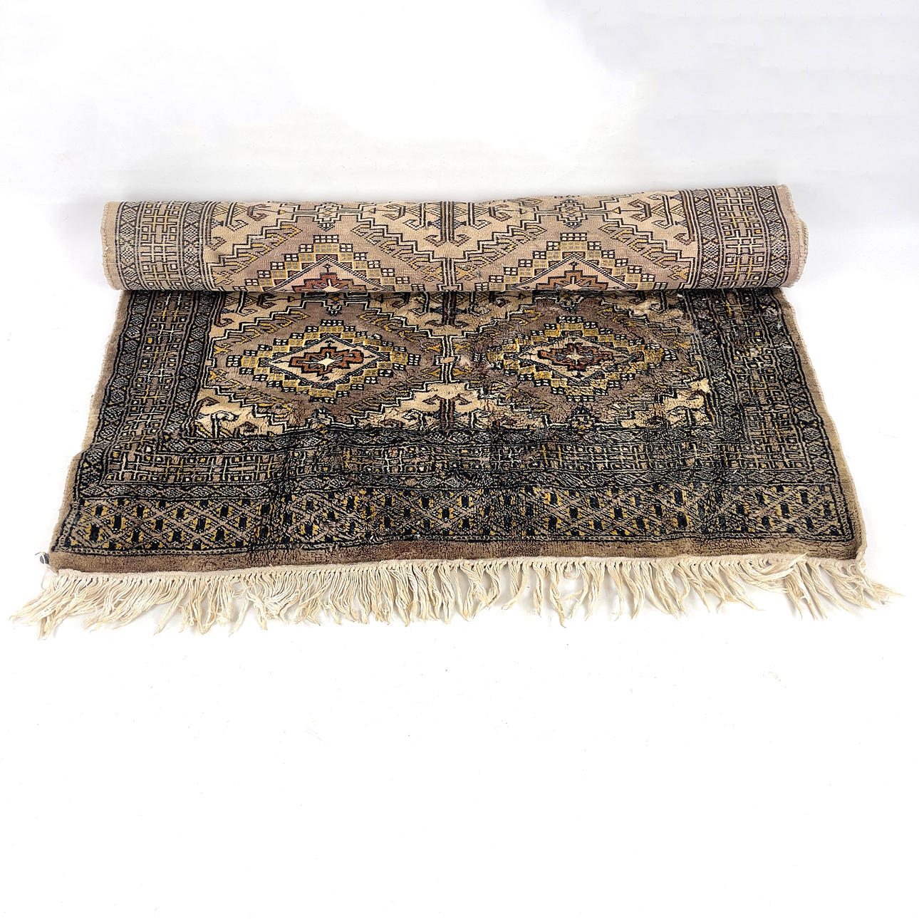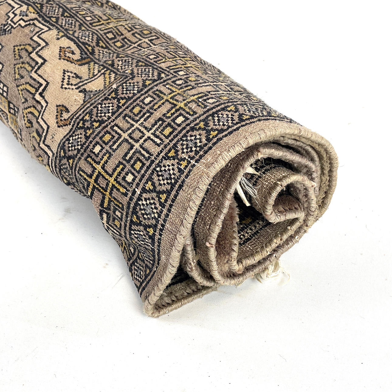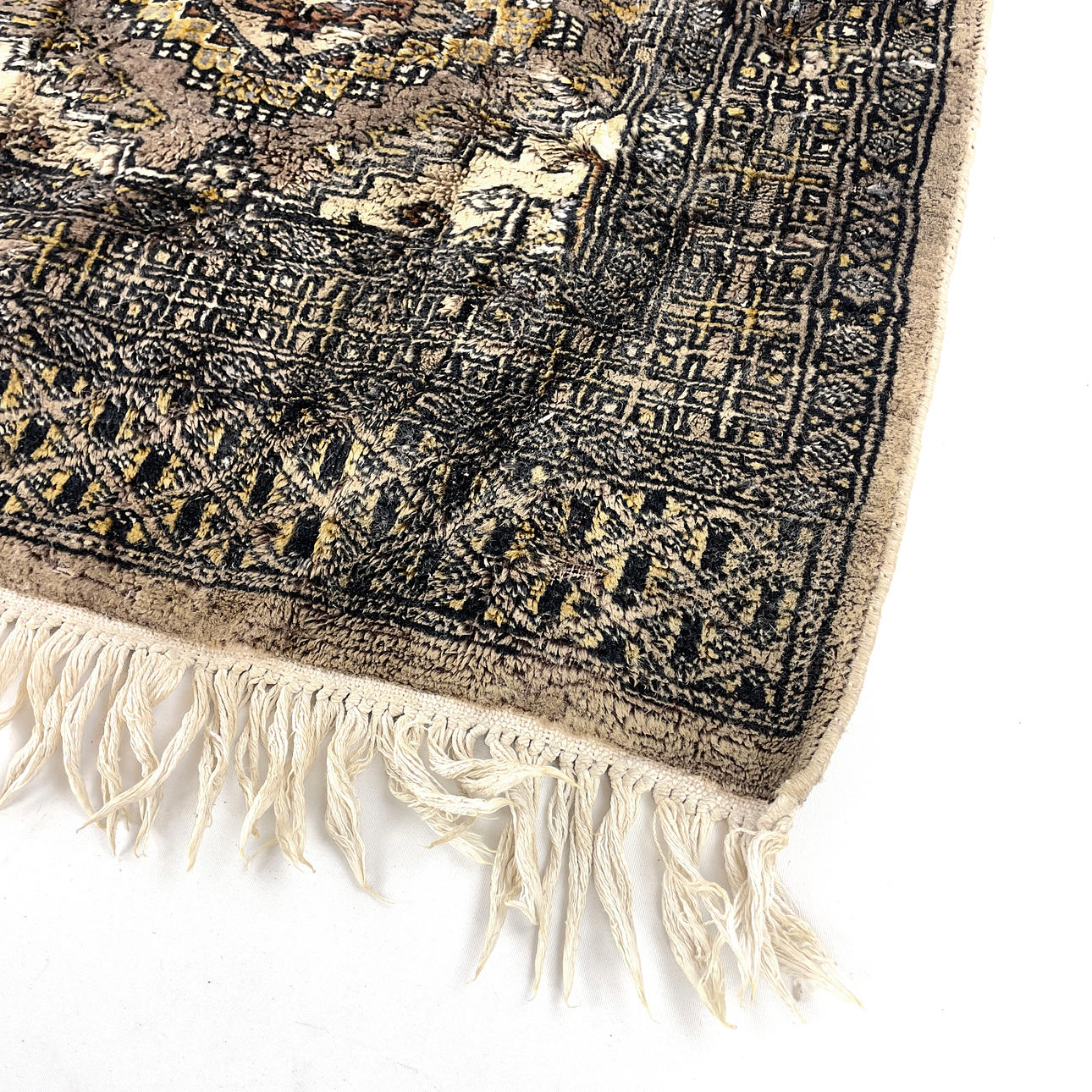 Geometric pattern in black, blue and yellow against brown background. Dimensions: approx. 91 x 140 cm.
