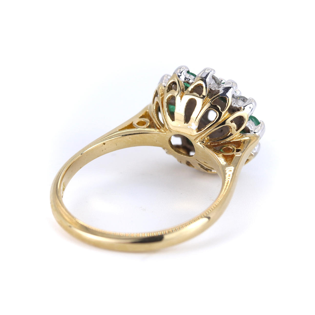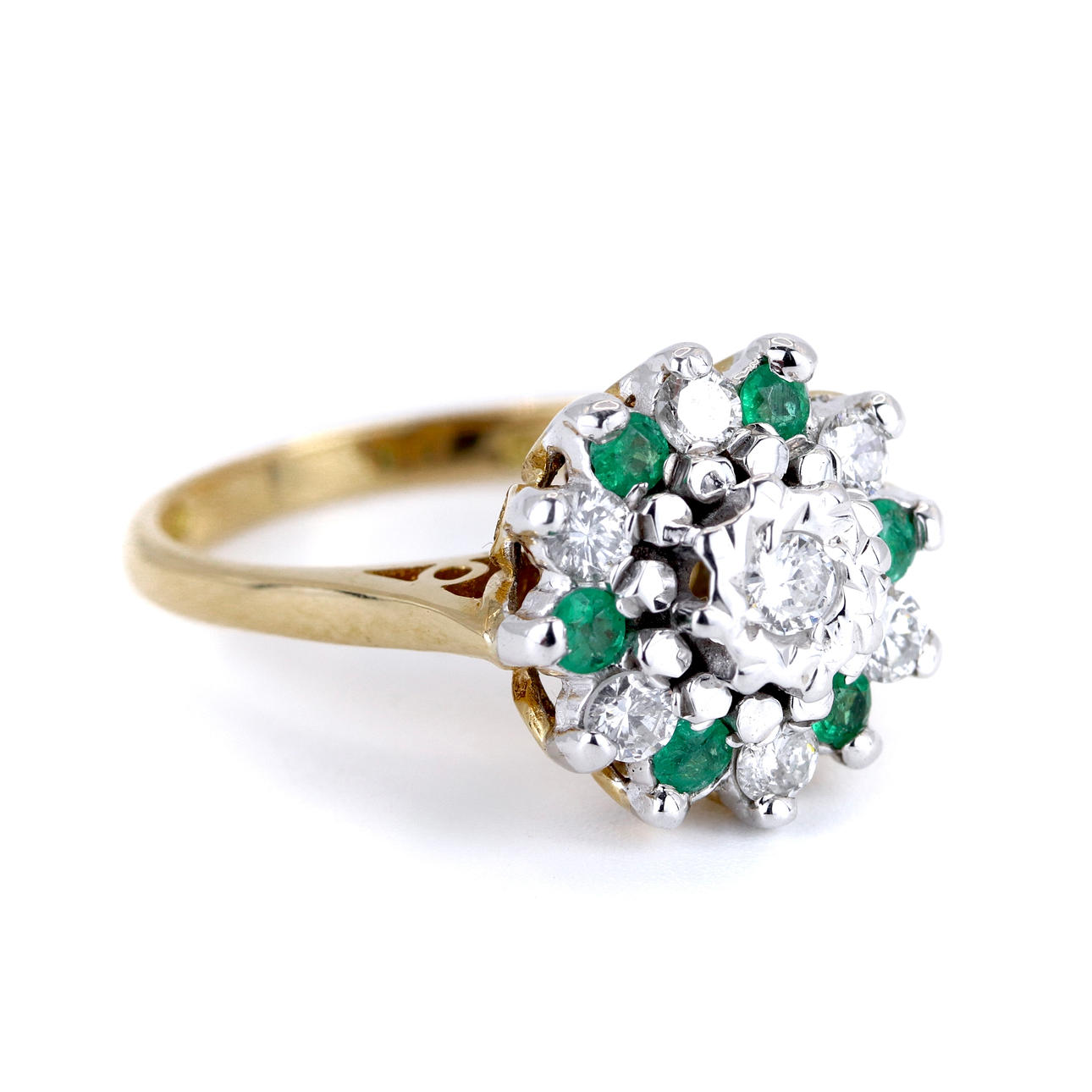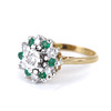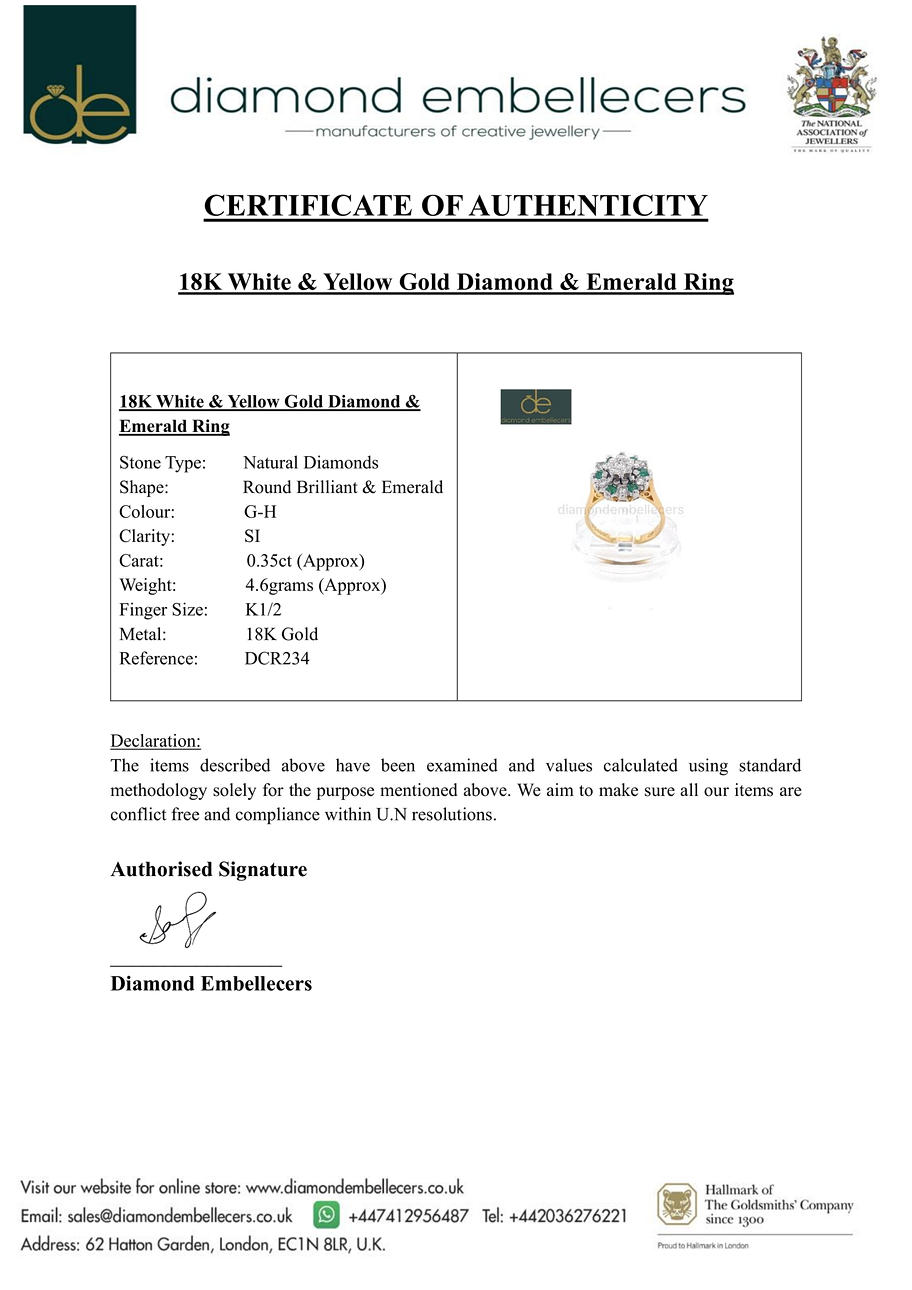 An 18ct white and yellow gold cluster ring set with emeralds and diamonds. Dia total 0.35ct approx. Colour: G-H. Clarity: SI.