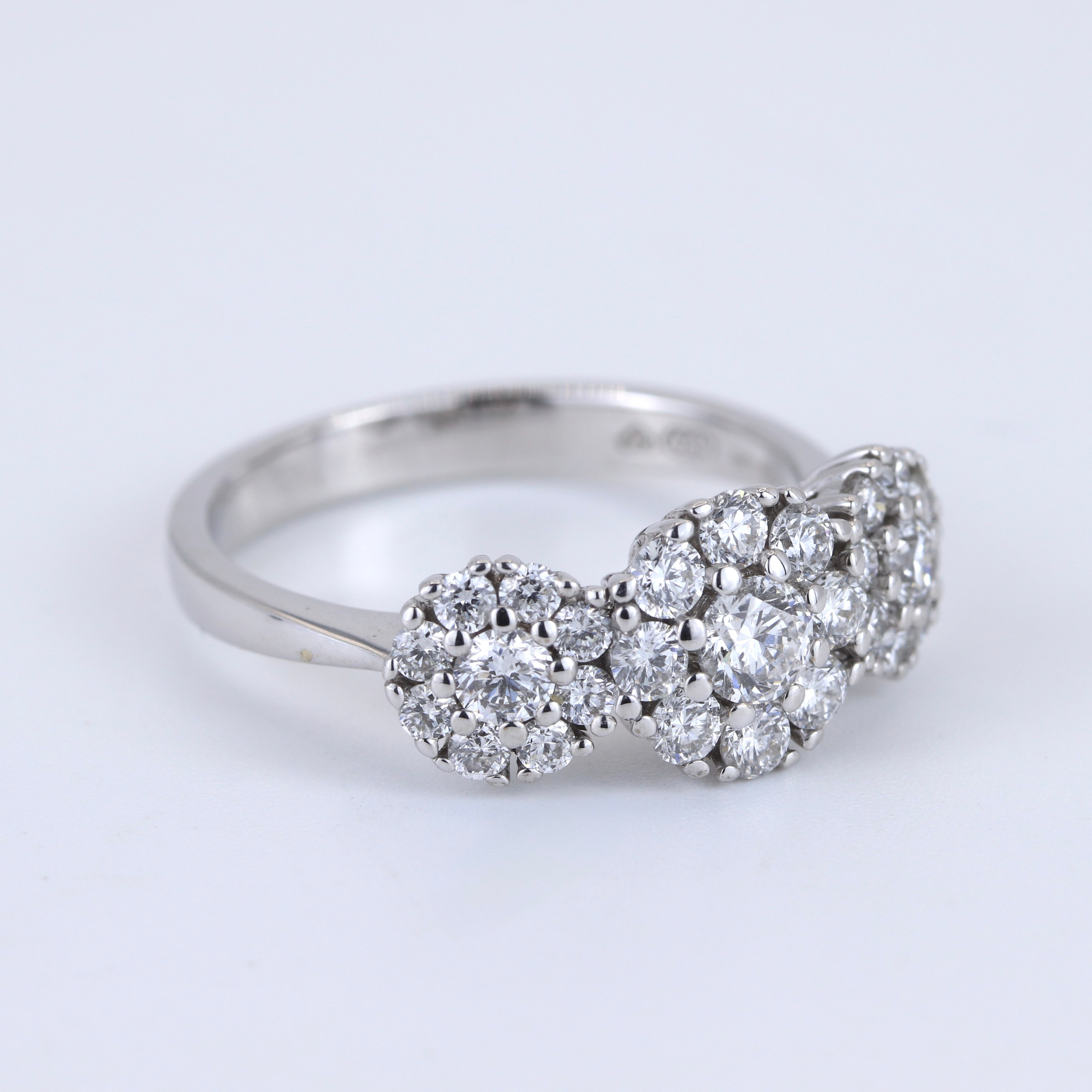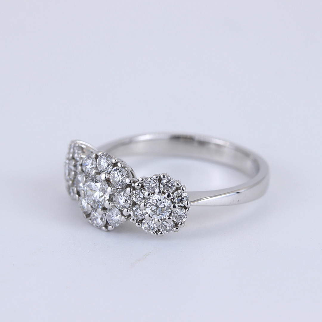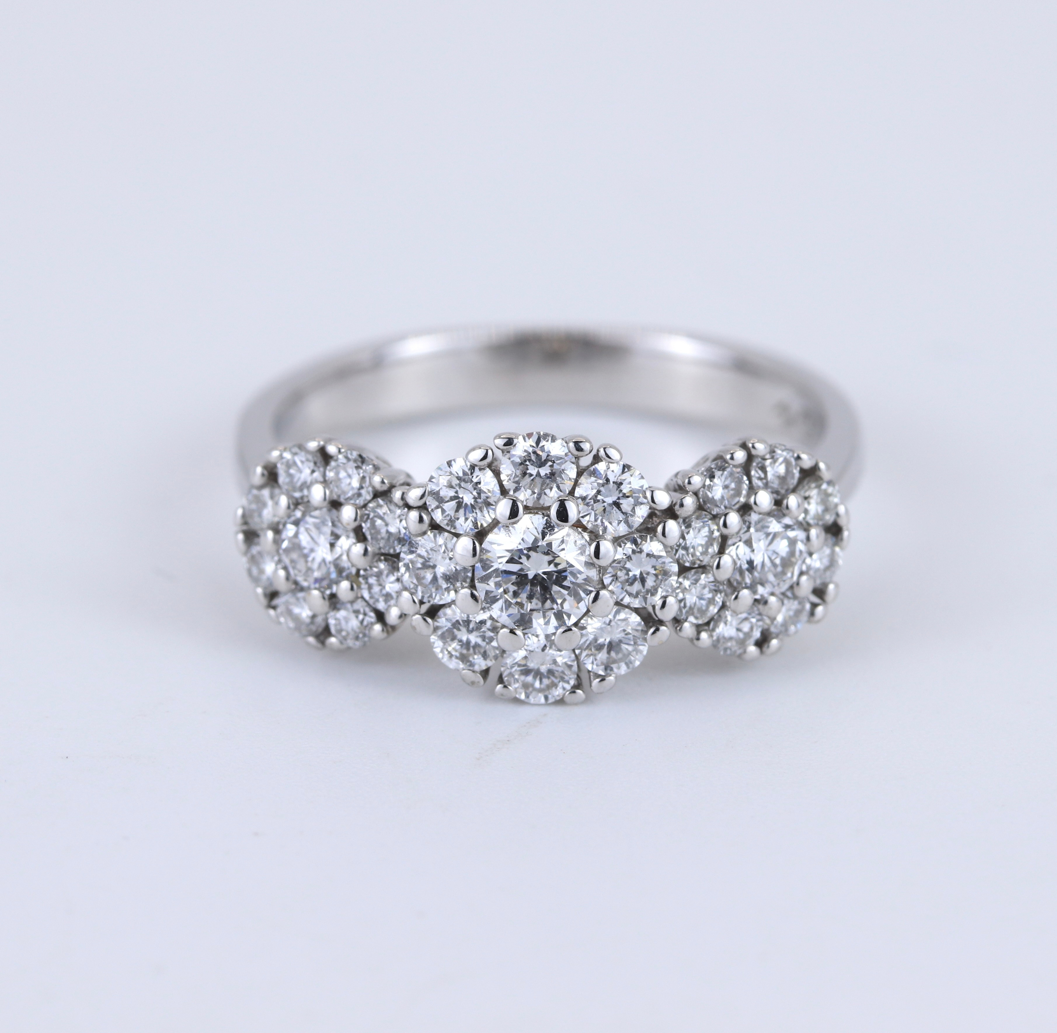 4904059. 18CT WHITE GOLD DIAMOND SET THREE CLUSTER RING.