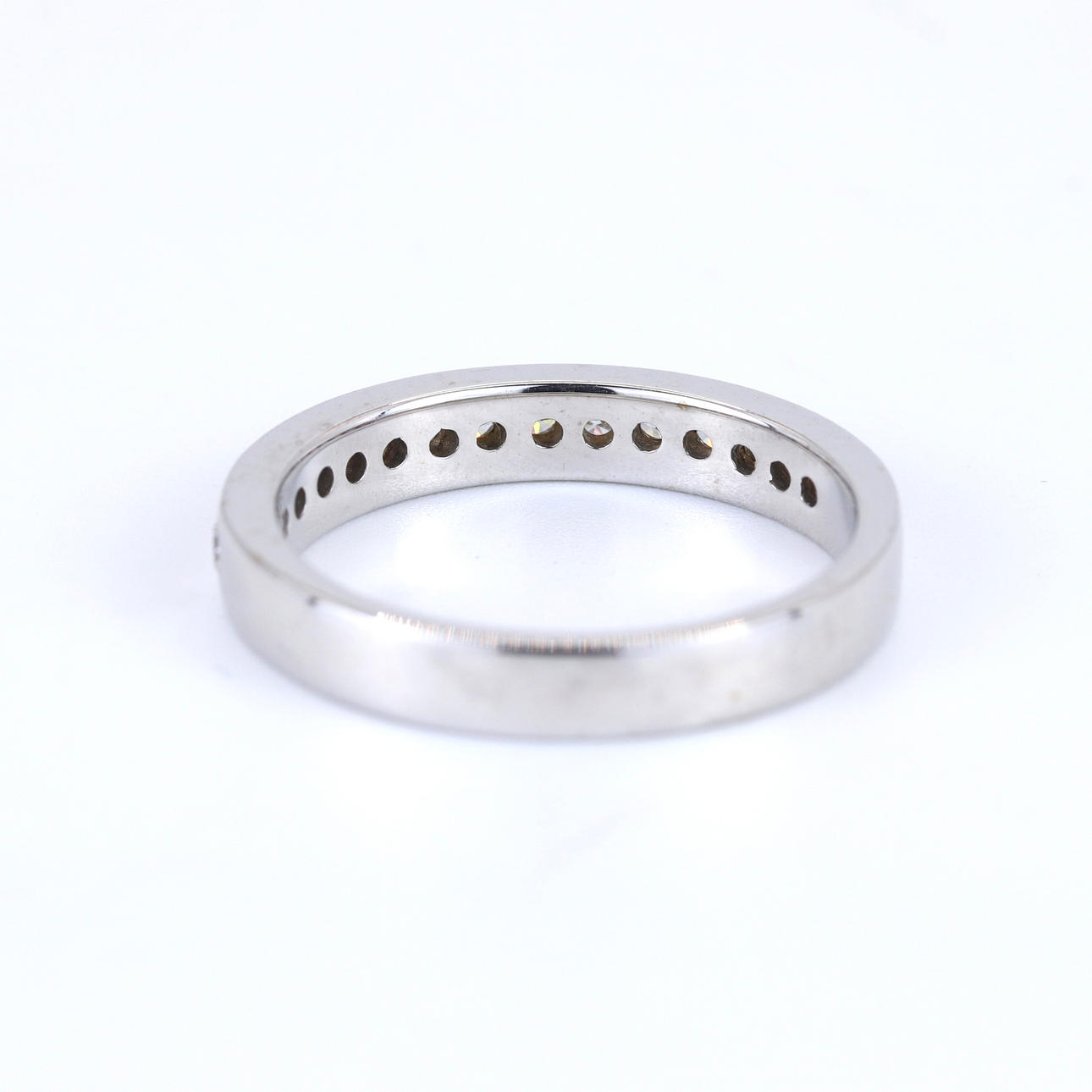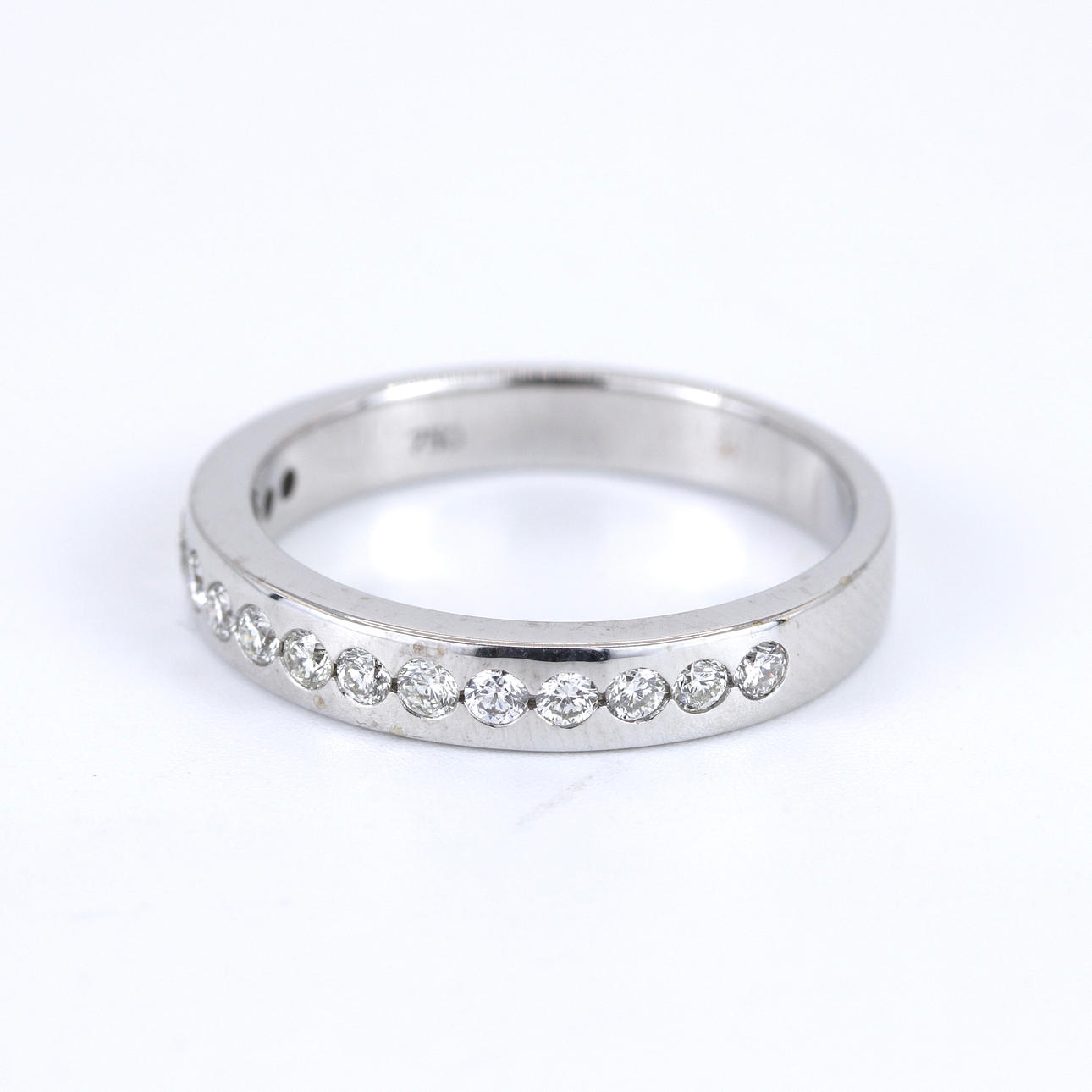 An 18ct white gold half eternity ring set with diamonds. Dia. total: 0.15ct approx. Colour: G-H. Clarity: SI. UK ring size: M.