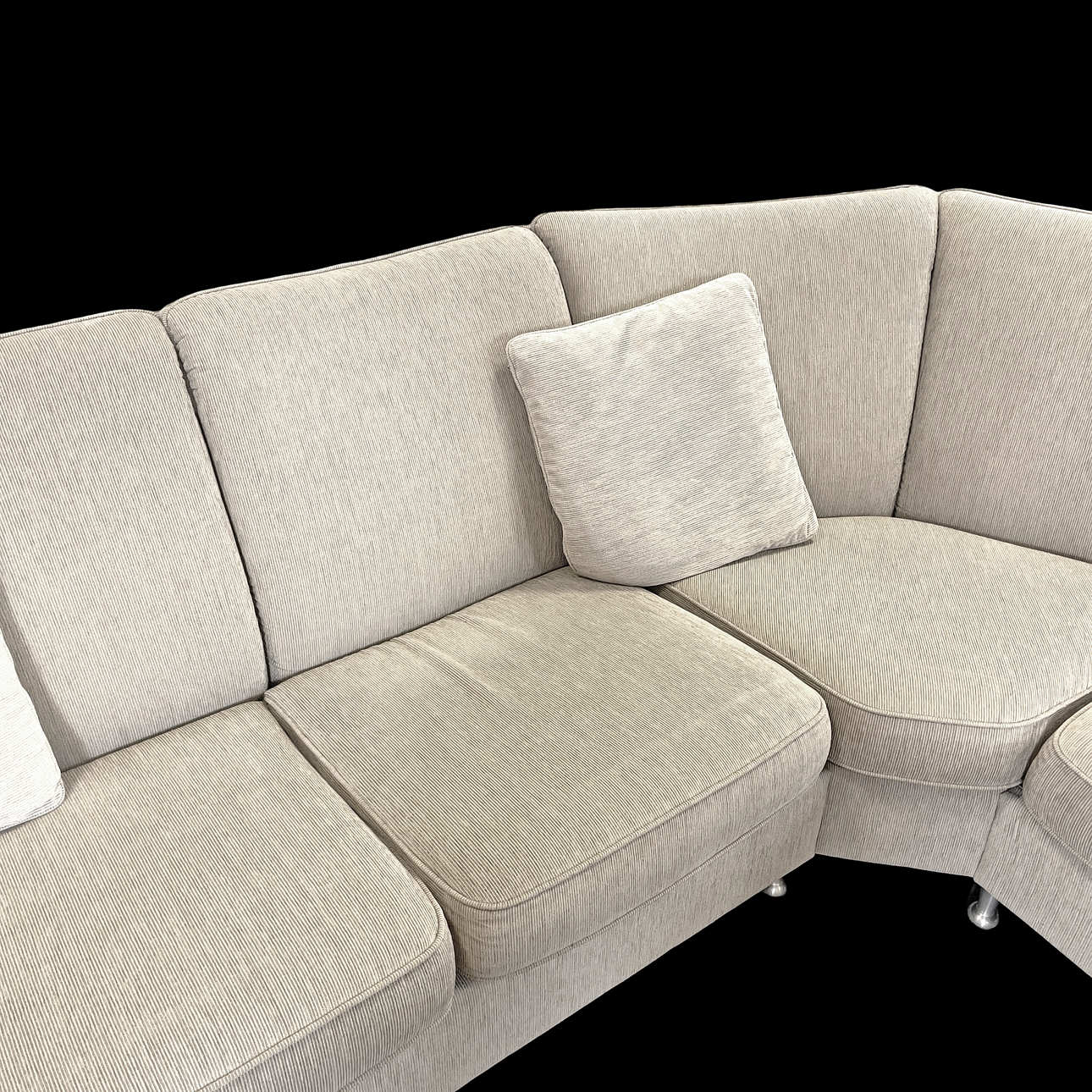Beige plush fabric, metal feet, solid back cushions, loose seat cushions as well as four decorative pillows,
