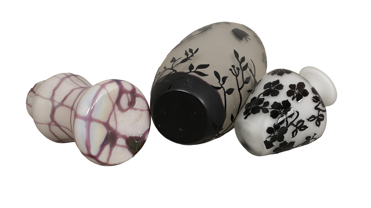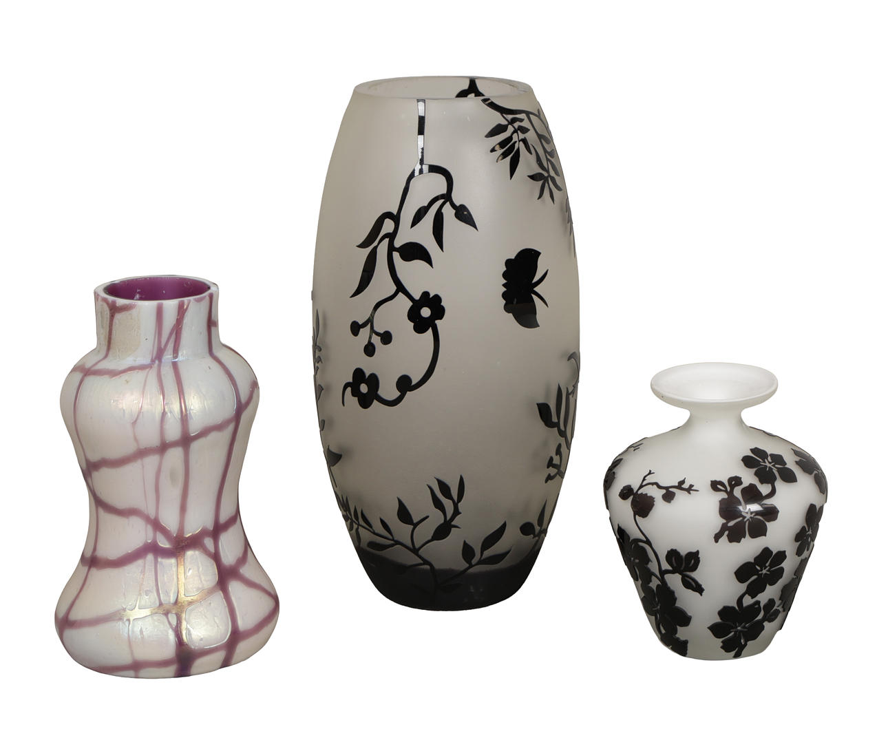 To include a Kralik pink and white glass vase, 14cm height, a cameo vase with bird decoration, 20cm height, and a small white floral decoration cameo vase, 10.5cm height. (3).