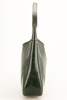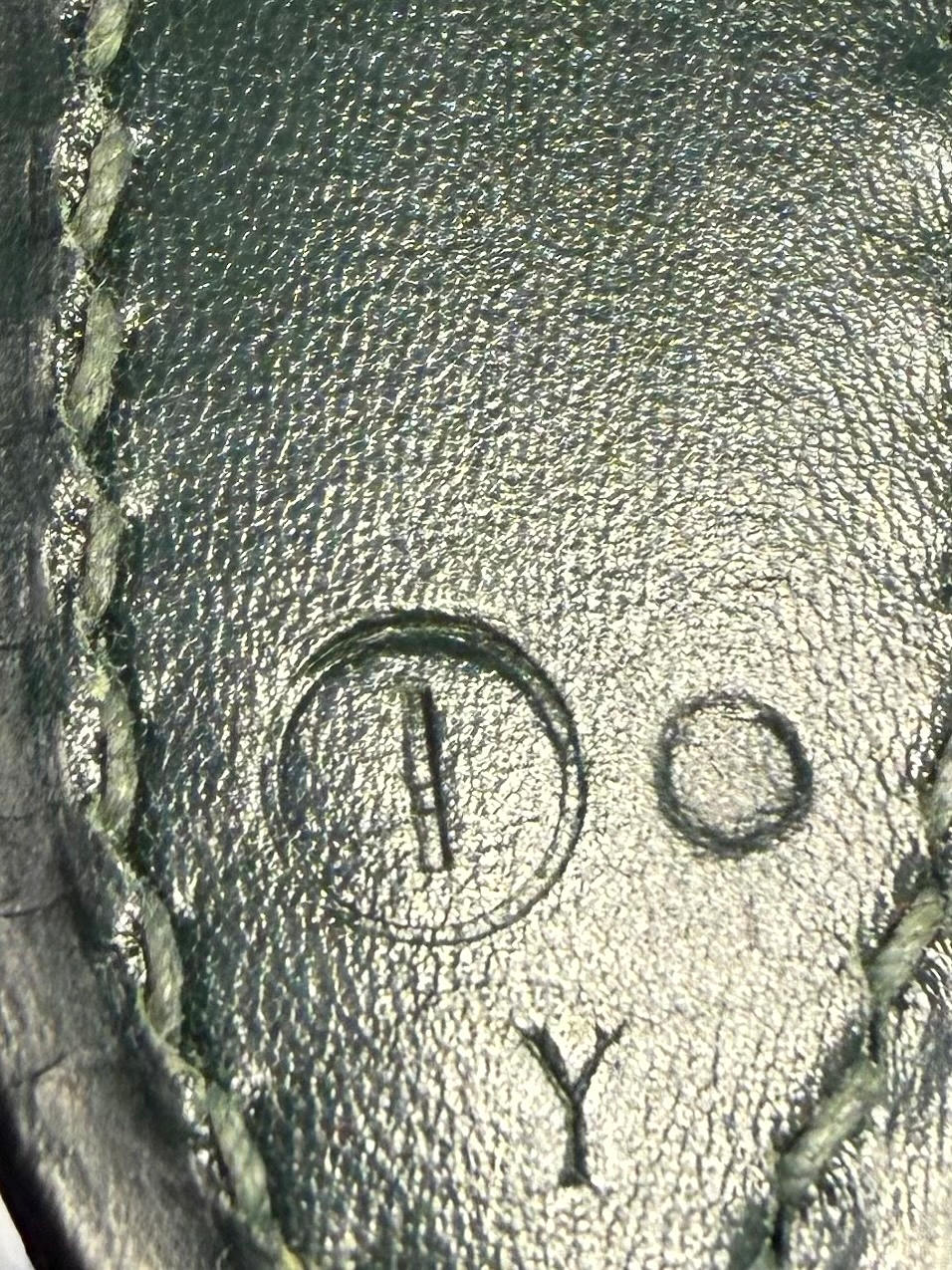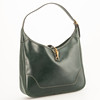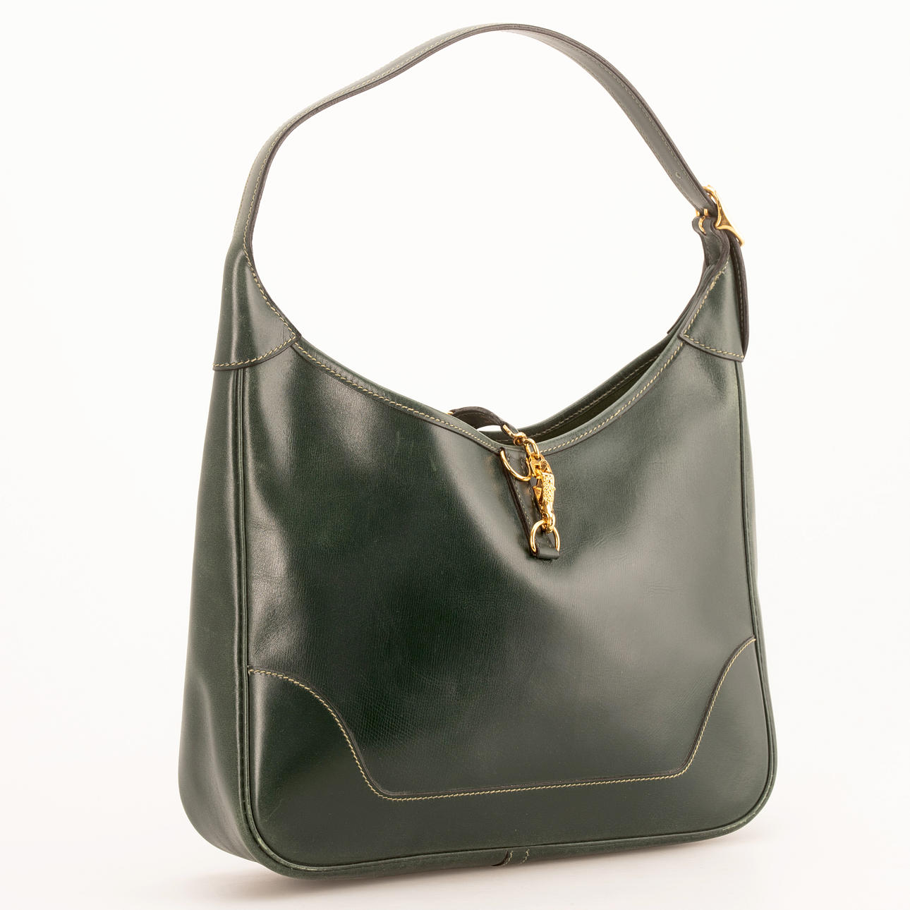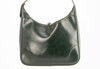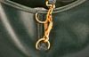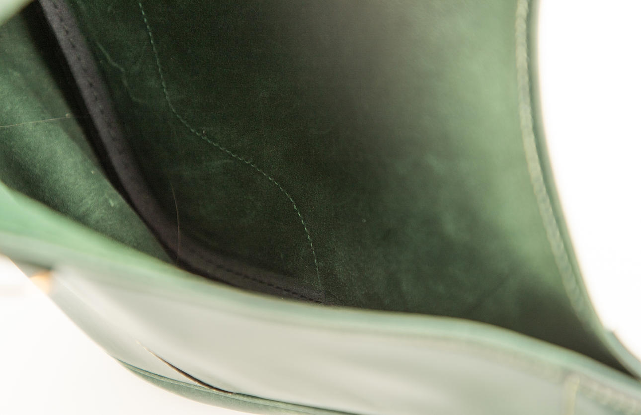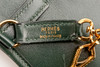 Olive green box leather with gold-colored hardware. Adjustable shoulder strap