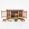 Damage and repairs, wear and tear, material loss, front door with a broken hinge, probably missing some animals from the collection, loose wheels included.