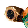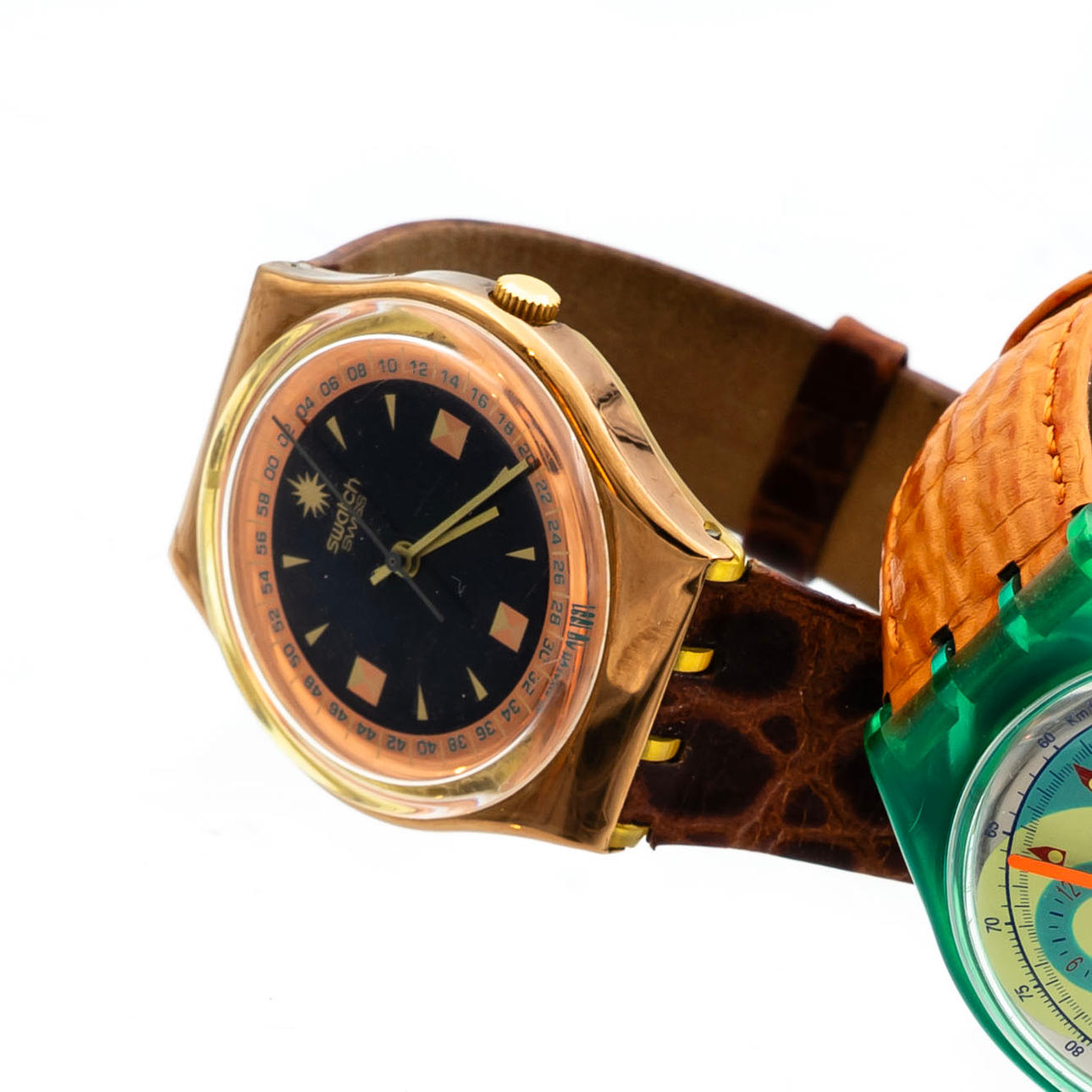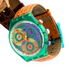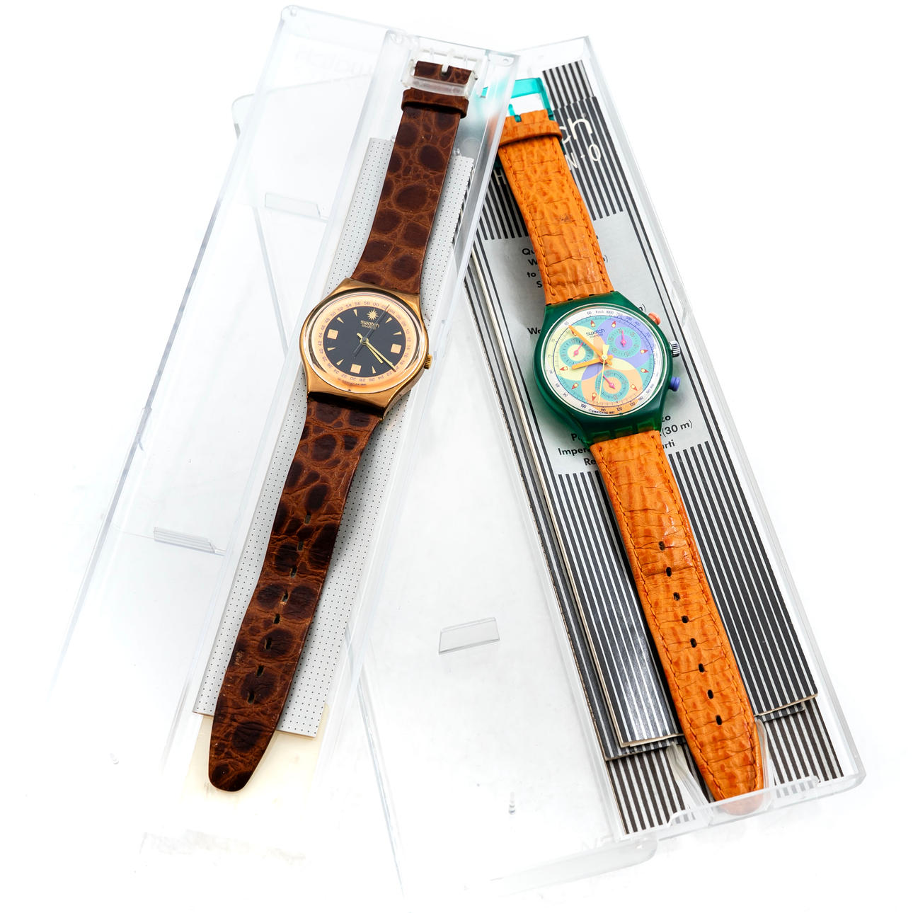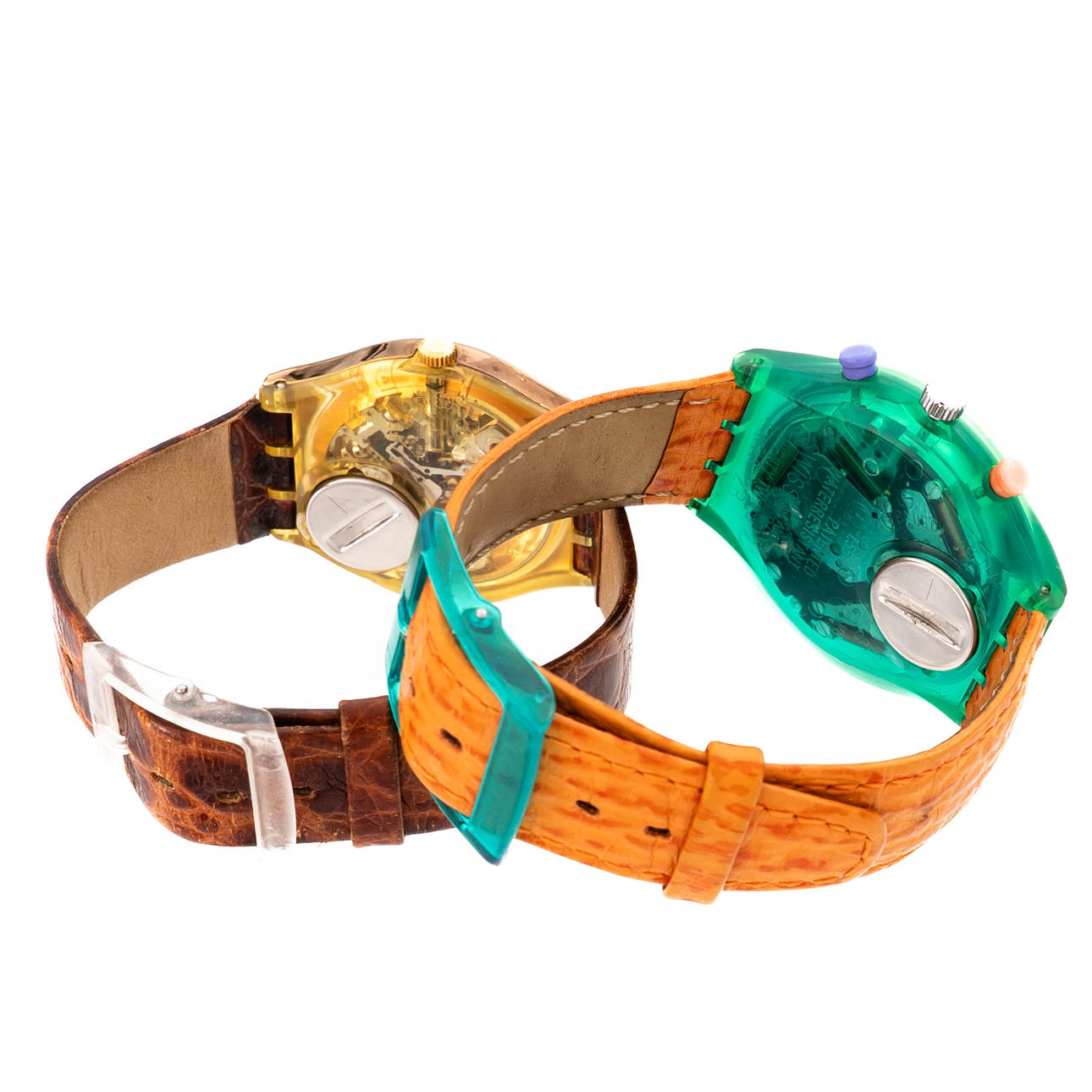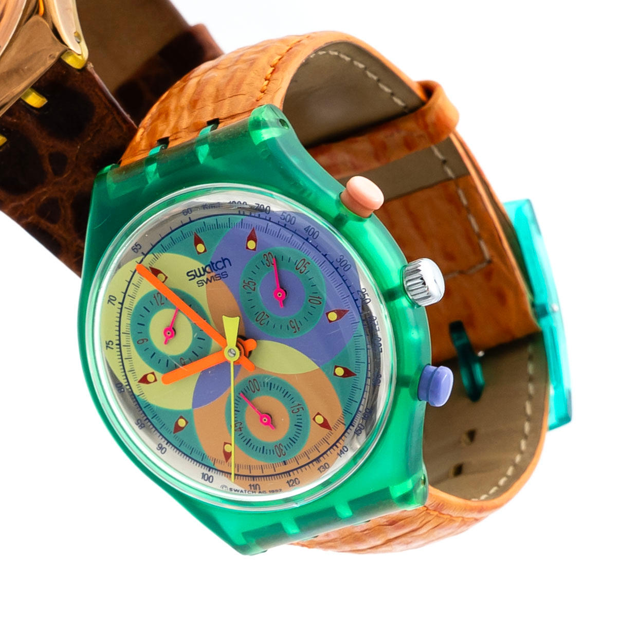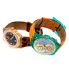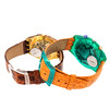 Light green with orange leather, plastic clasp. Dark brown with dark brown leather, plastic clasp.