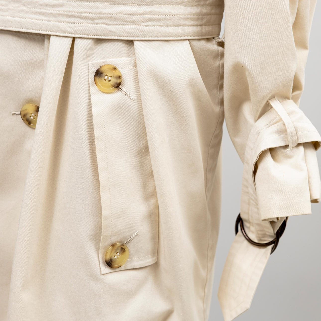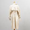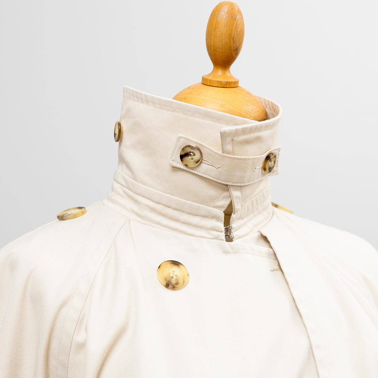 beige cotton poplin, double buttoned with yoke on one side and back, two pockets, shoulder straps. Fully lined with white acetate. Label marked “CELINE PARIS MARQUE DEPOSE MADE IN FRANCE”.