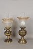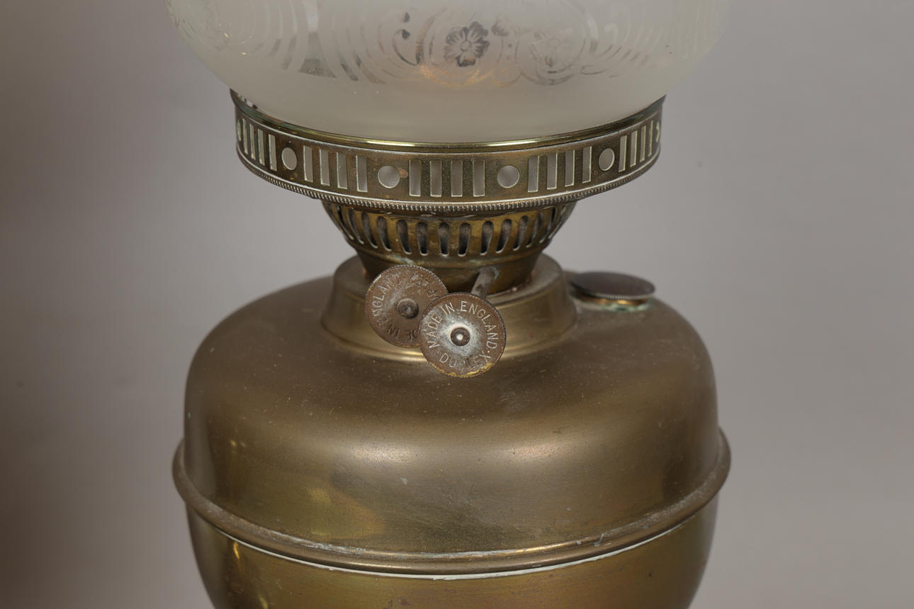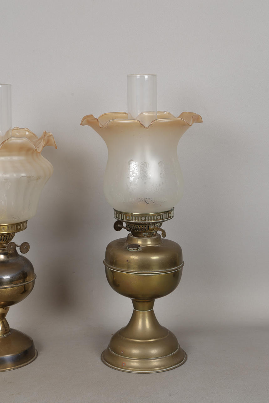 The early 20th Century brass oil lamps with glass shades, one marked 'Duplex Made In England', the tallest measuring 49.5cm. (2).