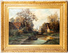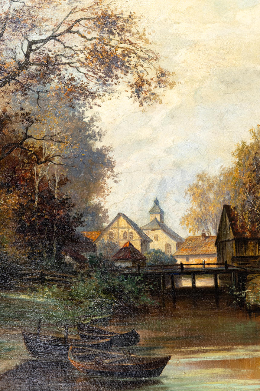G. C. Ein-Ecke, village landscape with river, oil on canvas, early 20th century, signed, c. 71 x 100 cm, with stucco frame approx. 99 x 128 cm.