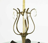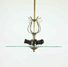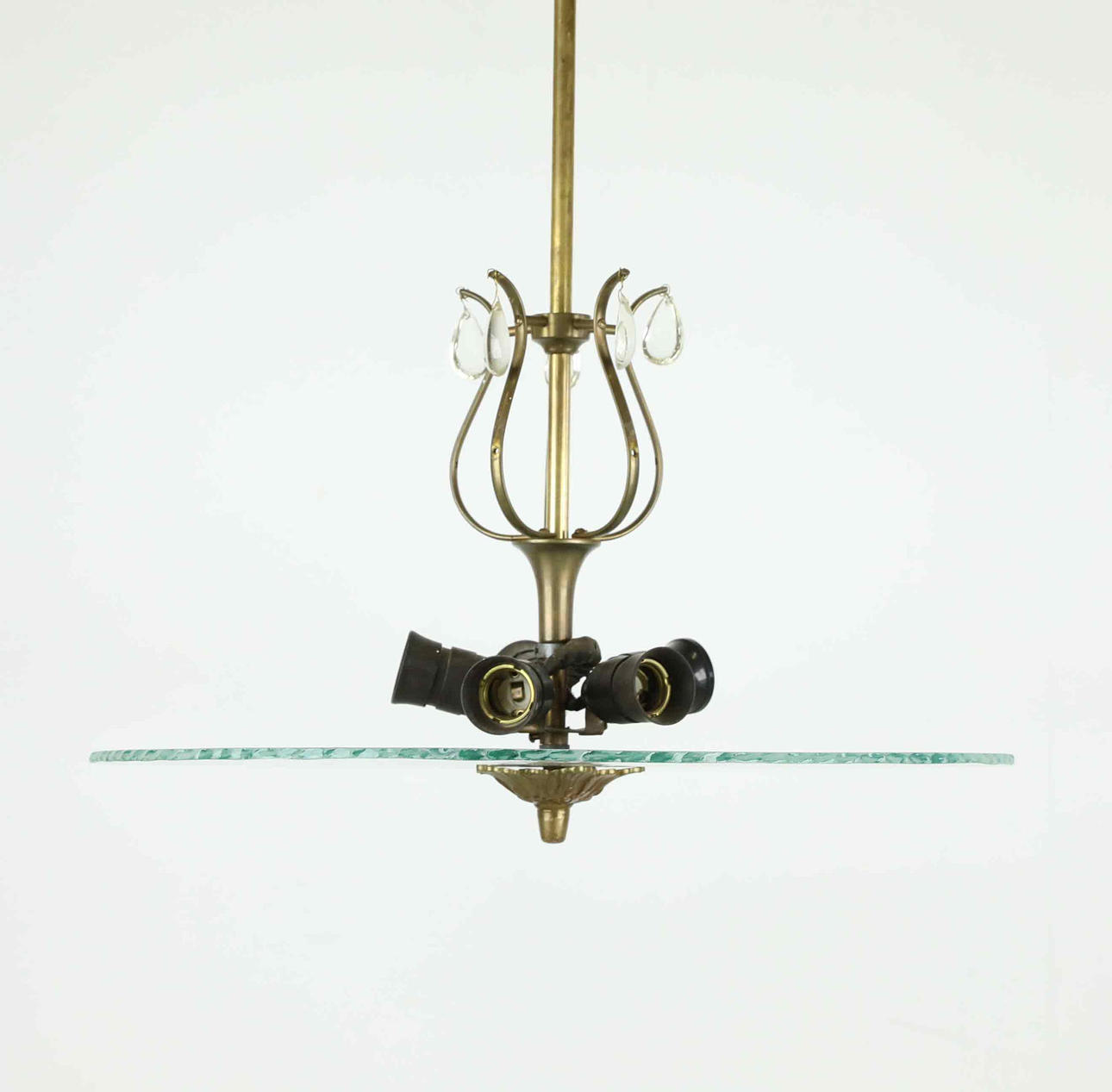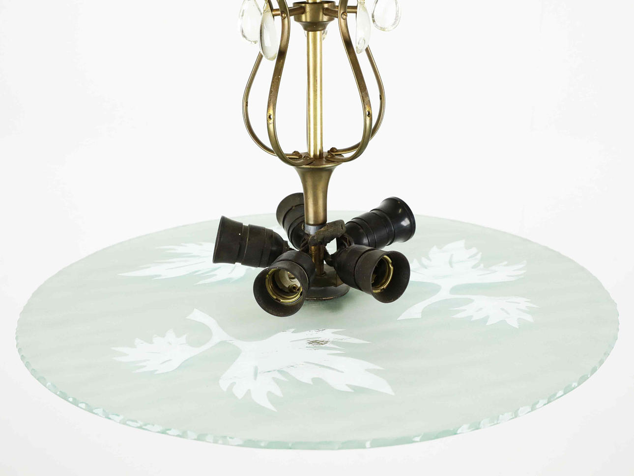 5 light sources on a frame of patinated metal, raw glass-disc with estad decoration in the form of leaves, prisms.