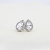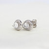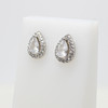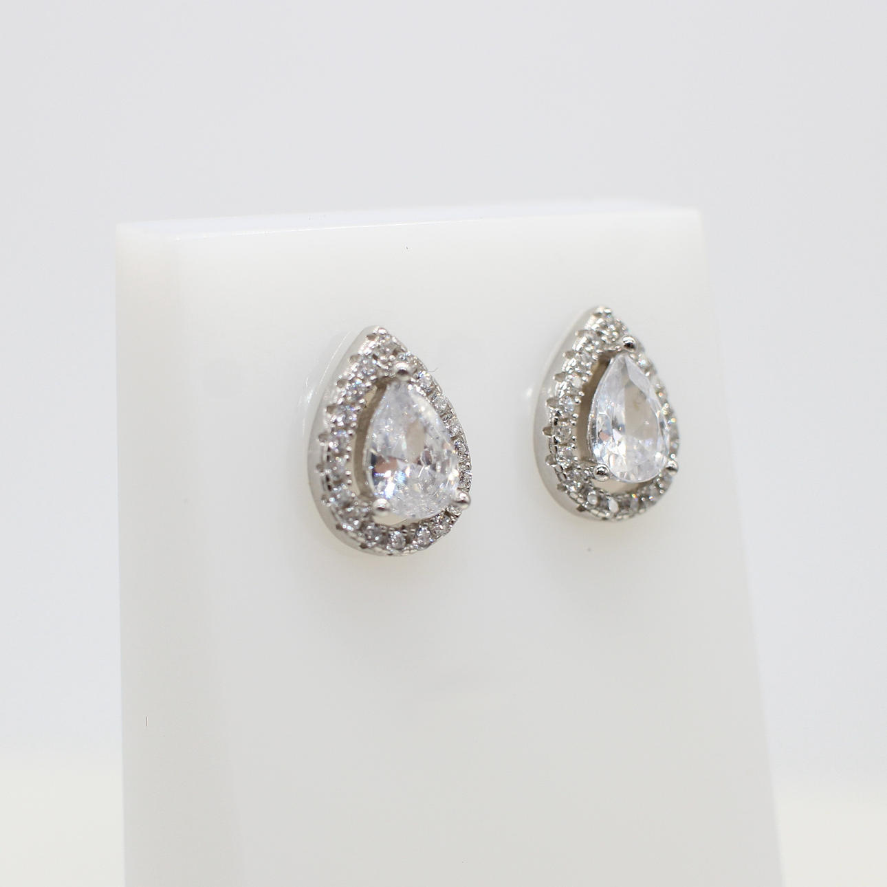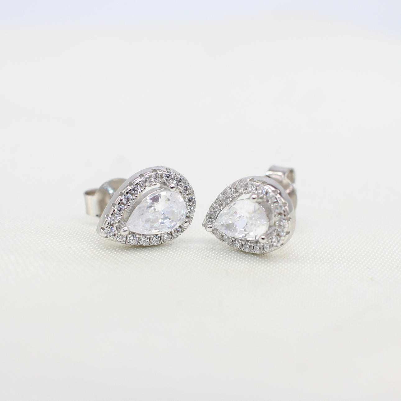 A pair of pear-shaped clear cubic zirconia ear studs with a halo of clear cubic zirconia in silver (stamped "925").