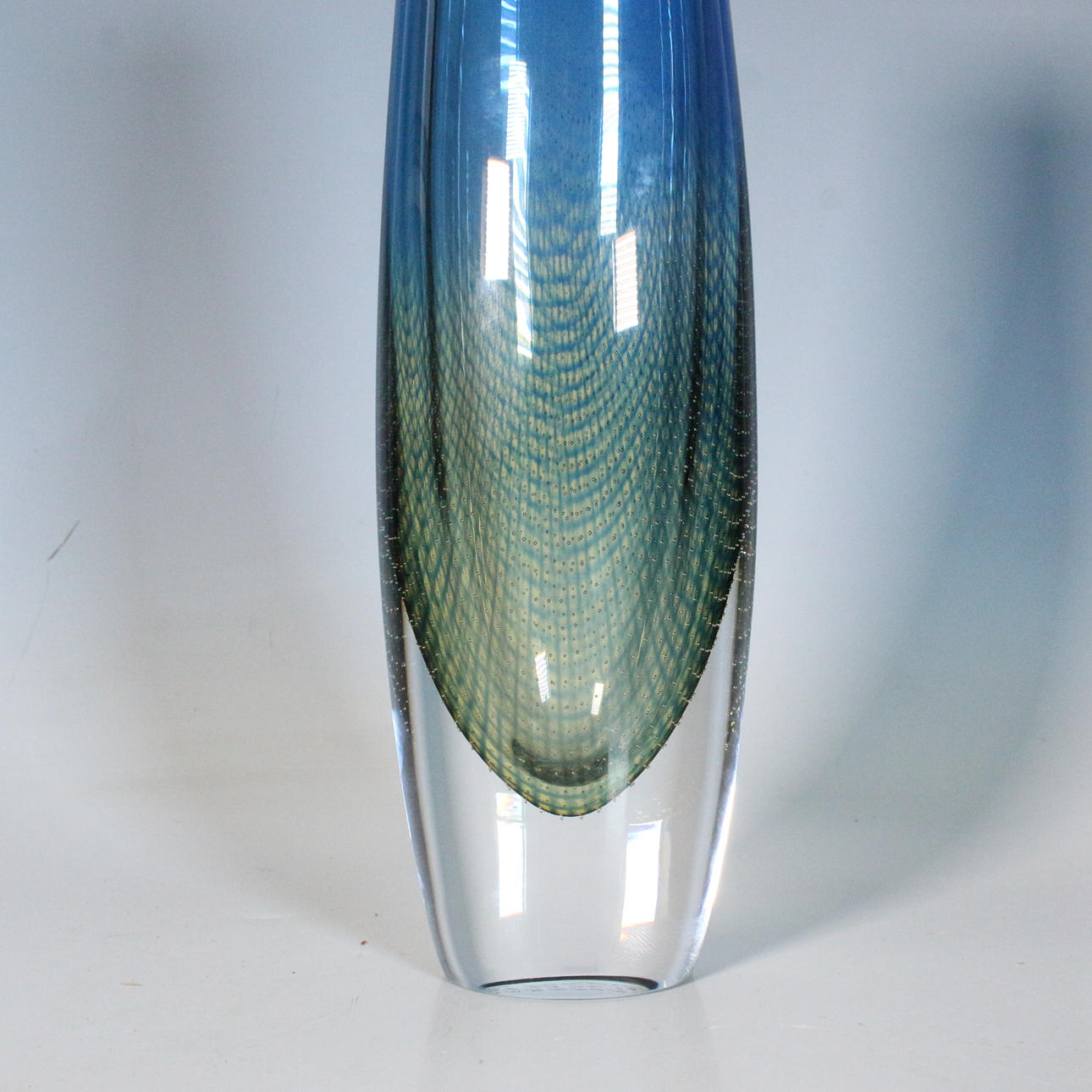 Clear glass with accompanying decoration of air bubbles and undertones in blue and yellow. Signed on the lower side, Orrefors no. 322.
