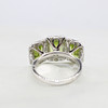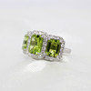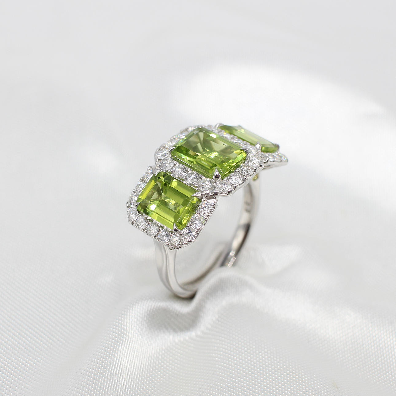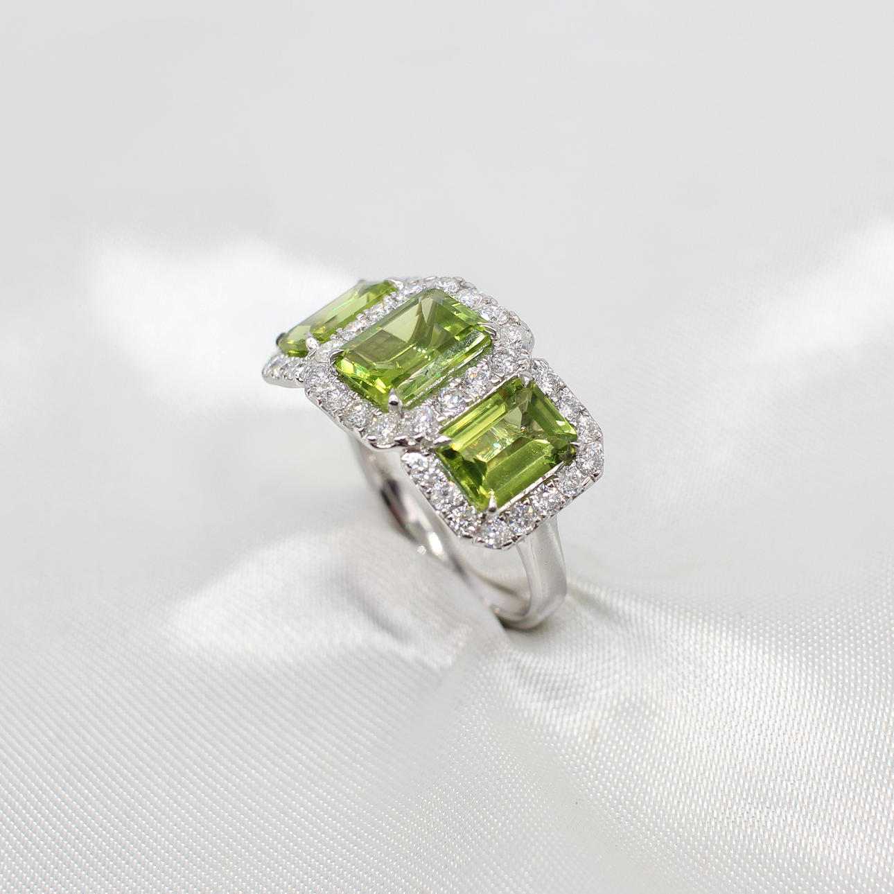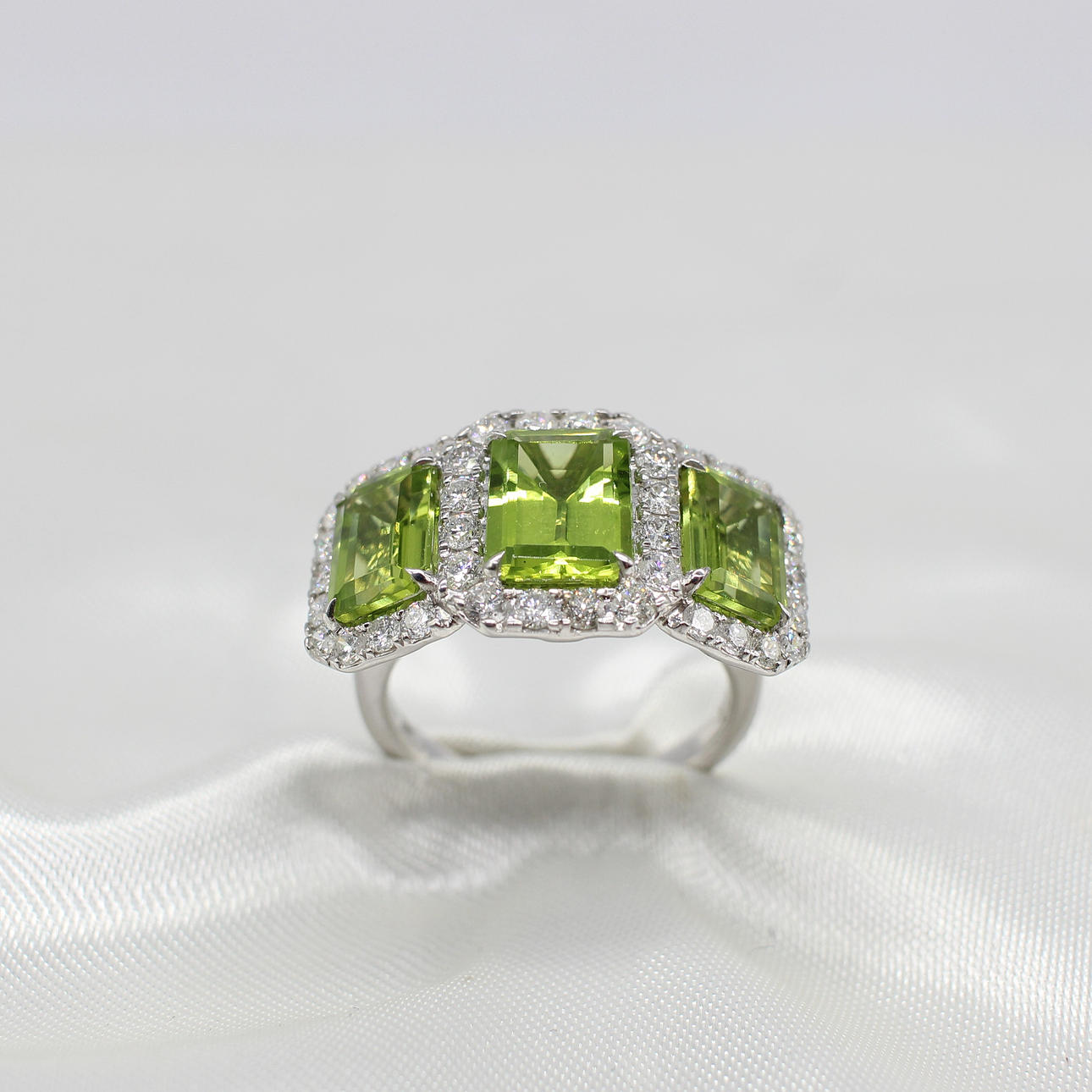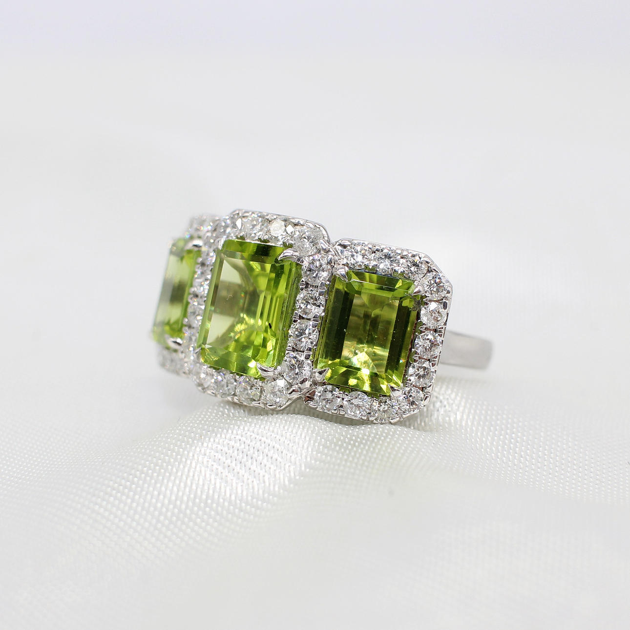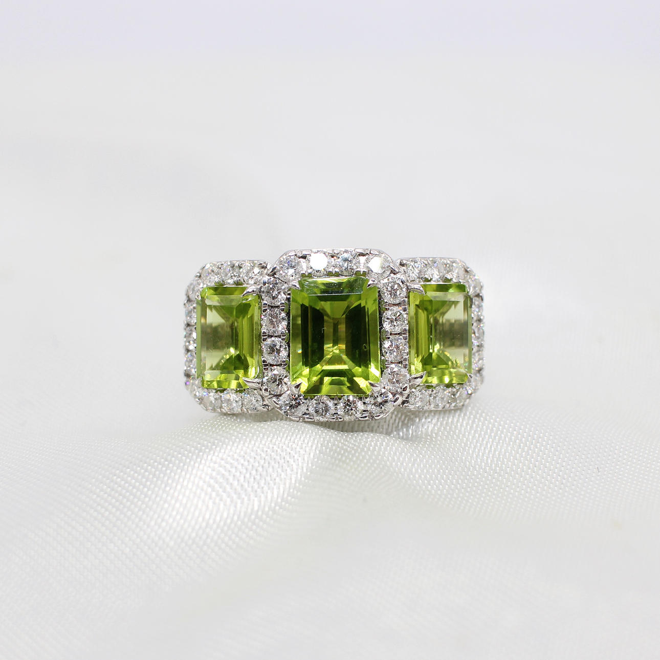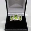 A Large, Impressive 9ct White Gold (Hallmarked) Trilogy Halo Ring Set With 3 x Graduated Emerald Cut Peridot's And Round Brilliant Cut Diamond Halo's