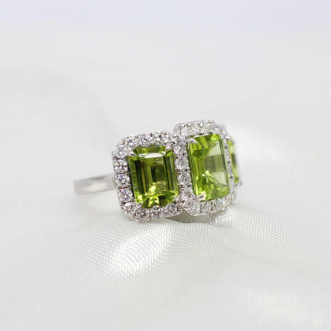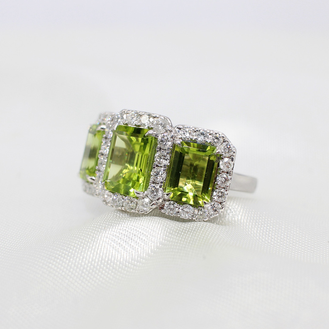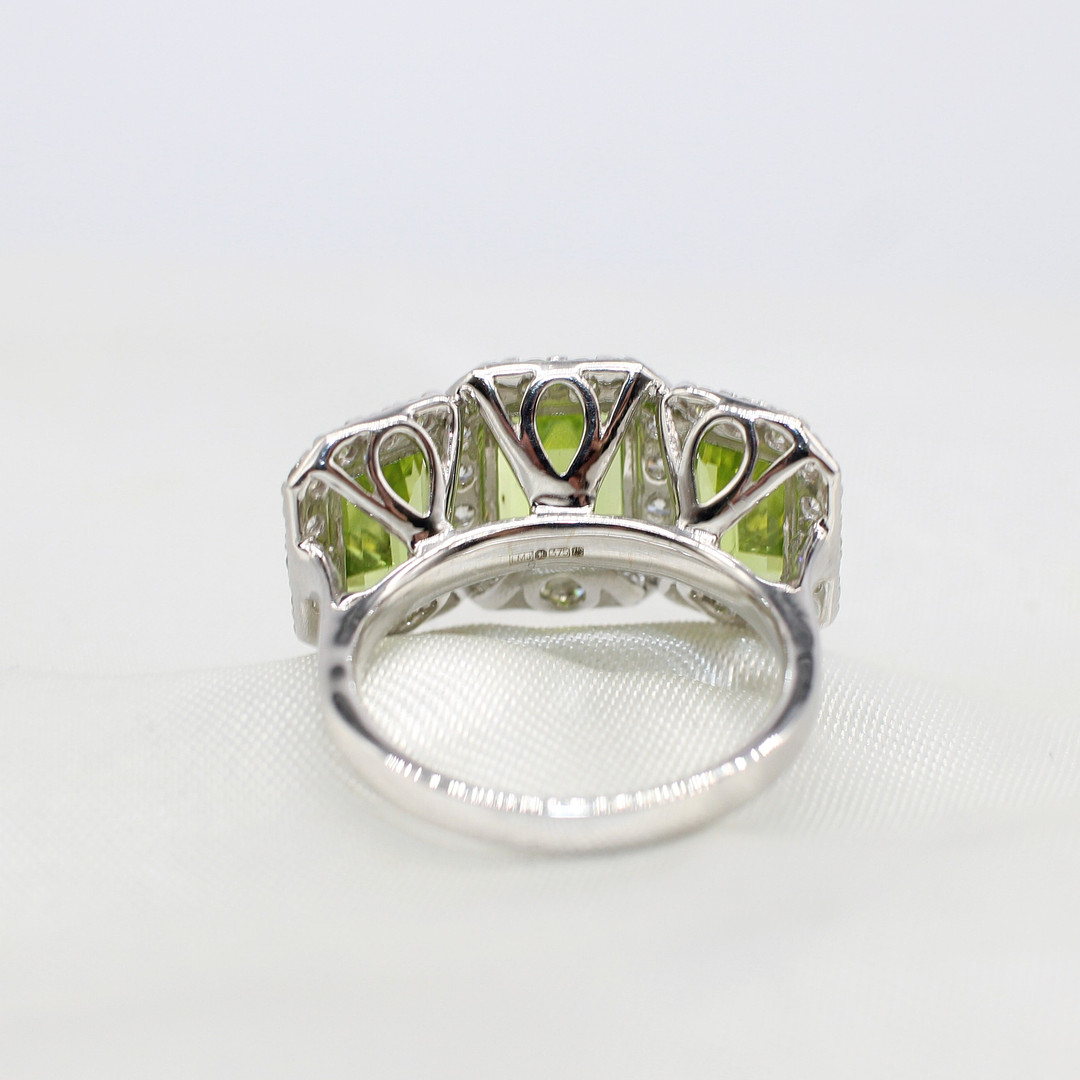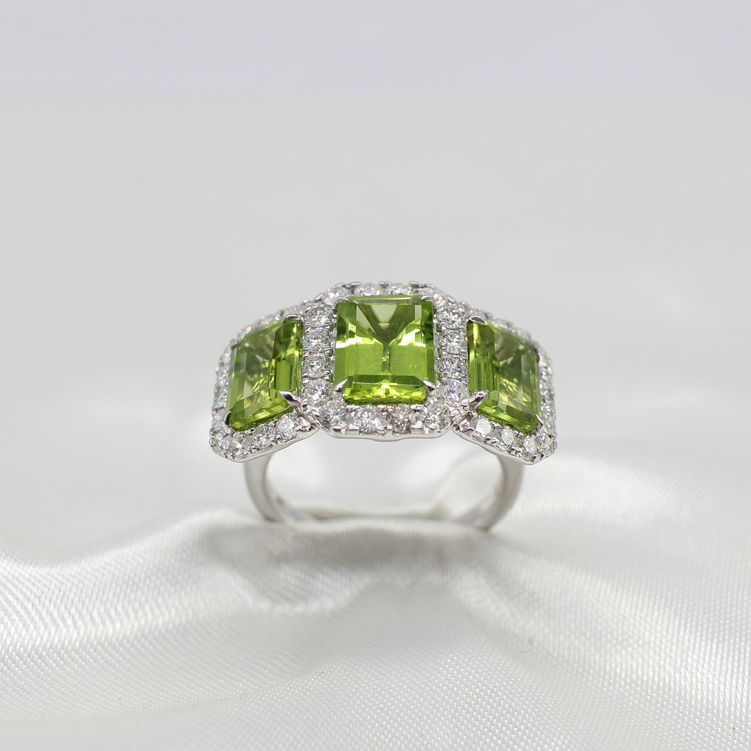4909221. LARGE PERIDOT & DIAMOND TRILOGY RING.