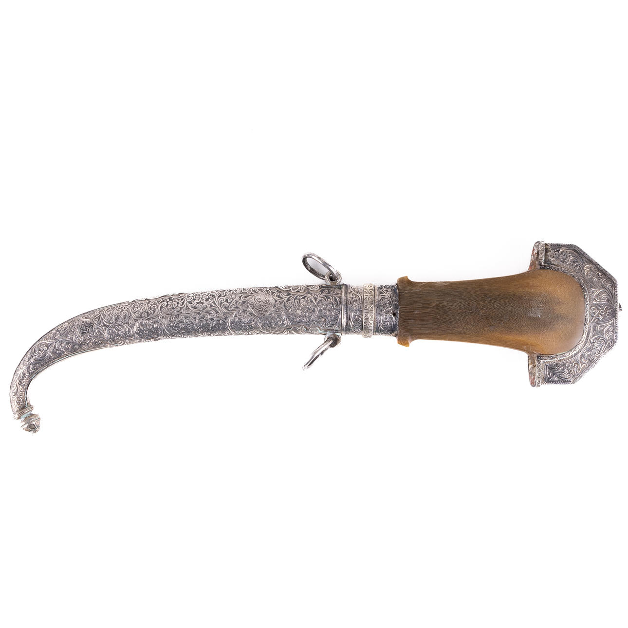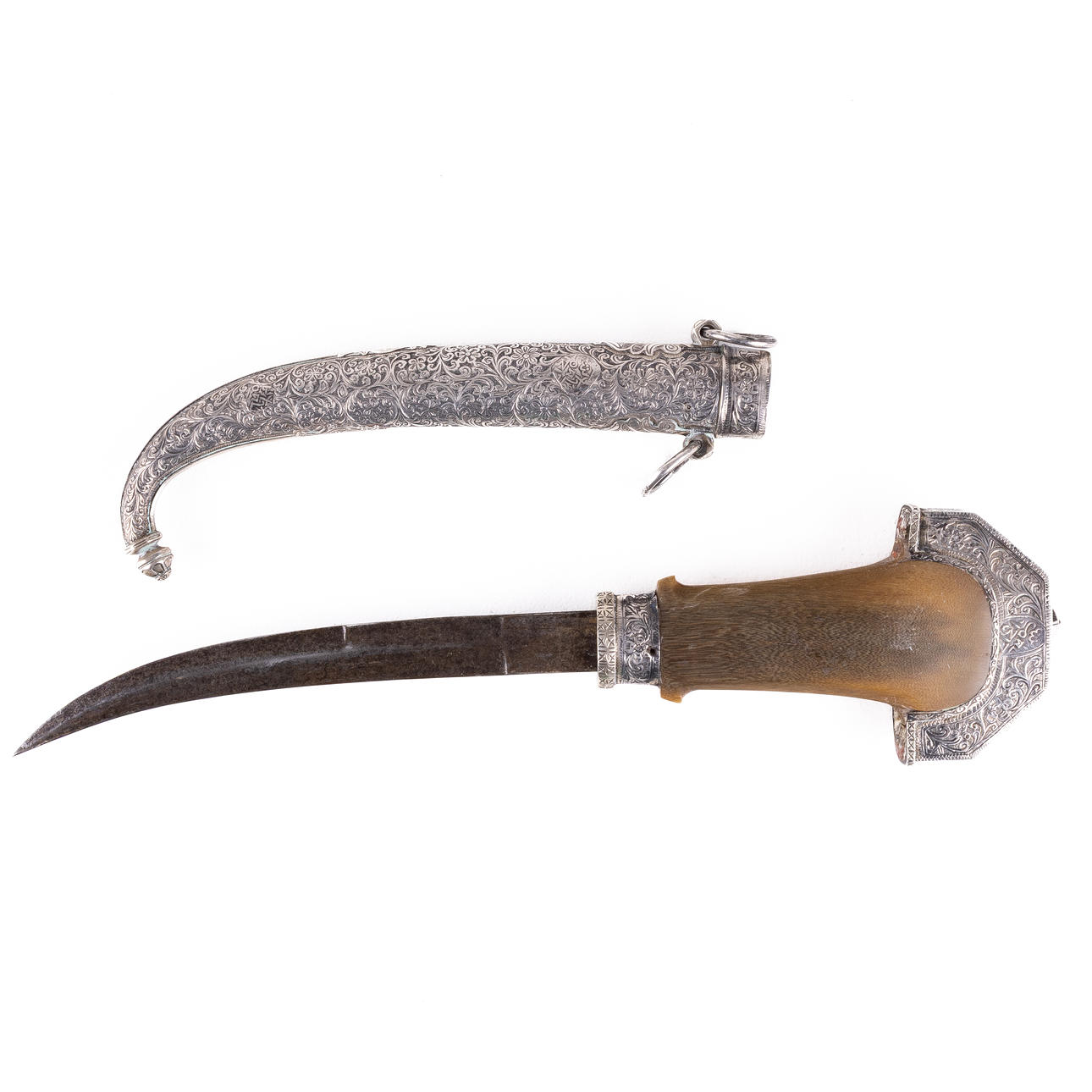 Cicillated decor in silver plate. Dated 1317 (year 1909 according to Western Times Census), stamped. Shank in horns. Length dagger 42 cm.