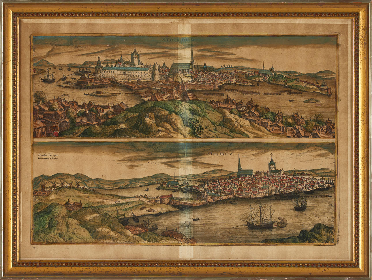 Georg Braun (1541-1622) /Frans Hogenberg (c. 1535-1590), engraved and hand-coloured city view of Stockholm, from “Civitates Orbis Terrarum”, Latin text (p. 38), c. 1590.