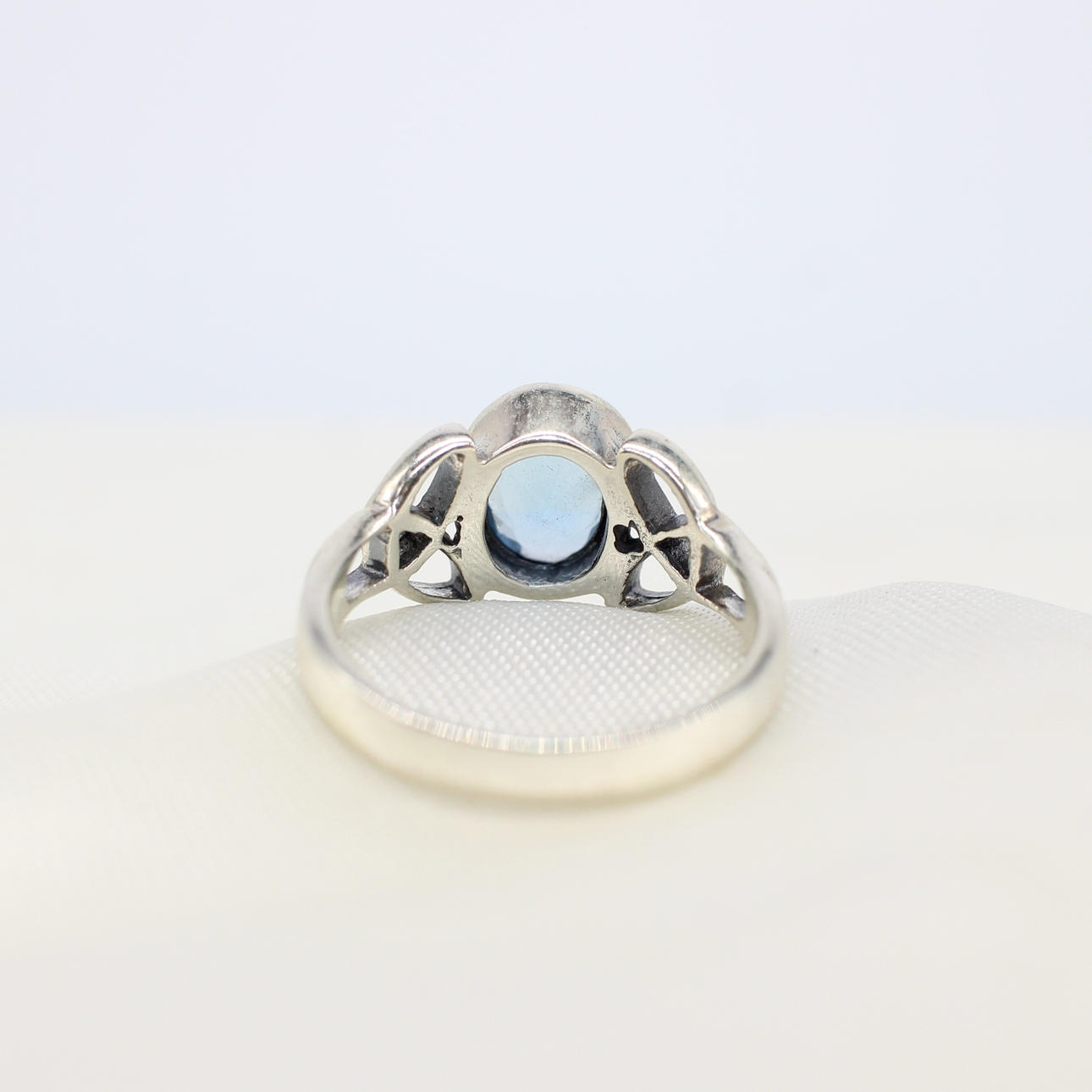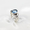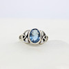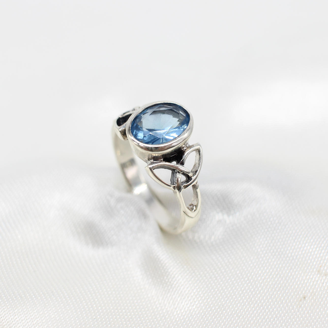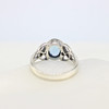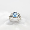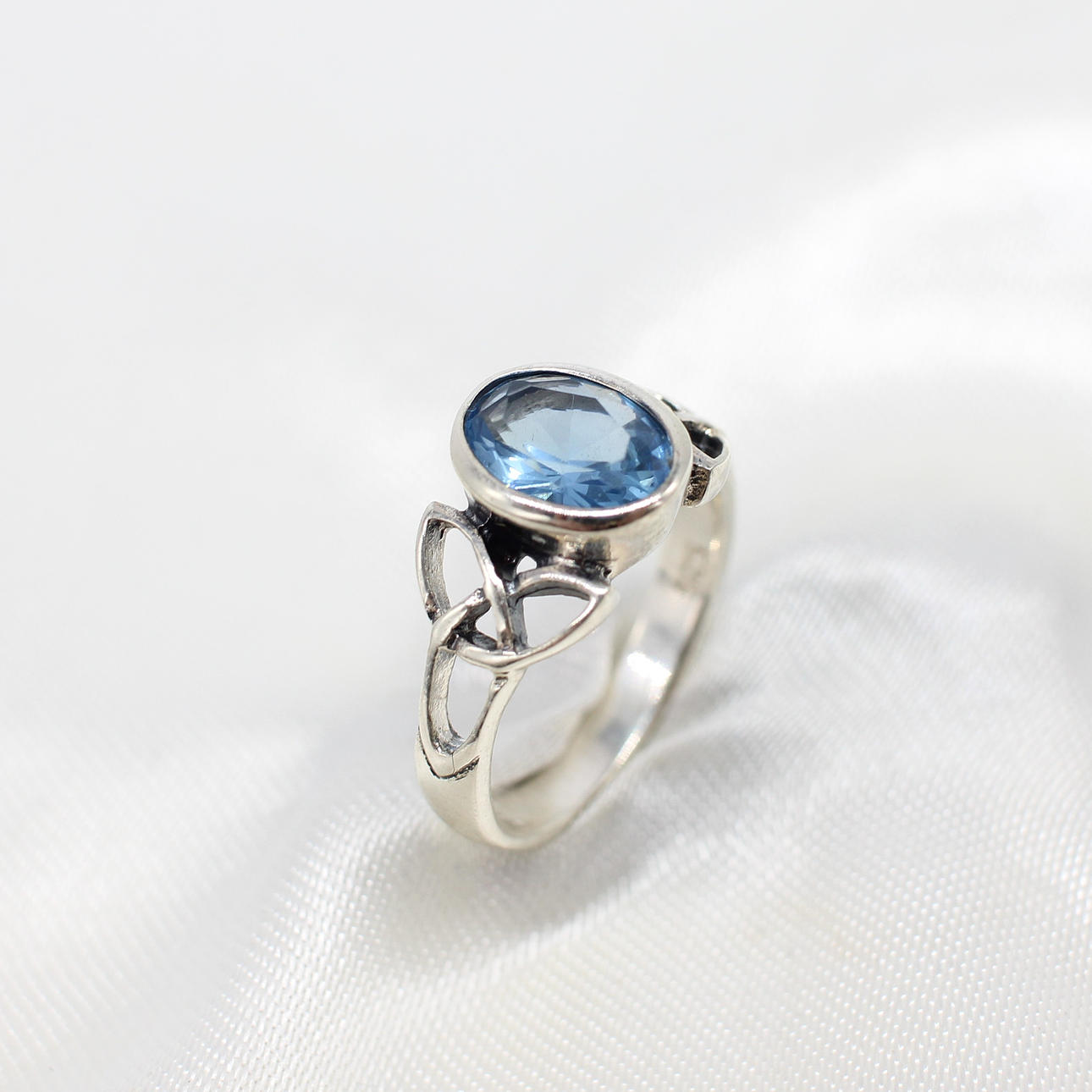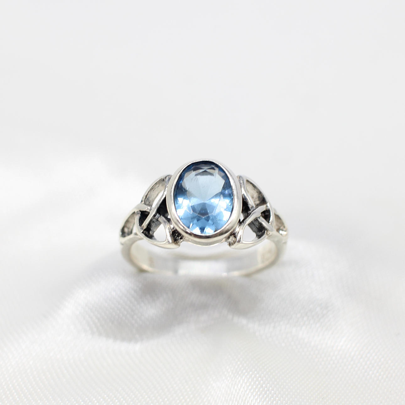 A silver Celtic style ring with patterned shoulders set with an oval blue cubic zirconia.