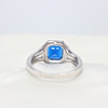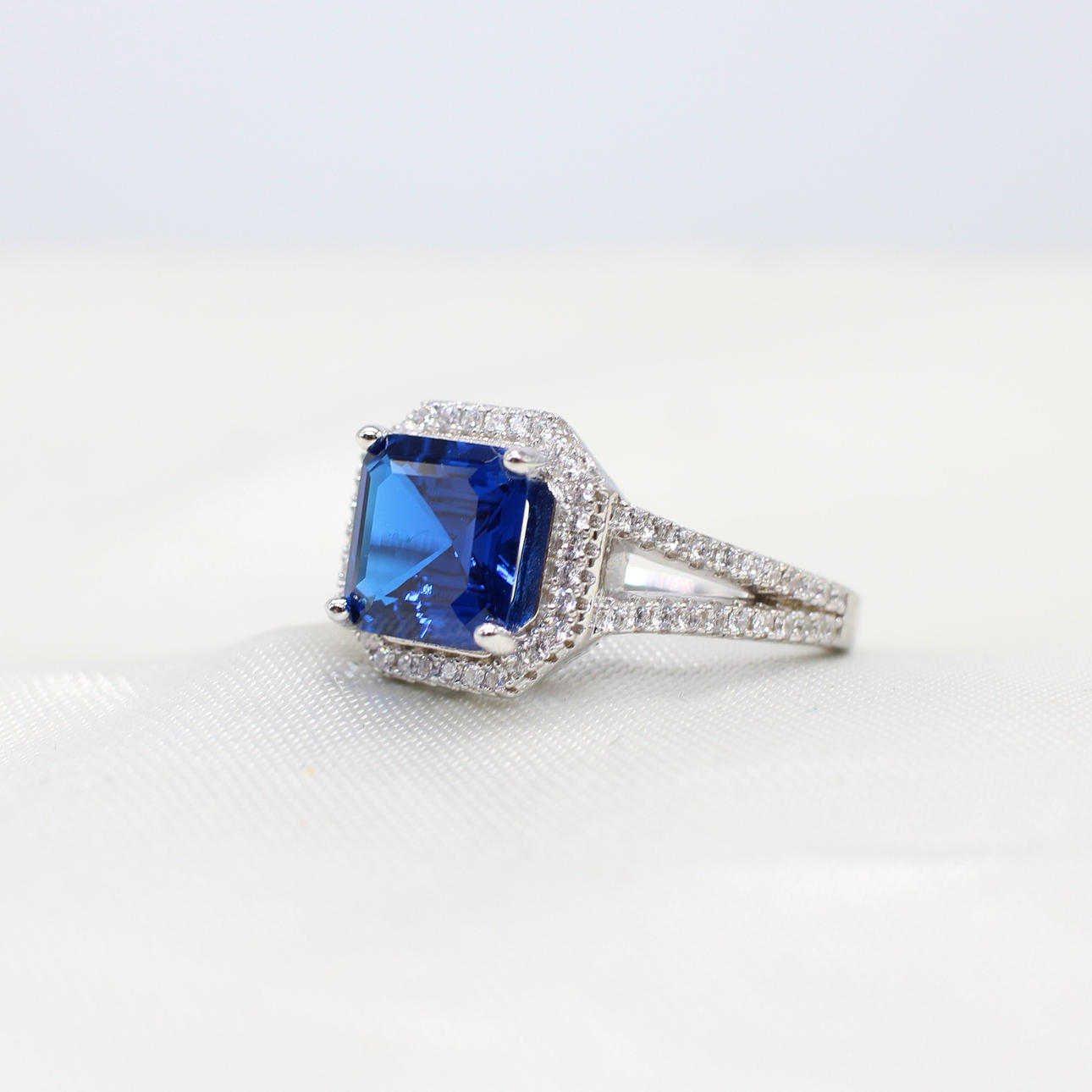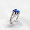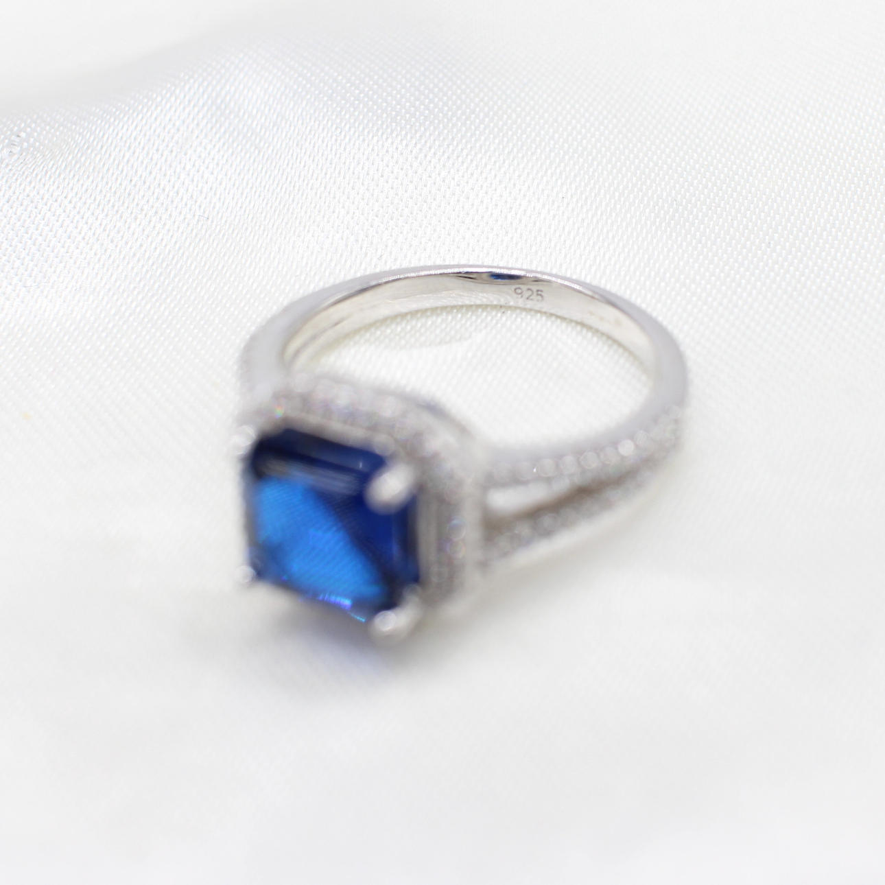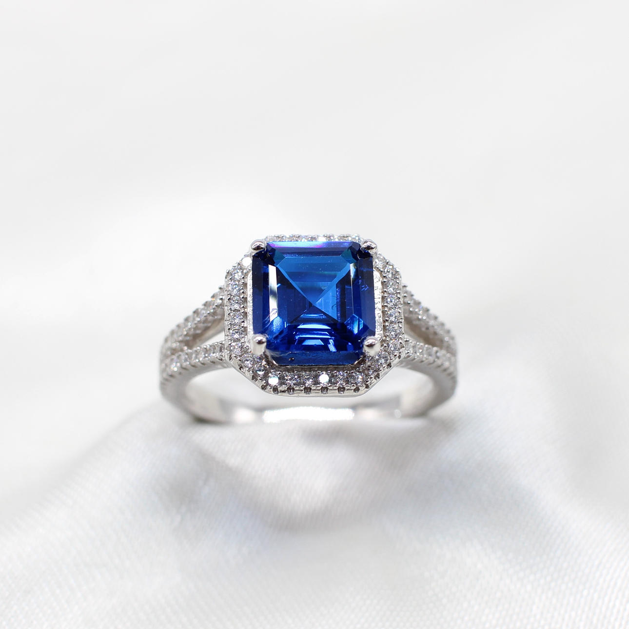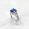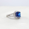 A silver ring set with a dark blue emerald-cut cubic zirconia, surrounded by a halo of cubic zirconia with frosted shoulders.