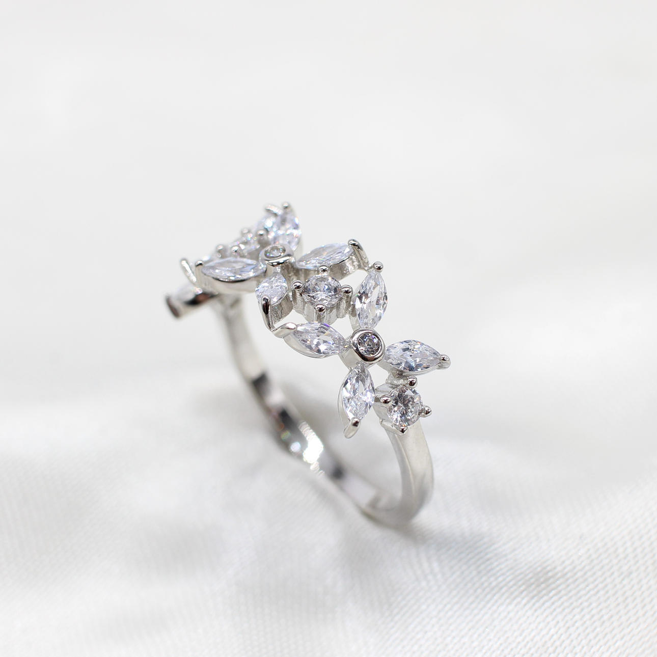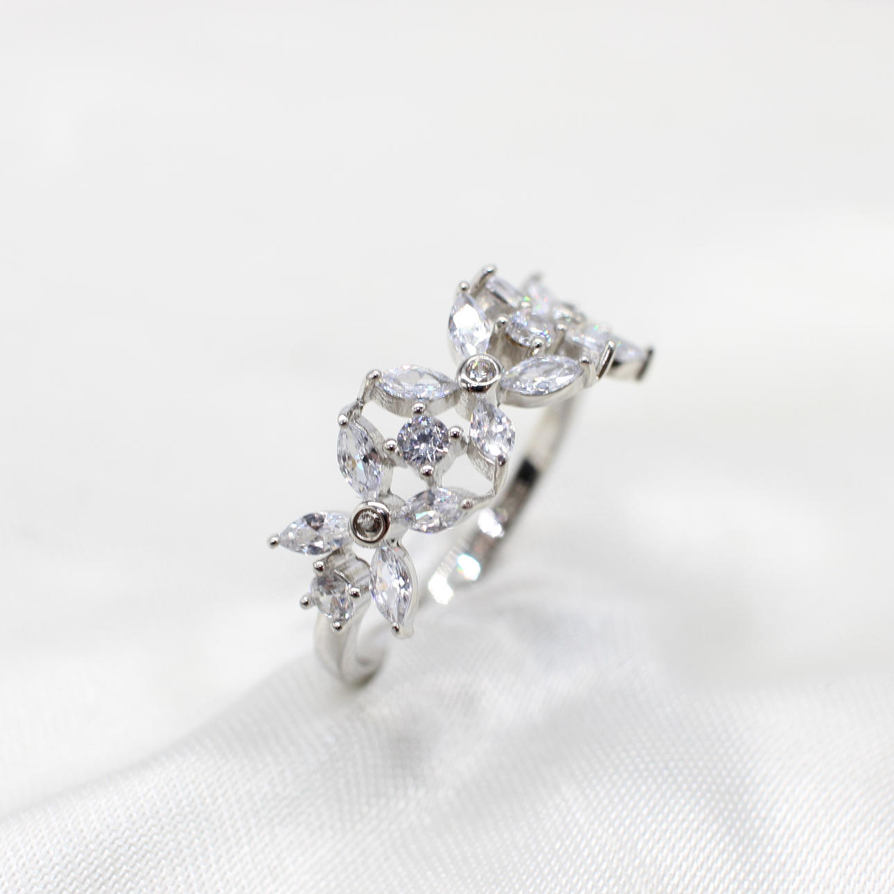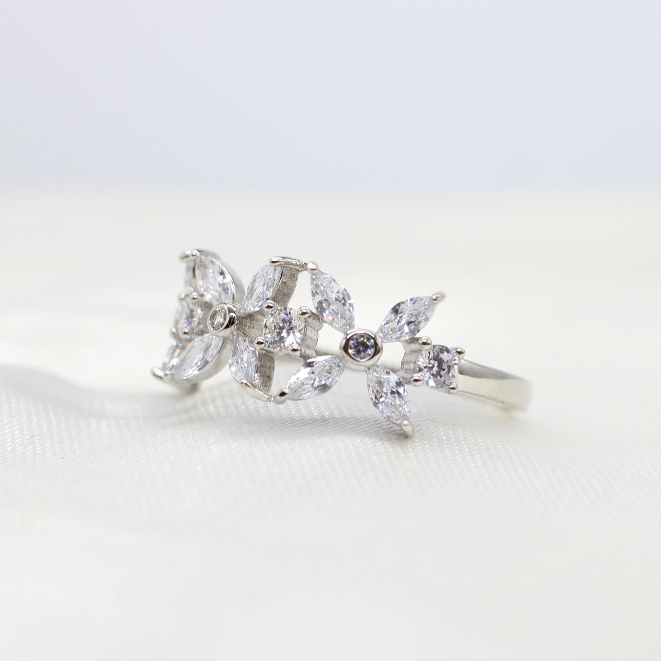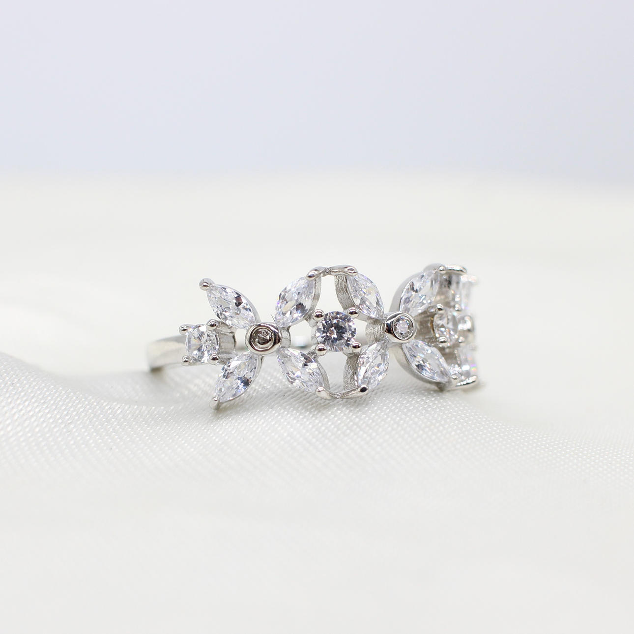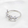 A silver floral styled ring set with marquise-cut & round-cut clear cubic zirconia.