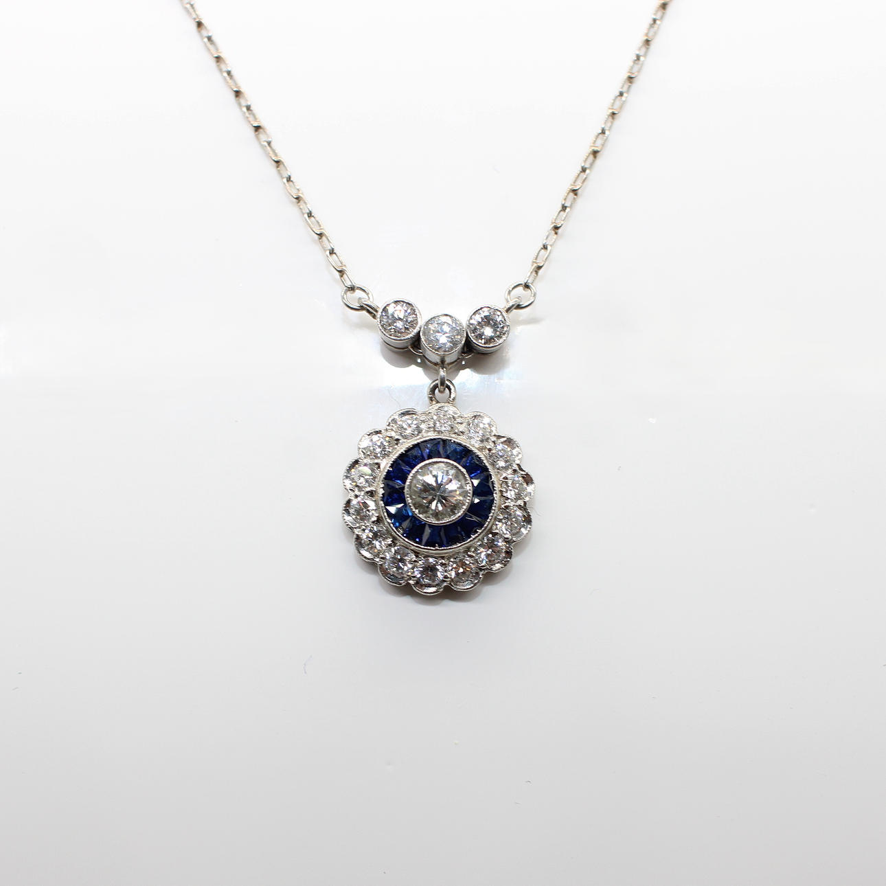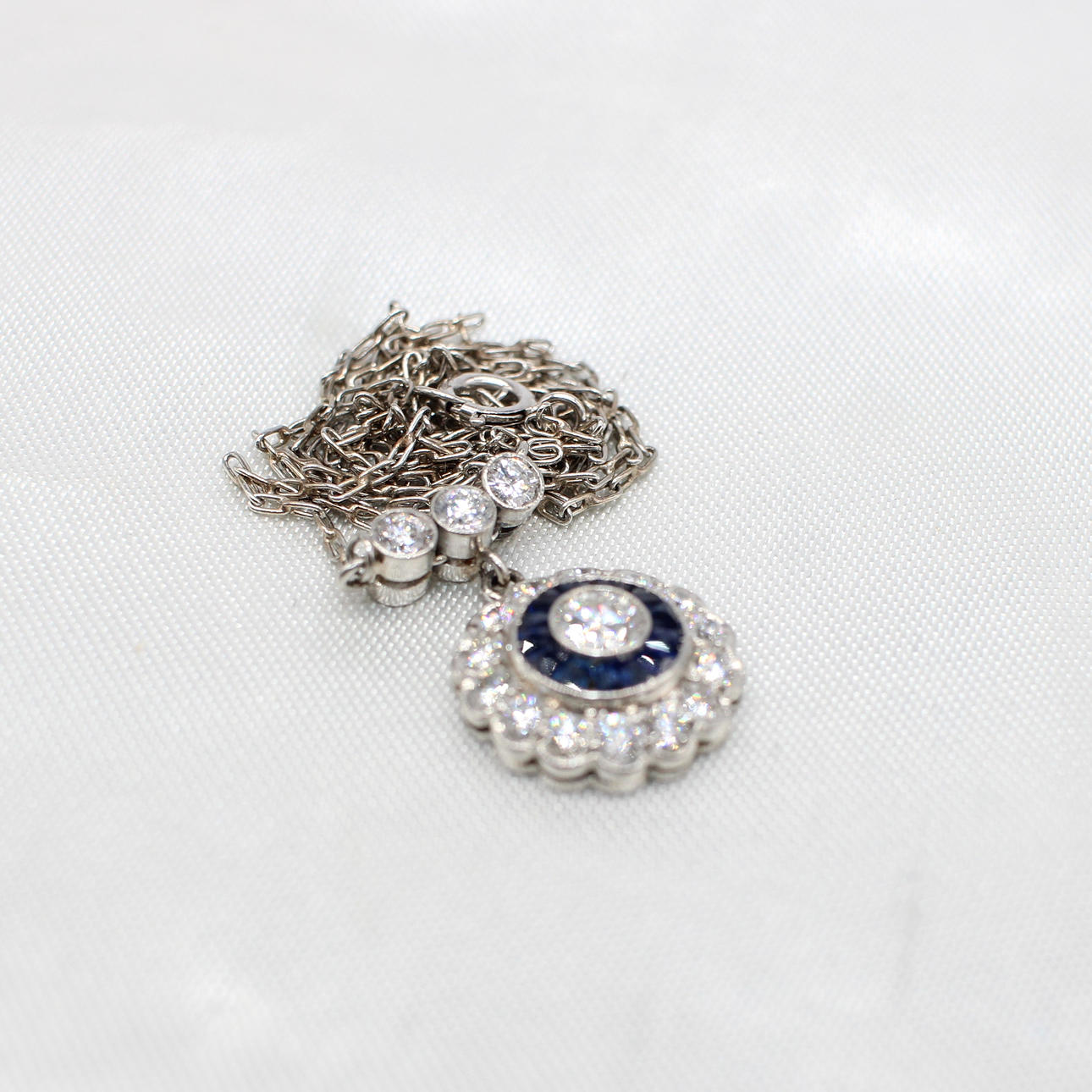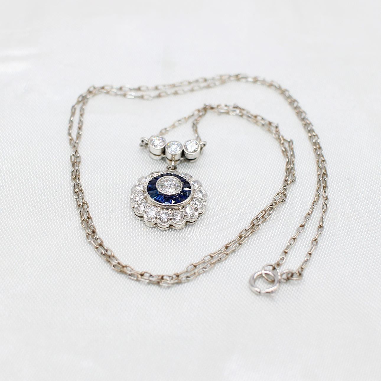A Platinum Sapphire And Diamond Cluster Pendant With Diamond Set Bale On A Platinum Chain (Stamped 950) In An Edwardian Style