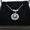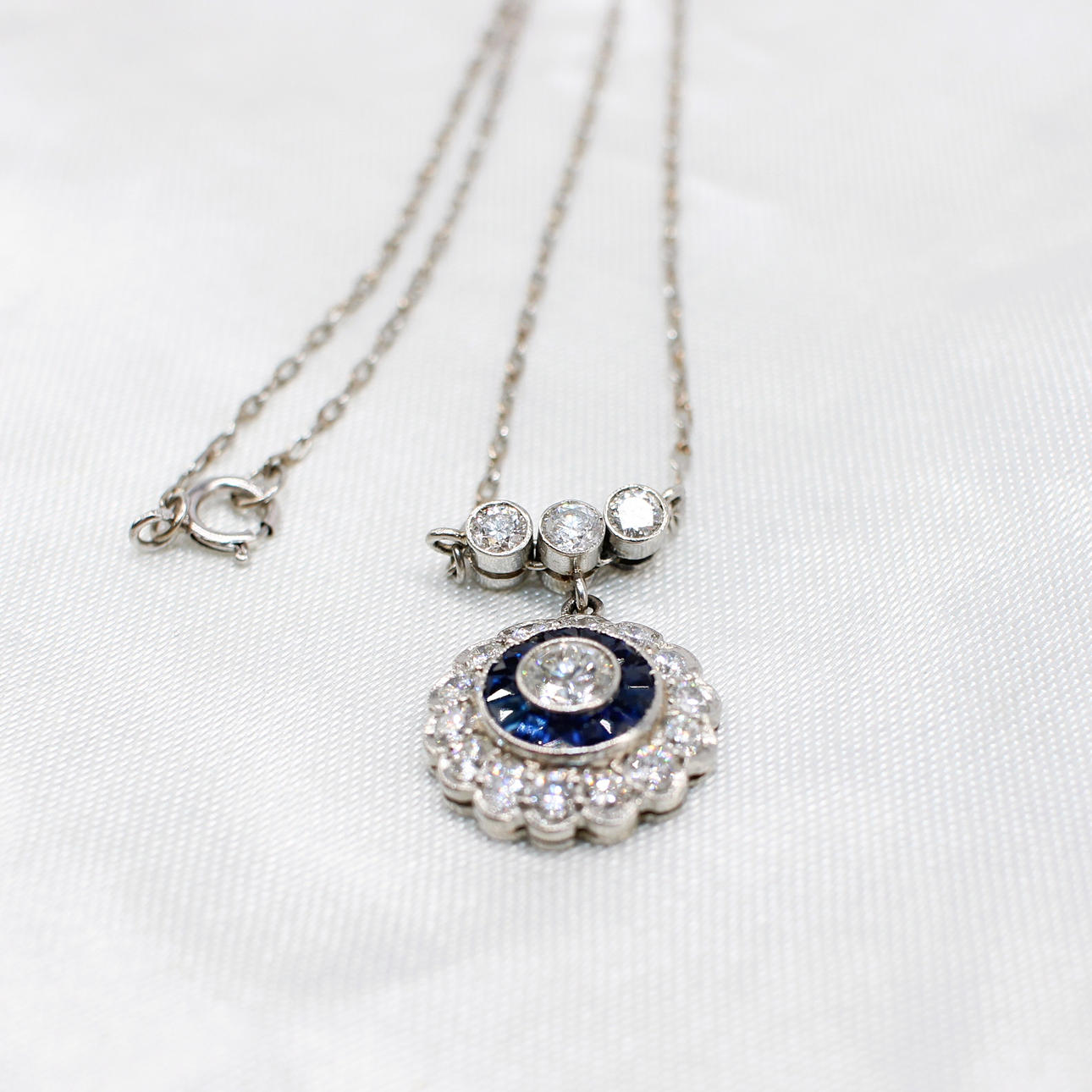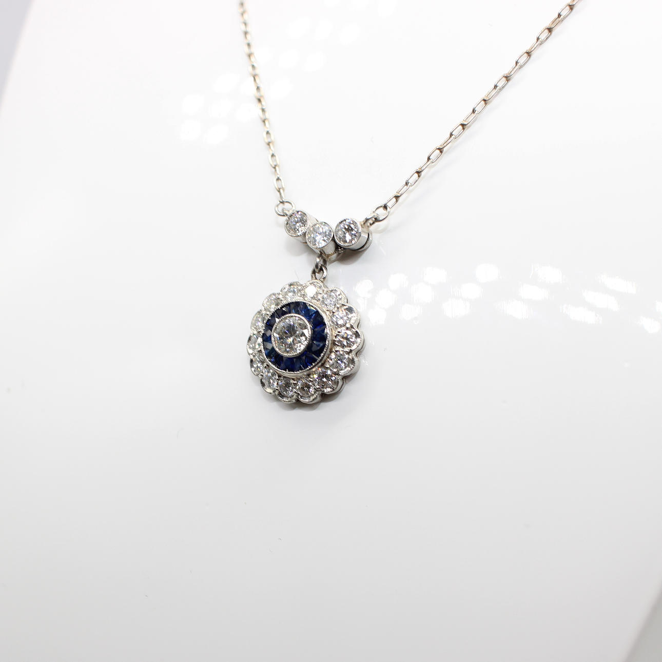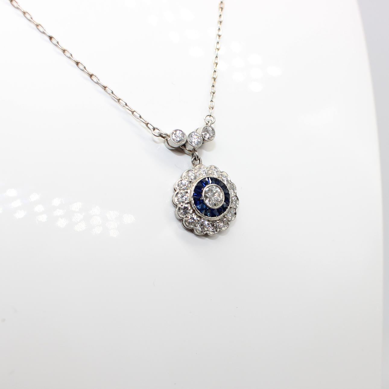 A Platinum Sapphire And Diamond Cluster Pendant With Diamond Set Bale On A Platinum Chain (Stamped 950) In An Edwardian Style