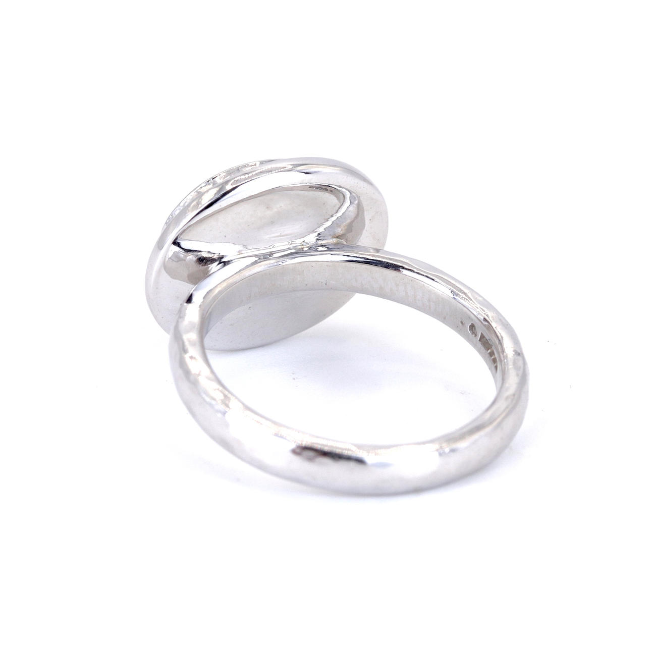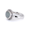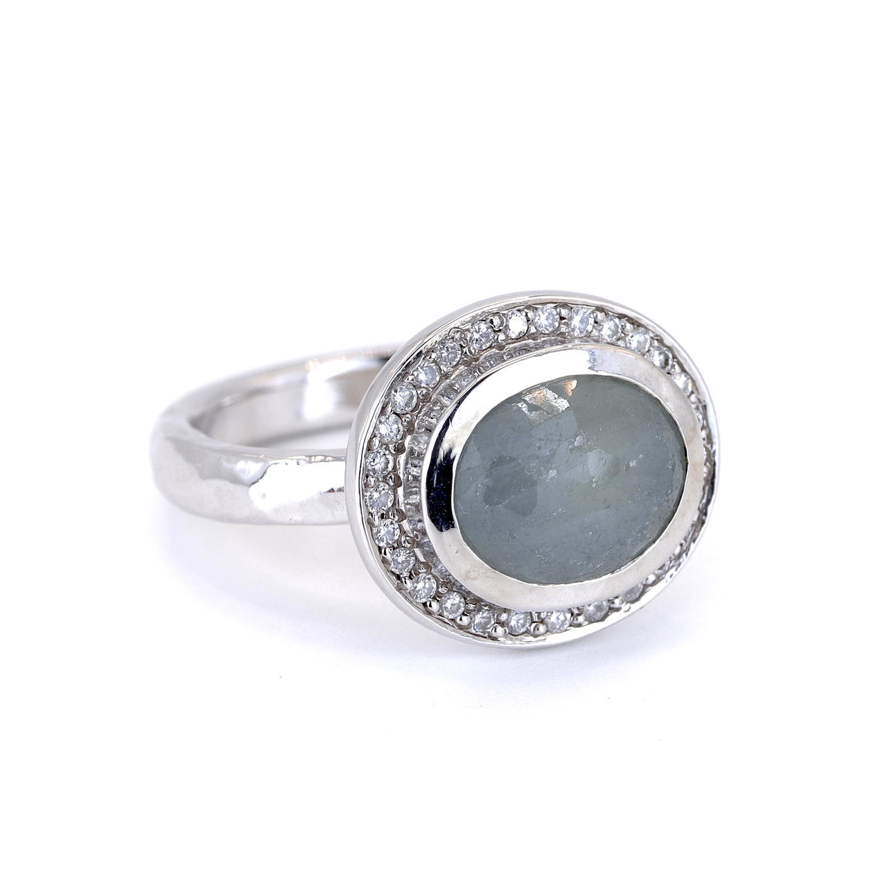 An 18ct white gold ring set with oval cut moonstone (1,50ct approx) surrounded by diamonds. Dia. total: 0,30ct approx. Colour: G-H. Clarity: VS-SI. UK ring size: K,5.