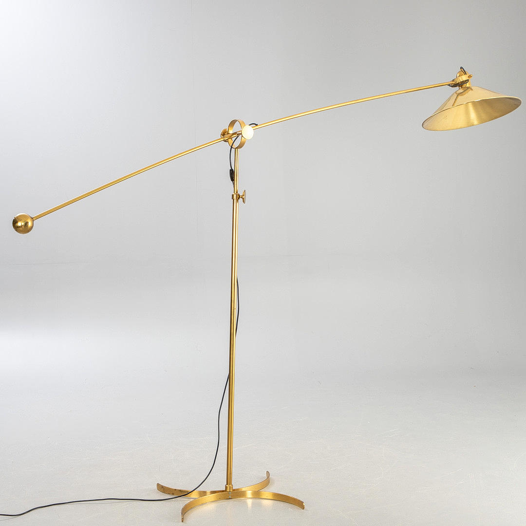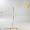 Floor lamp with counterweight, 1970s/80s, polished brass, on an X-shaped base, long pivoting articulated arm (total length 270 cm) with dome shade.