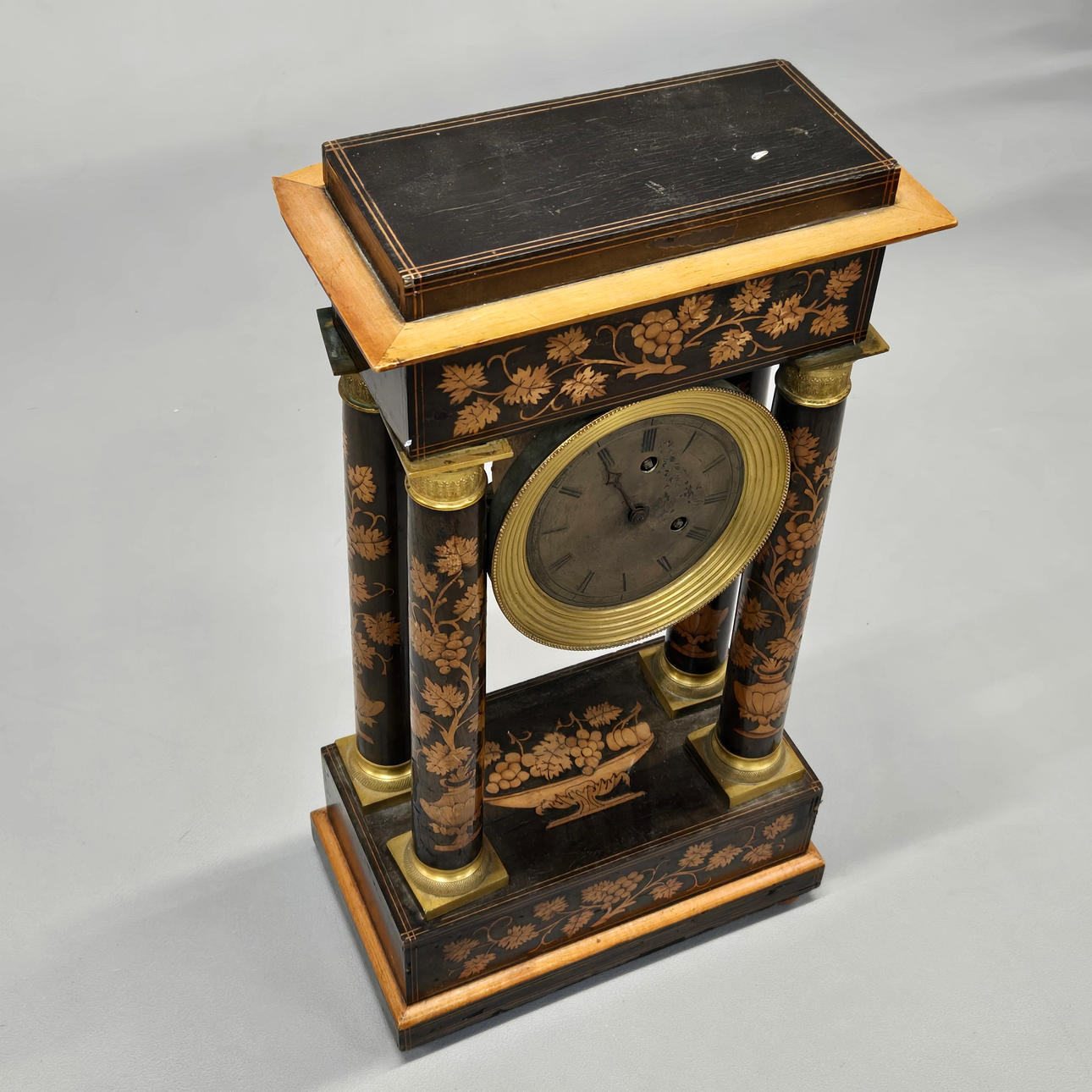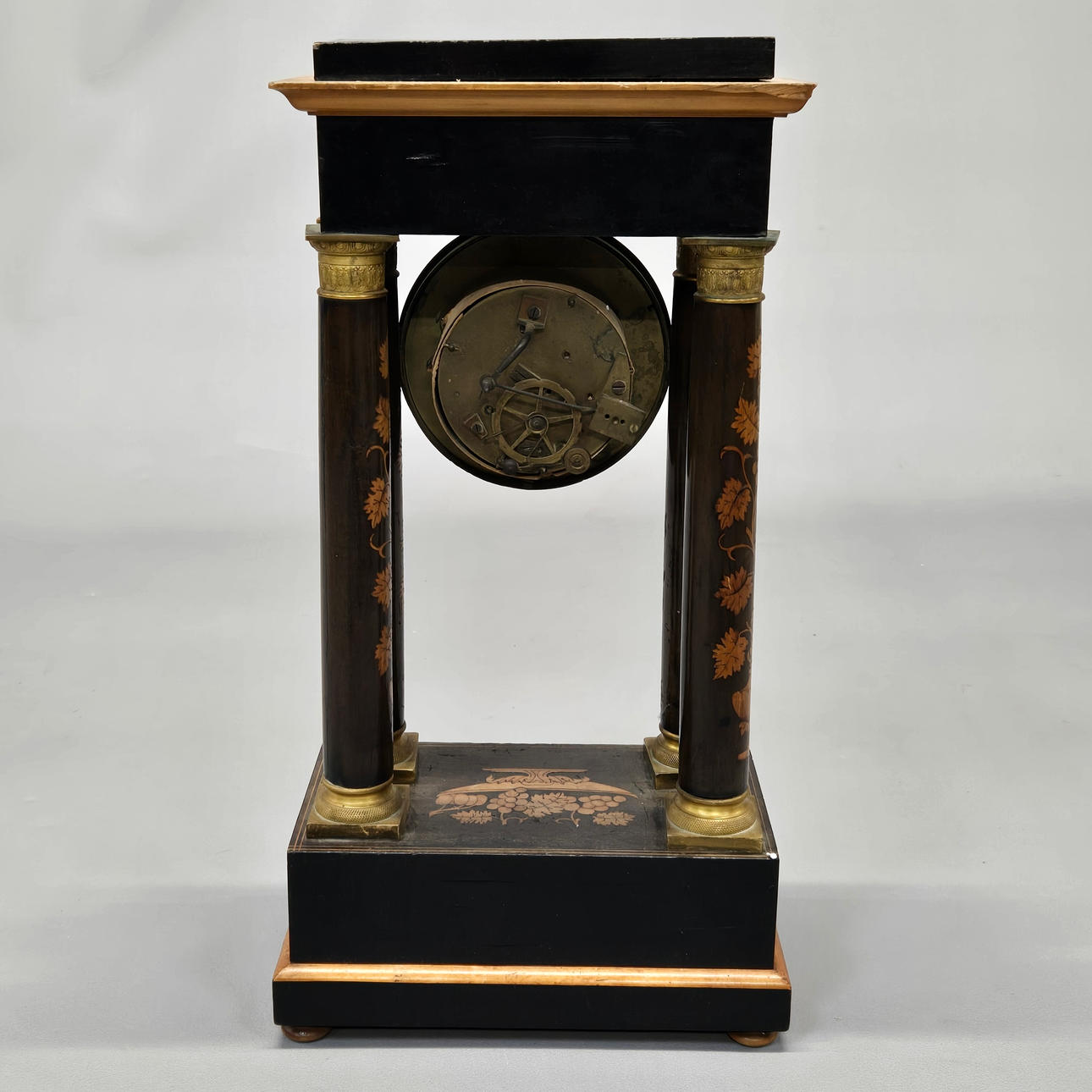 A wooden inlaid mantle clock, width 24cm, depth 15cm, height 50cm.