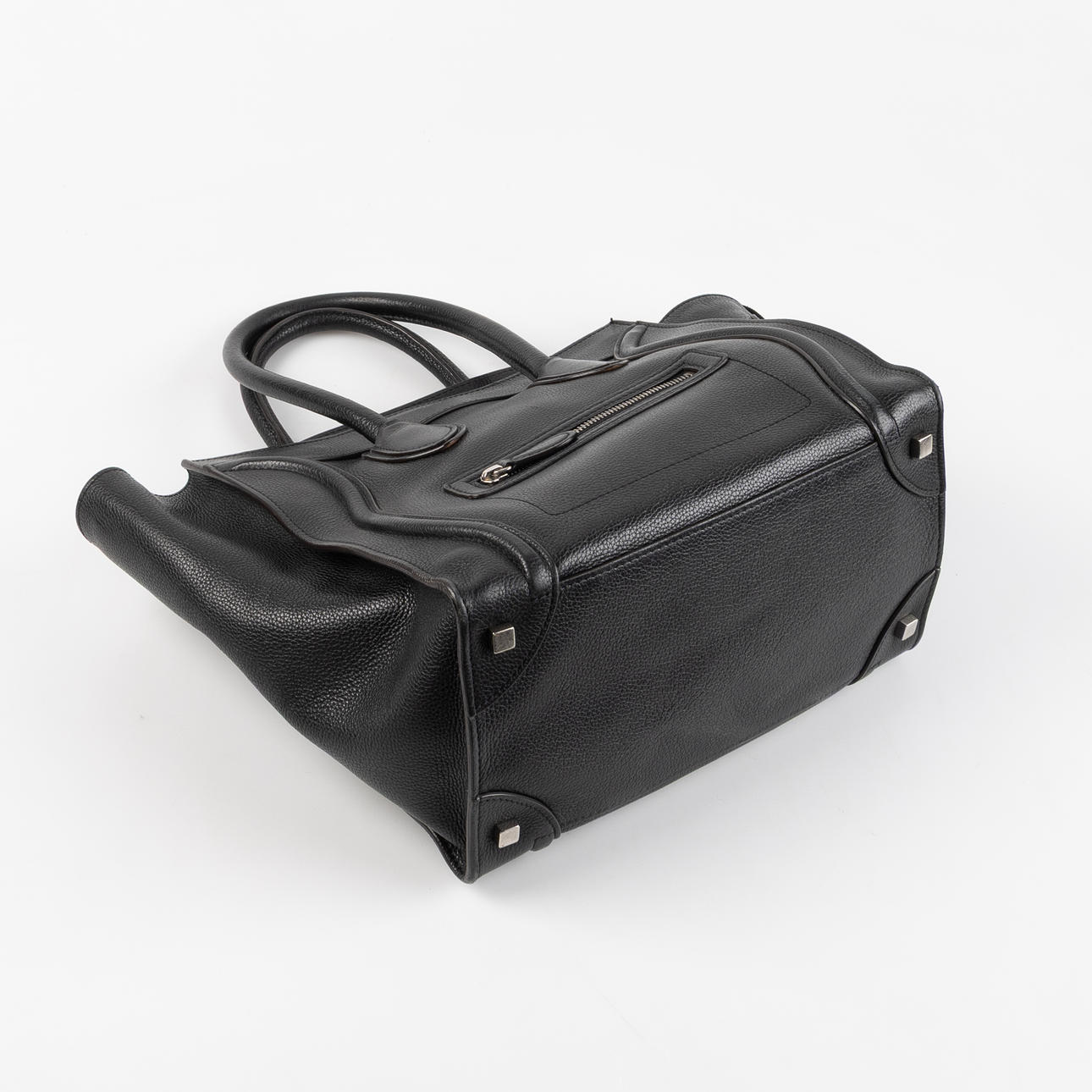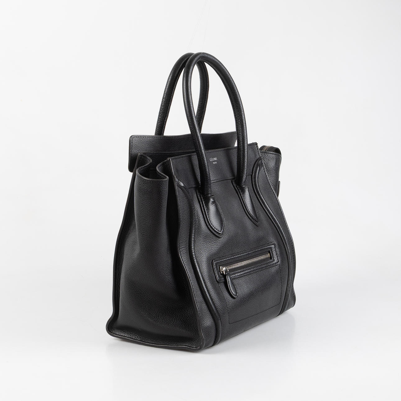 in black grained leather with white metal hardware. One compartment with a zipper, silver-plated embossing CÉLINE PARIS, opening with a zipper. Interior in black textile with two open side compartments and a zippered compartment, internal label with serial number; F-SA-0152, F-PA-0162.