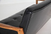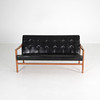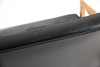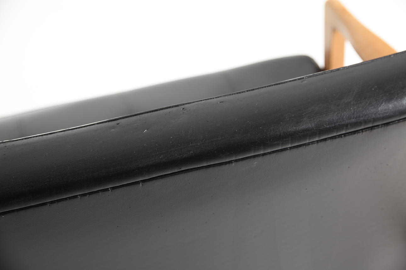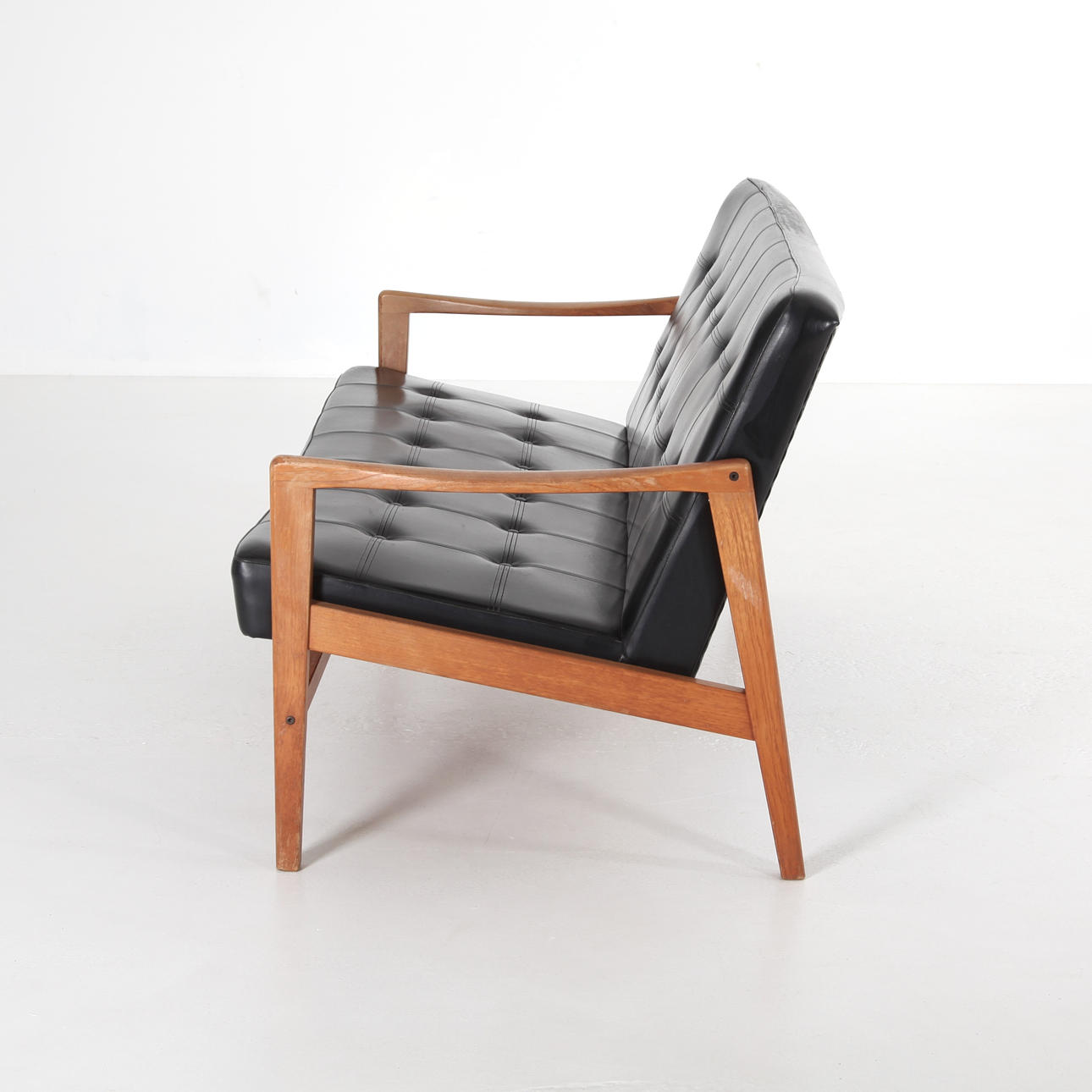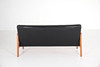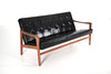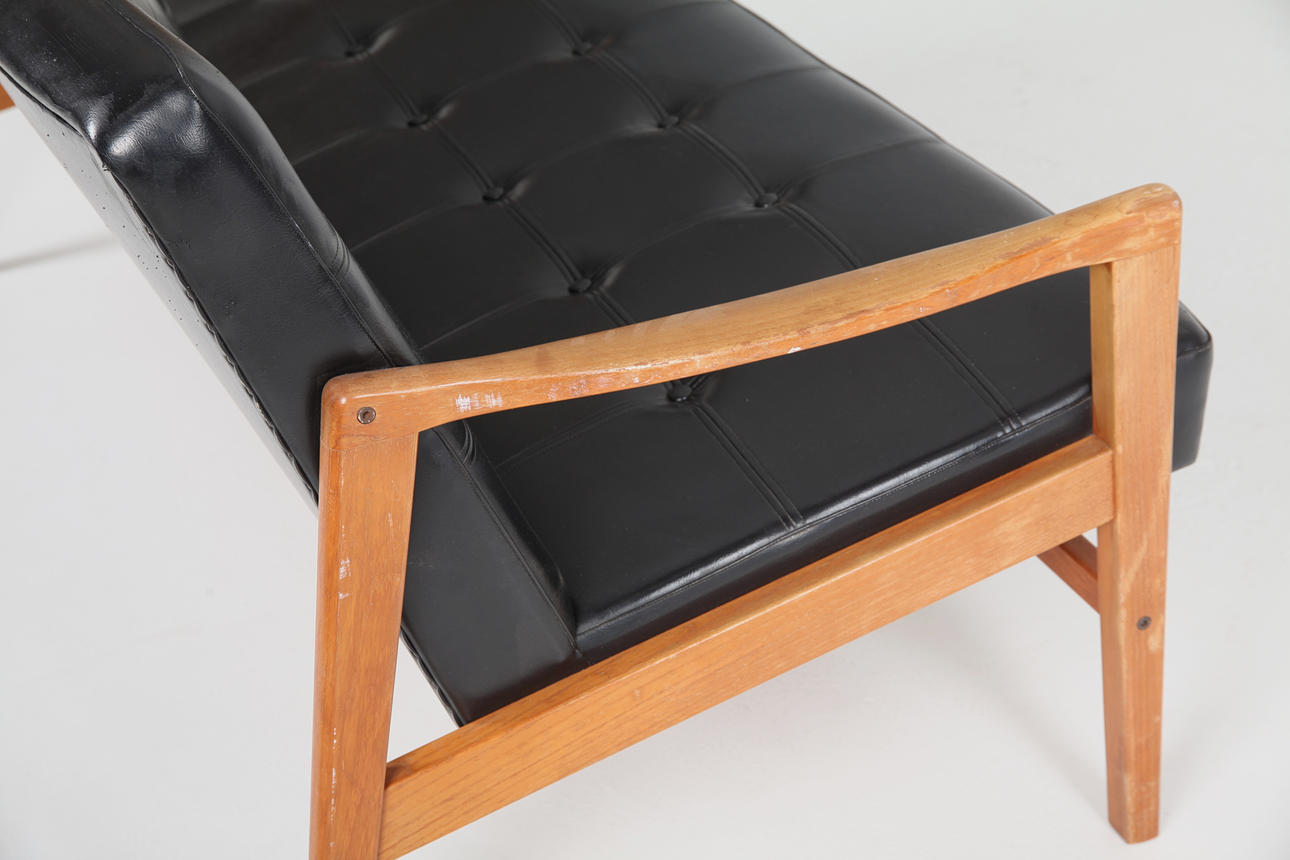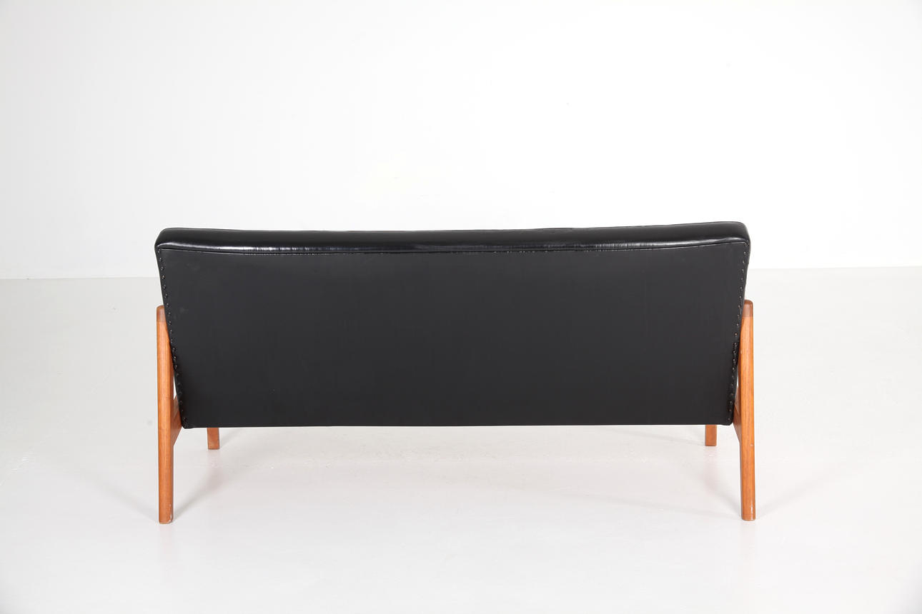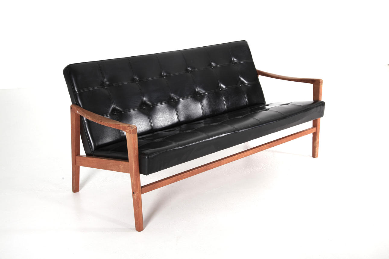 Sofa, teak, fully upholstered in black artificial leather,