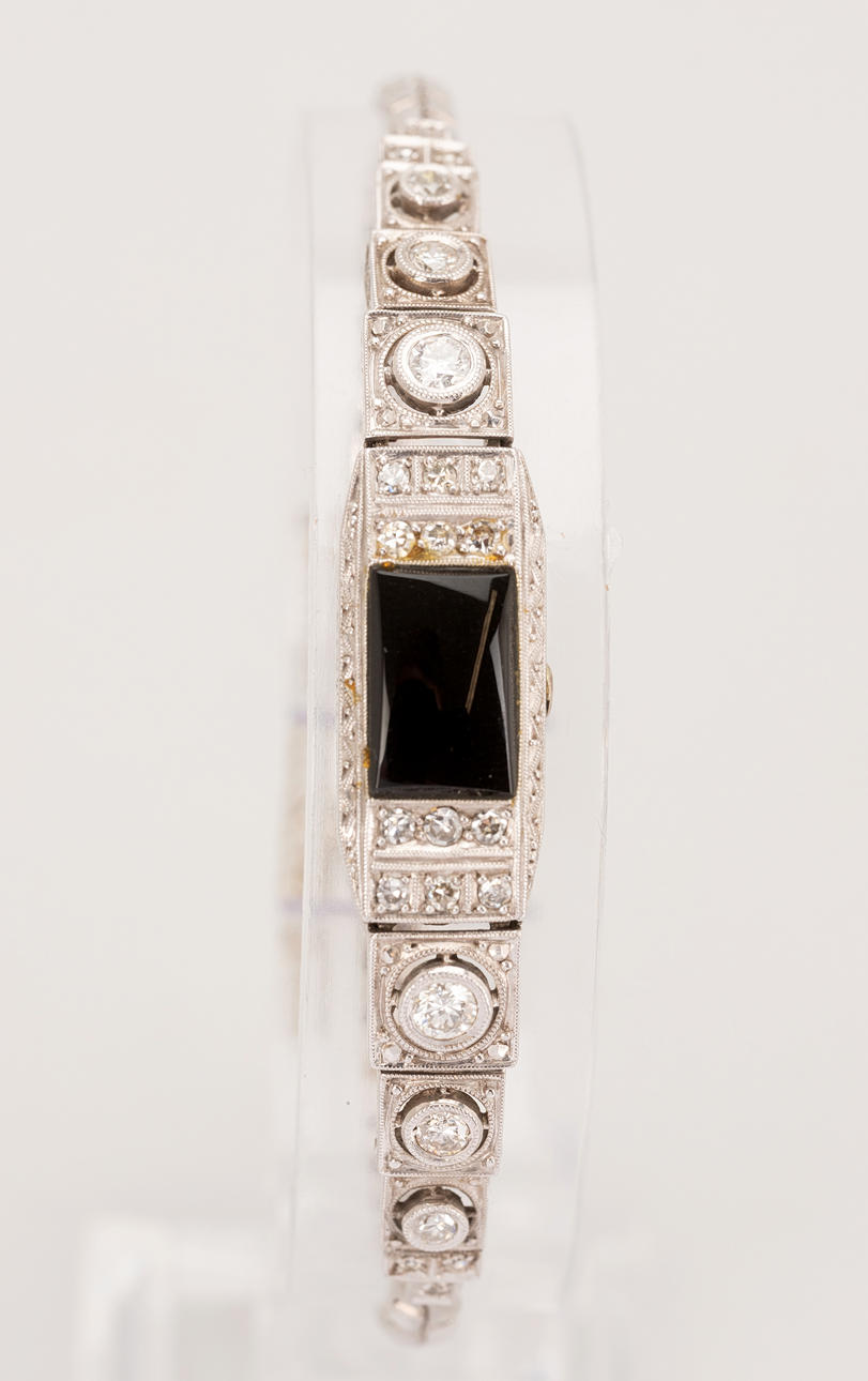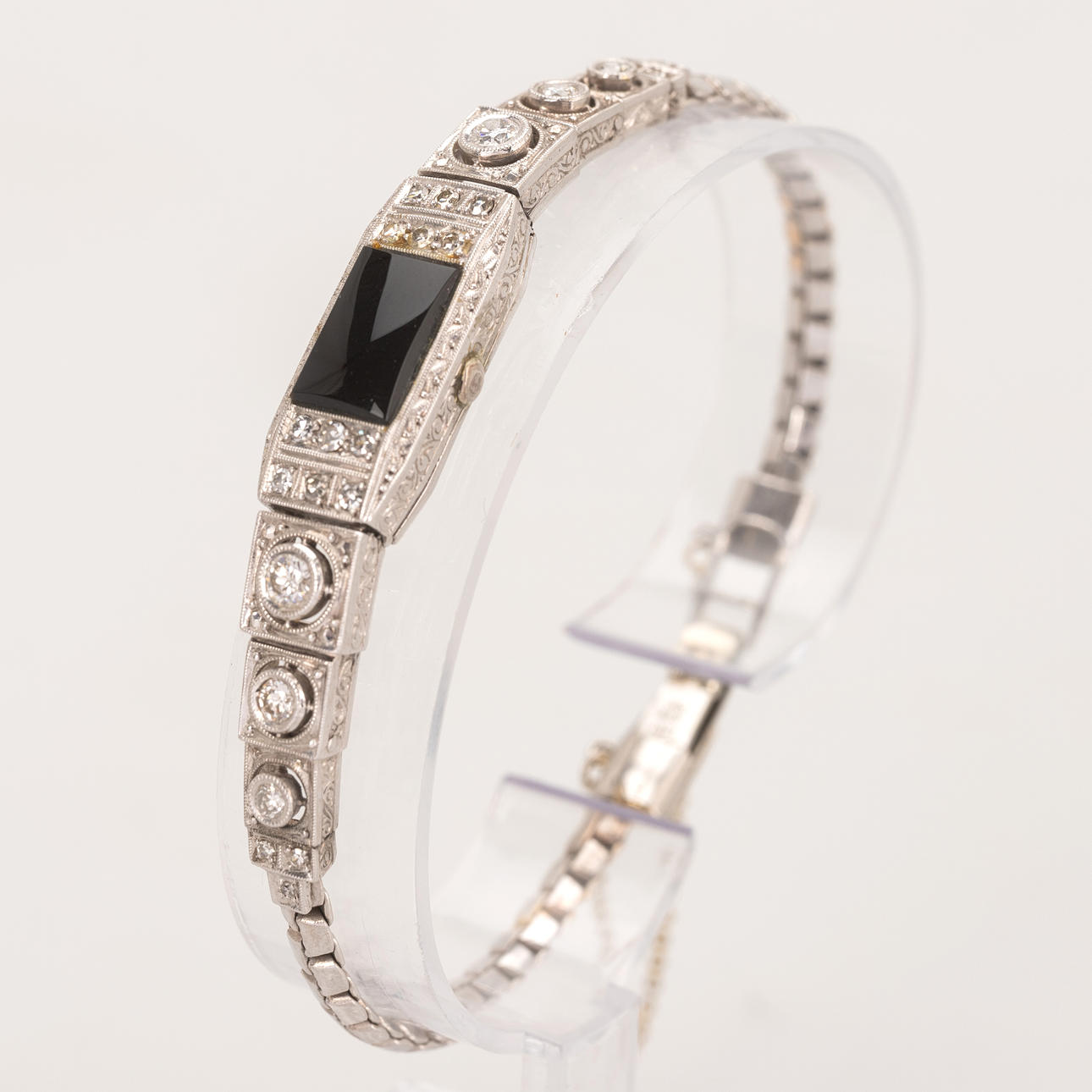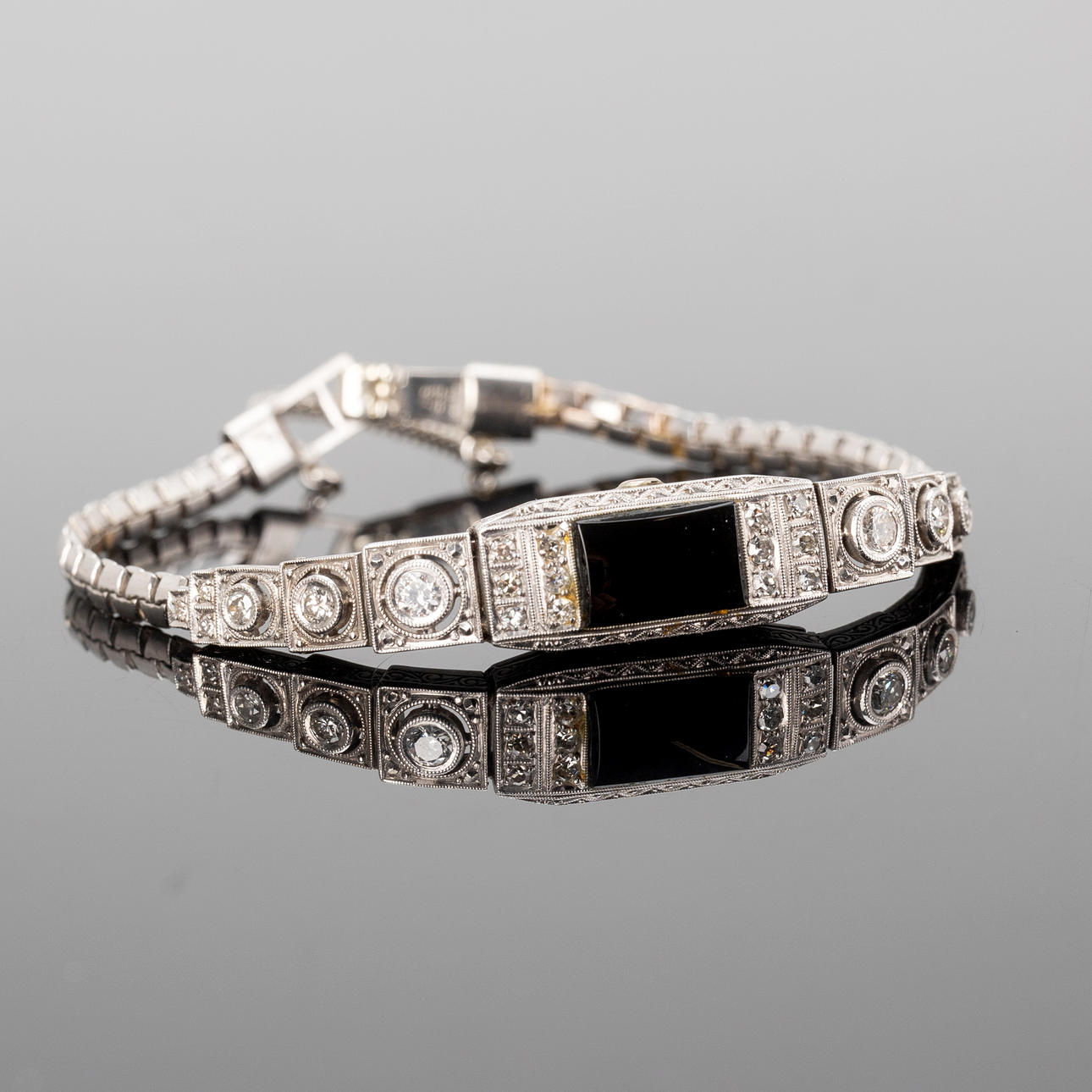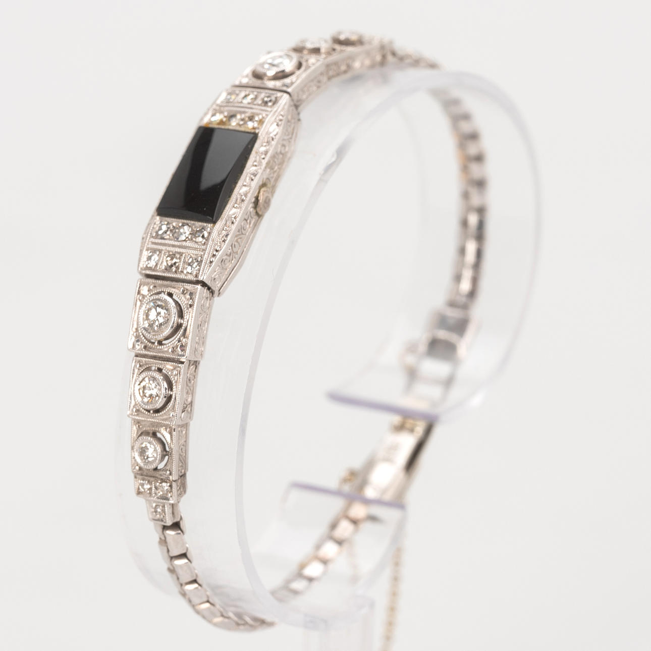 Watch converted into a bracelet, platinum case set with onyx and diamonds, the bracelet made of 585 white gold. Dimensions approx. Case 10.5 mm x 23.5 mm, length 17 cm. Weight ca. 18.2 grams.