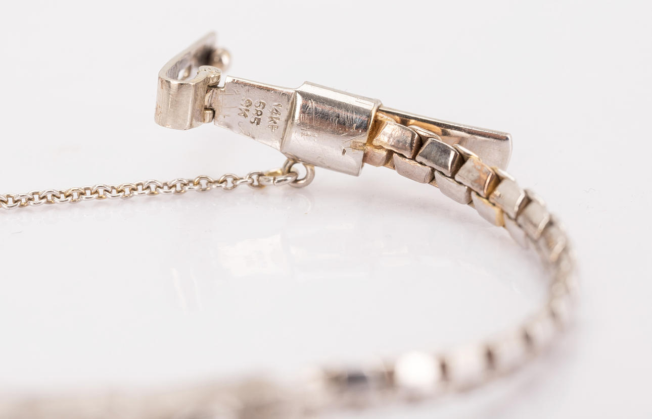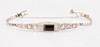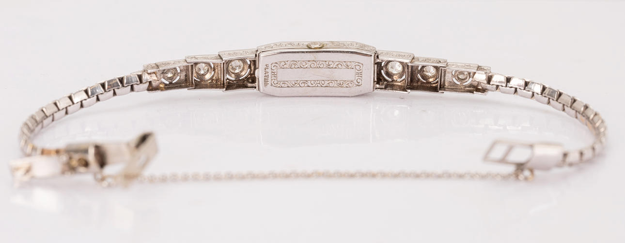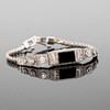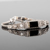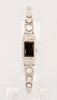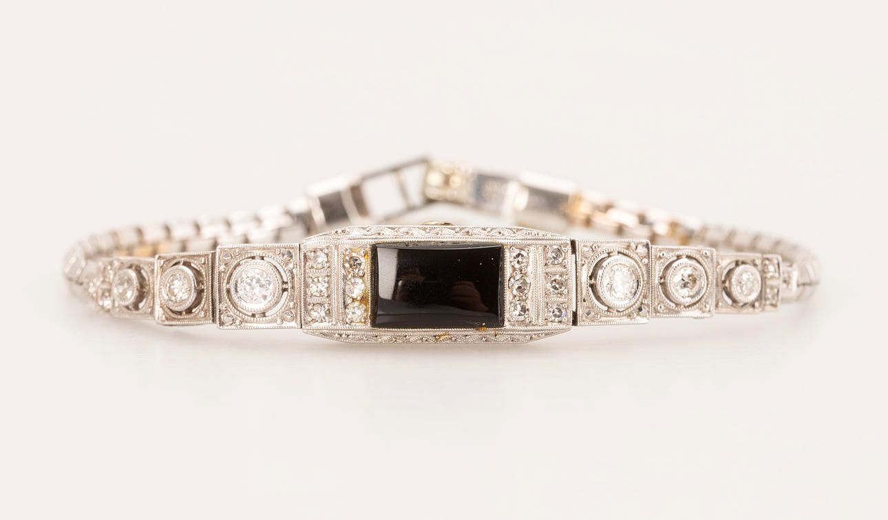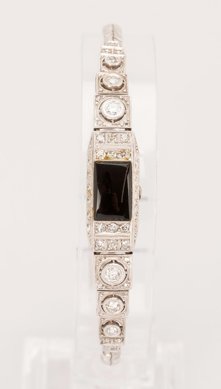 Watch converted into a bracelet, platinum case set with onyx and diamonds, the bracelet made of 585 white gold. Dimensions approx. Case 10.5 mm x 23.5 mm, length 17 cm. Weight ca. 18.2 grams.