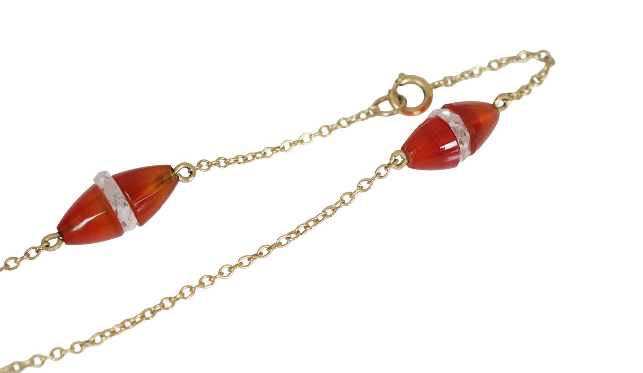 Set with agates and a clear faceted stone. Chain length 16". Unmarked yellow metal. Gross weight 5.5g.