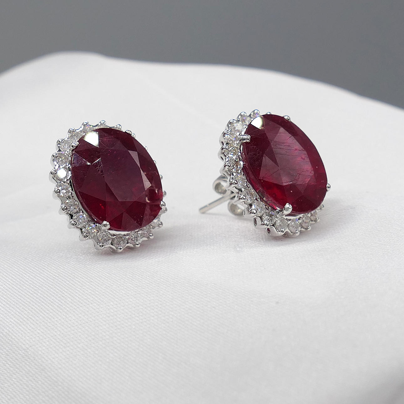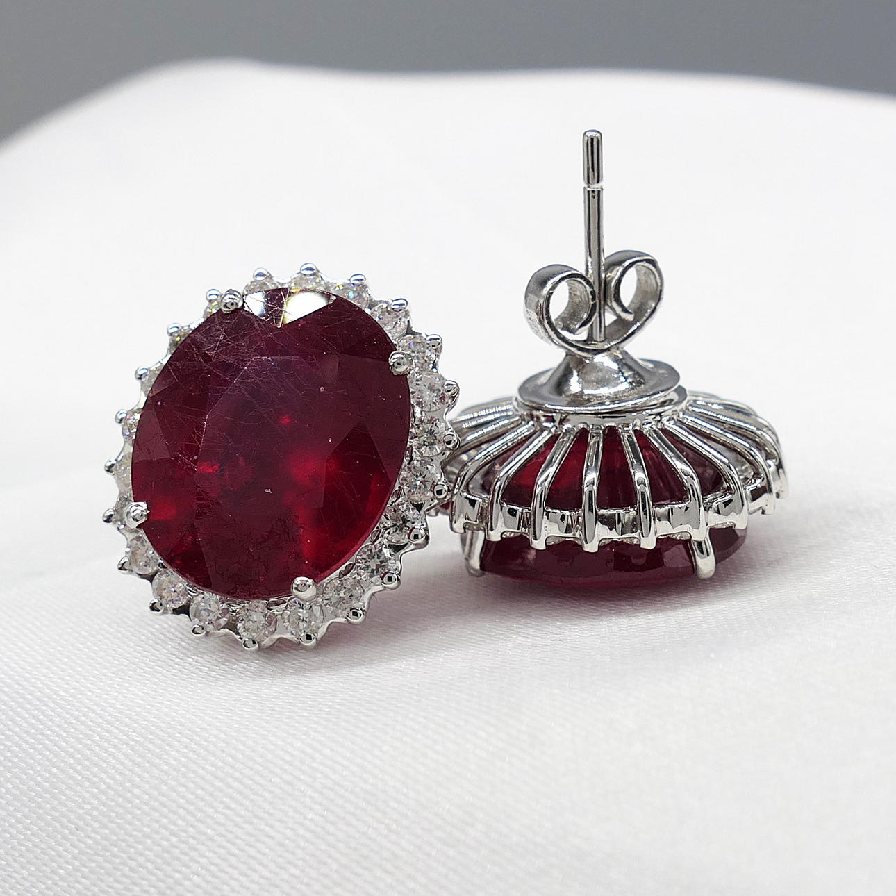 Large pair of ruby and diamond oval cluster earrings in 18k white gold, with gift box.