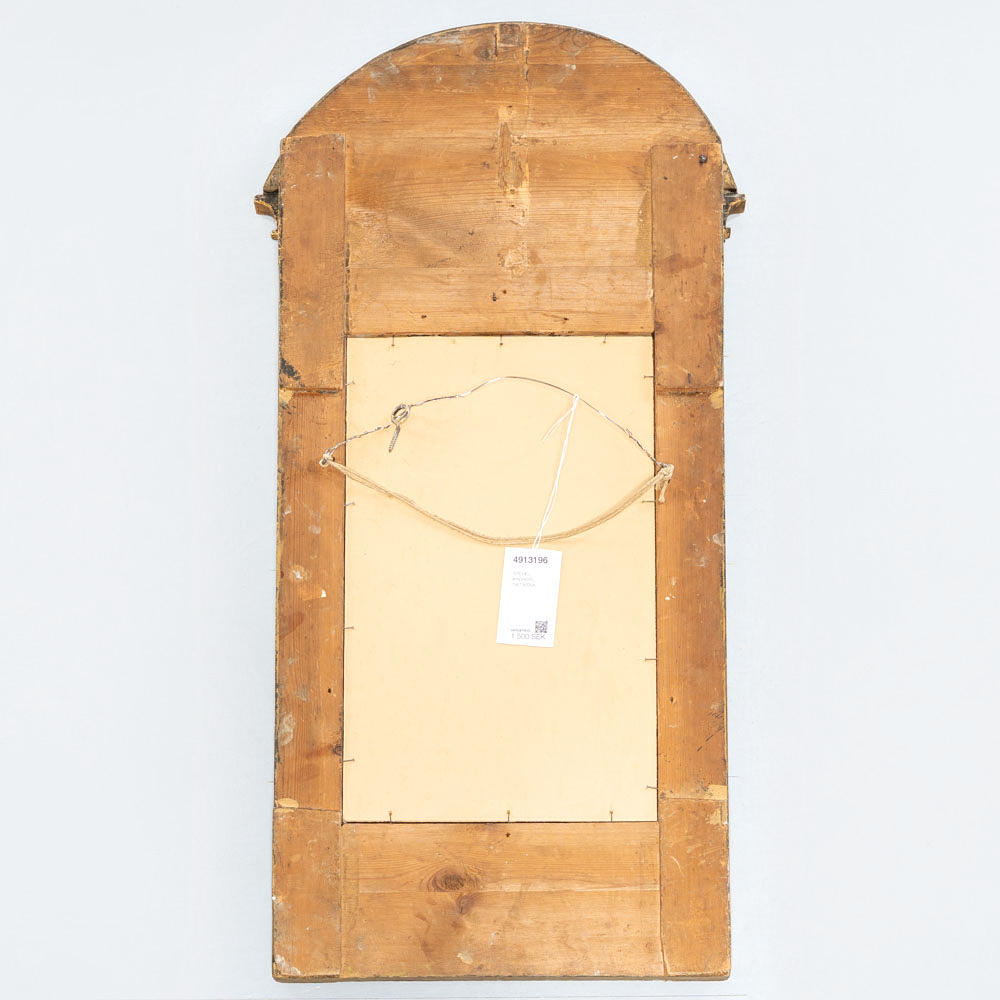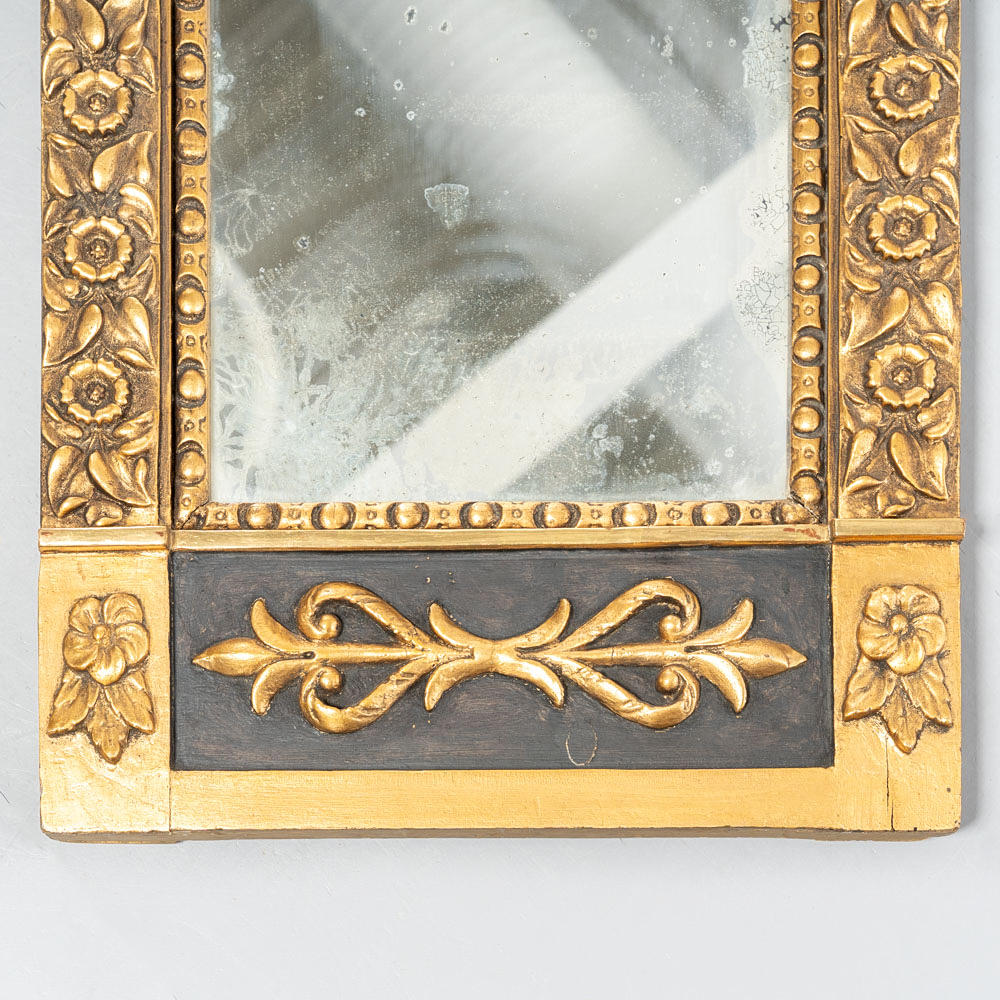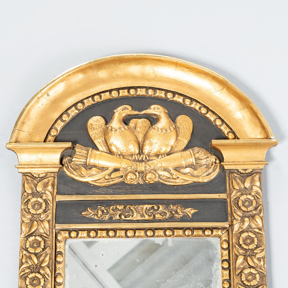 Empirical style mirror, decorative lintel, painted black and bronzed, decors of flowers and birds.