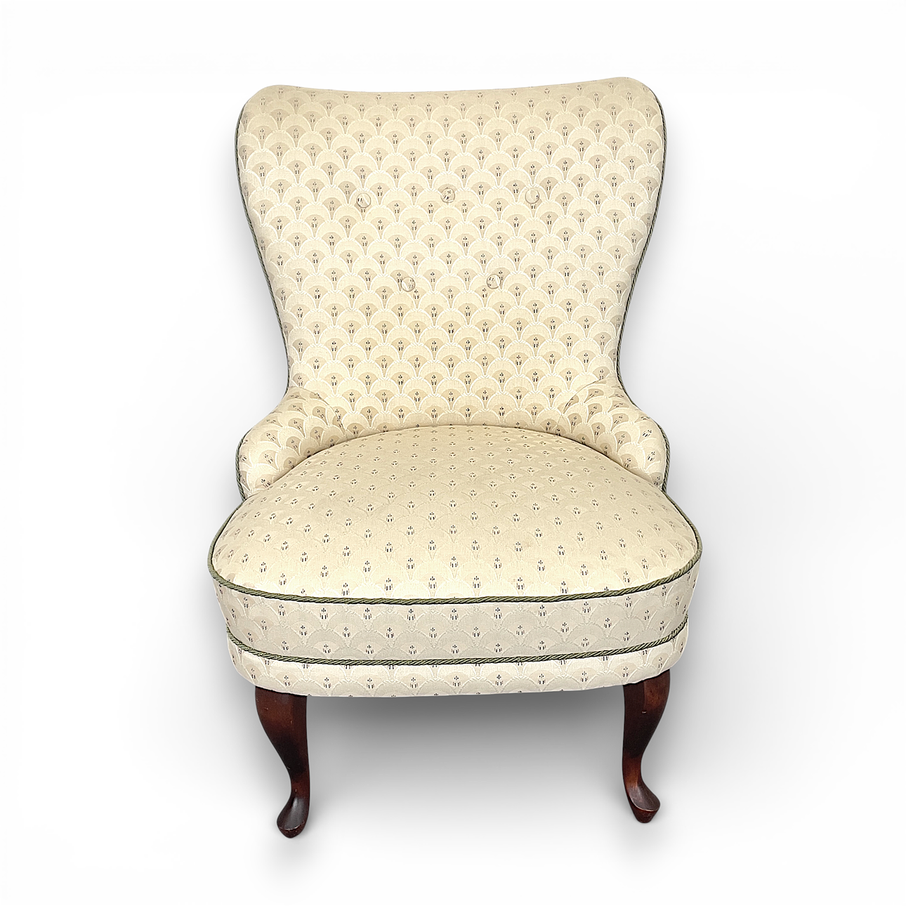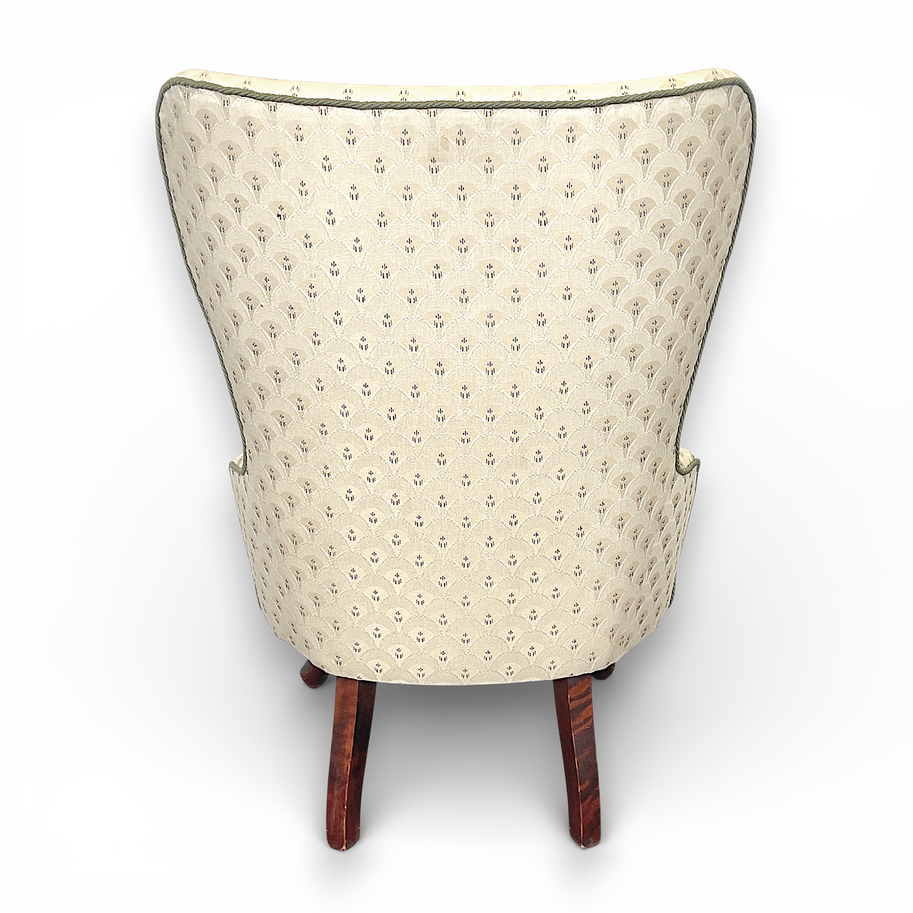 Firmly upholstered, upholstered patterned light textile with matching ornamental cushion. Legs in stained wood.