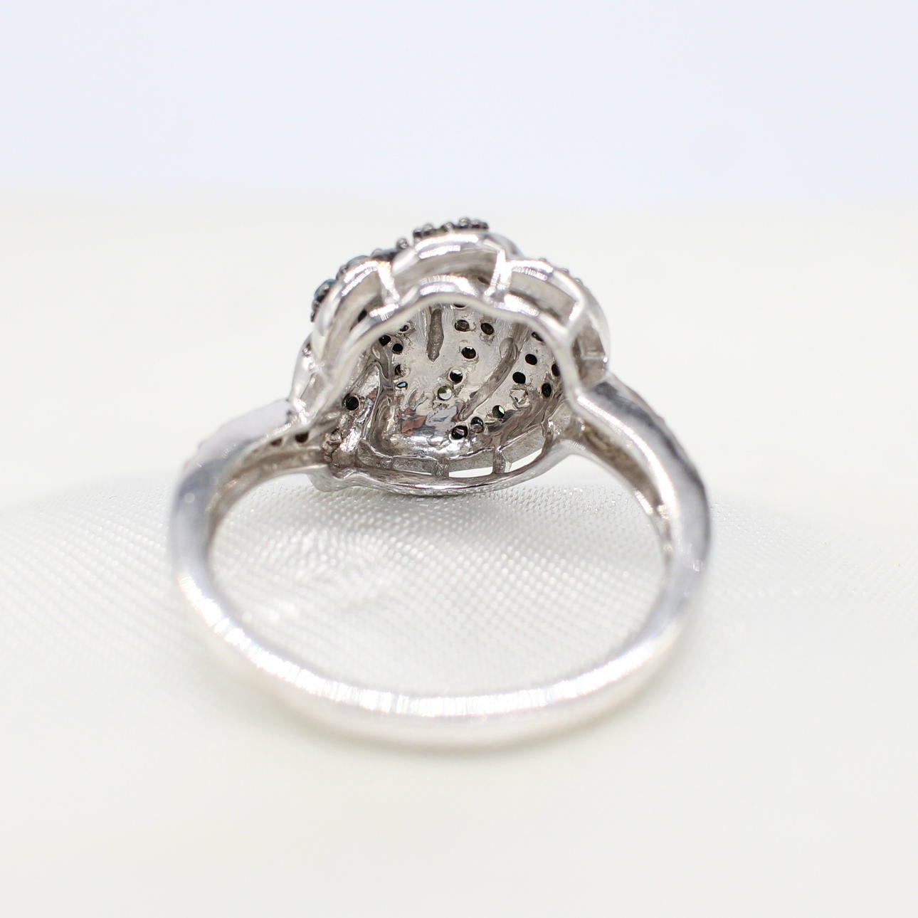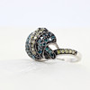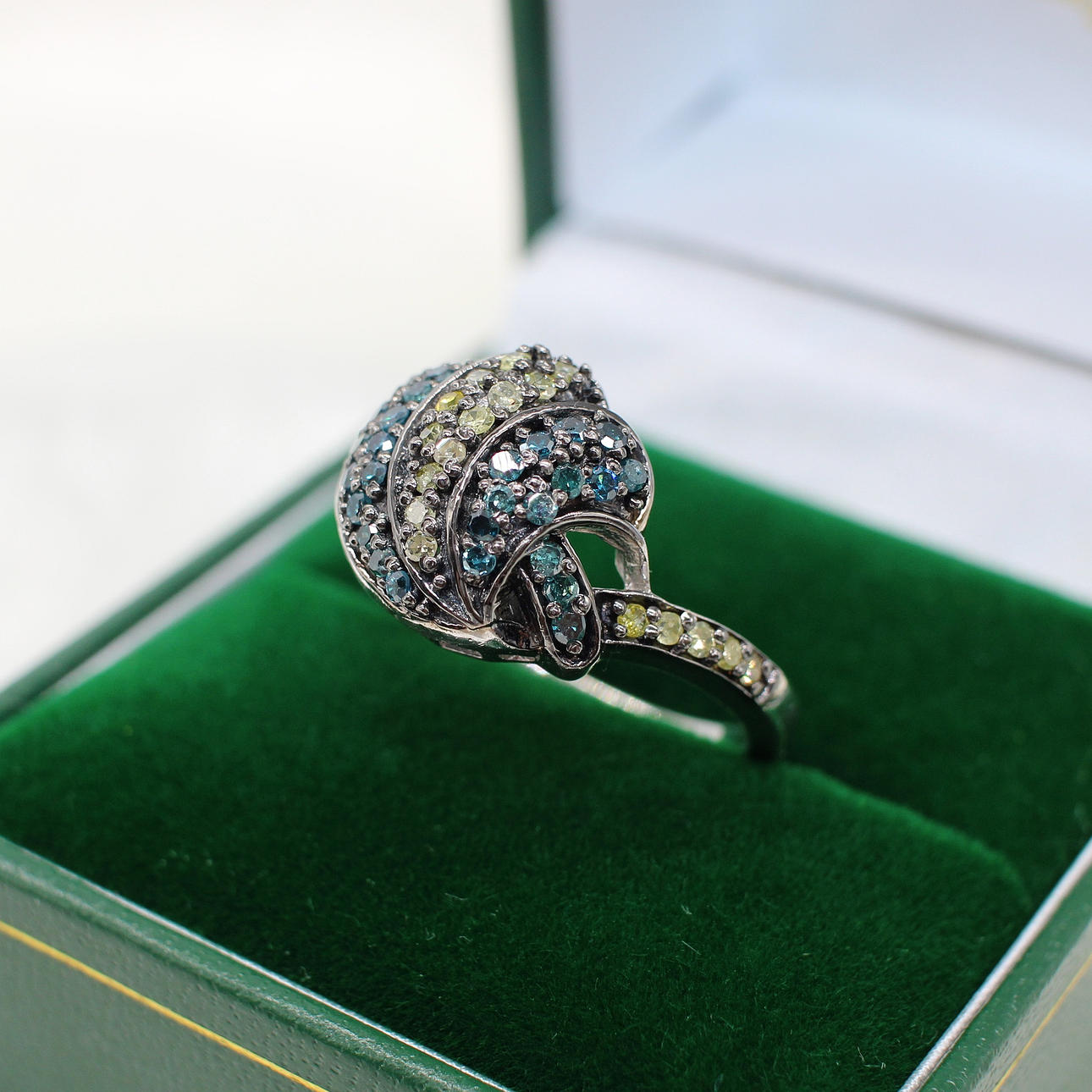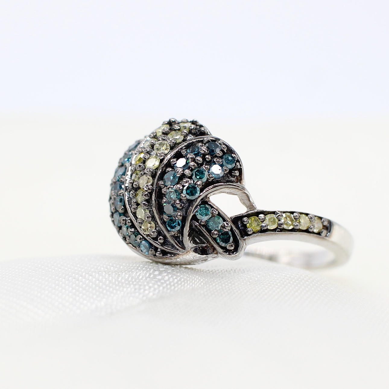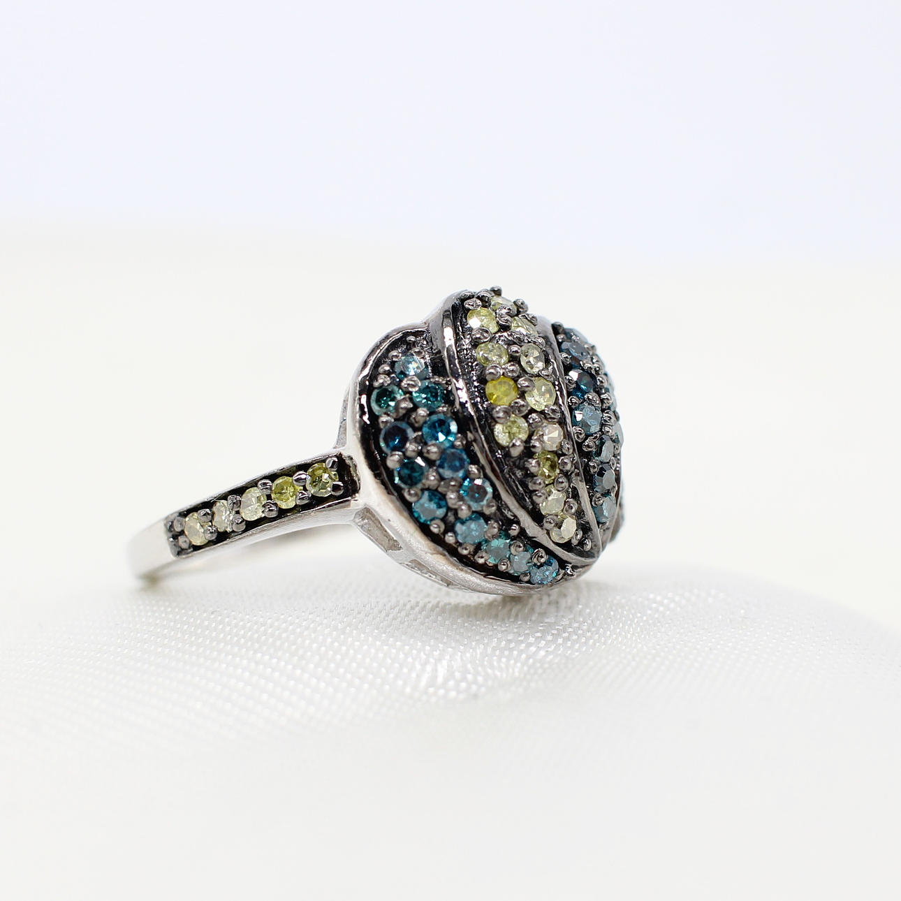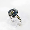 A unusual silver (tested 925, but unmarked) cluster ring set with blue and fancy, multi-coloured diamonds.