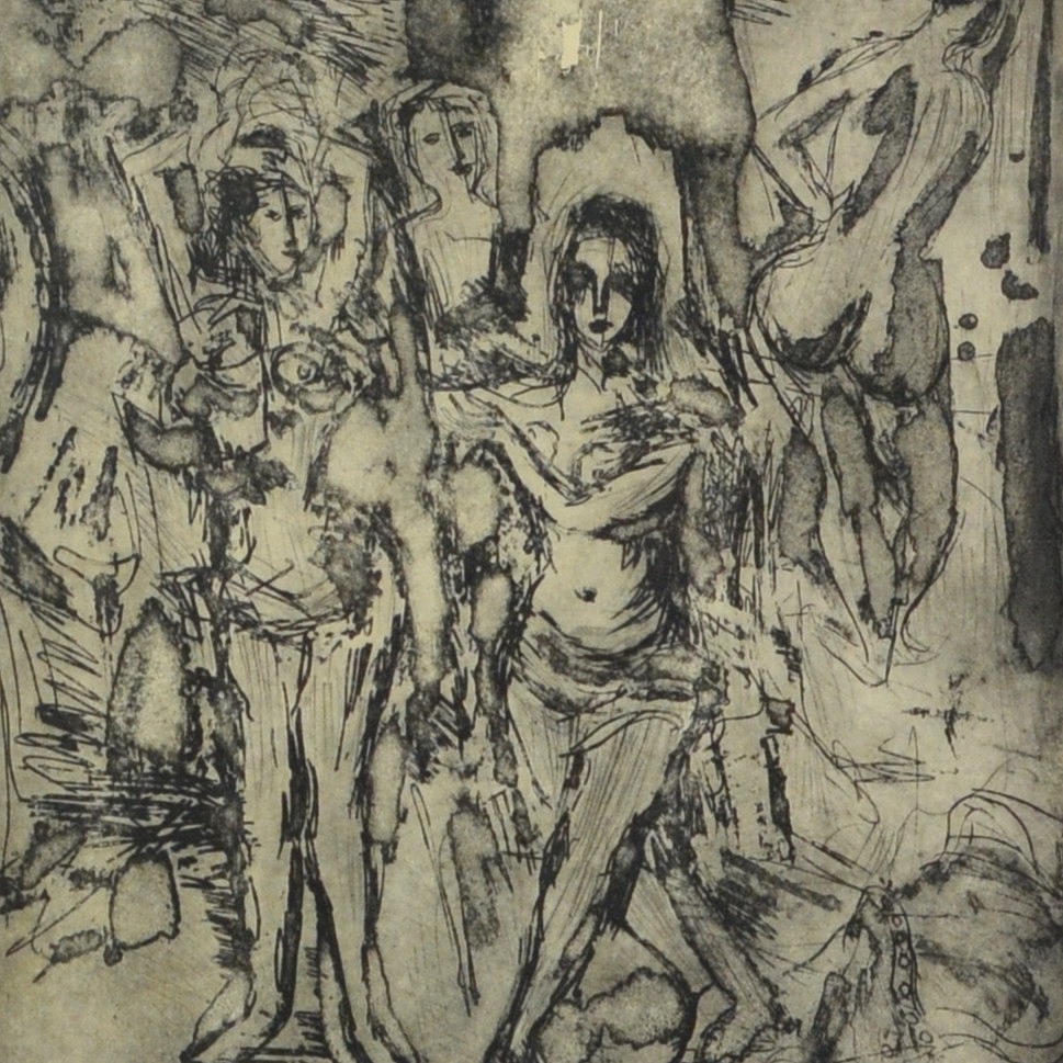 4914353. GROUP SCENE, ETCHING, MONOGRAMMED “W”, EARLY 20TH CENTURY.