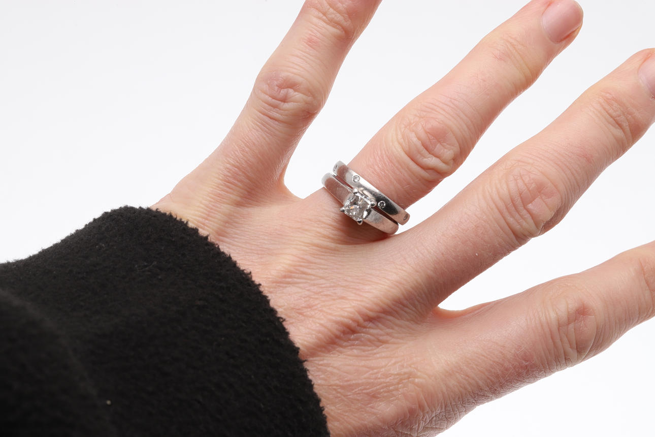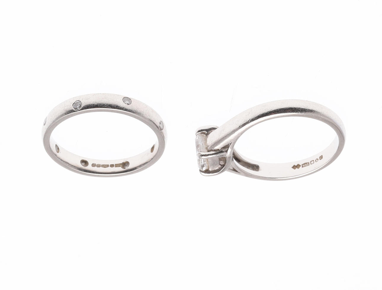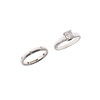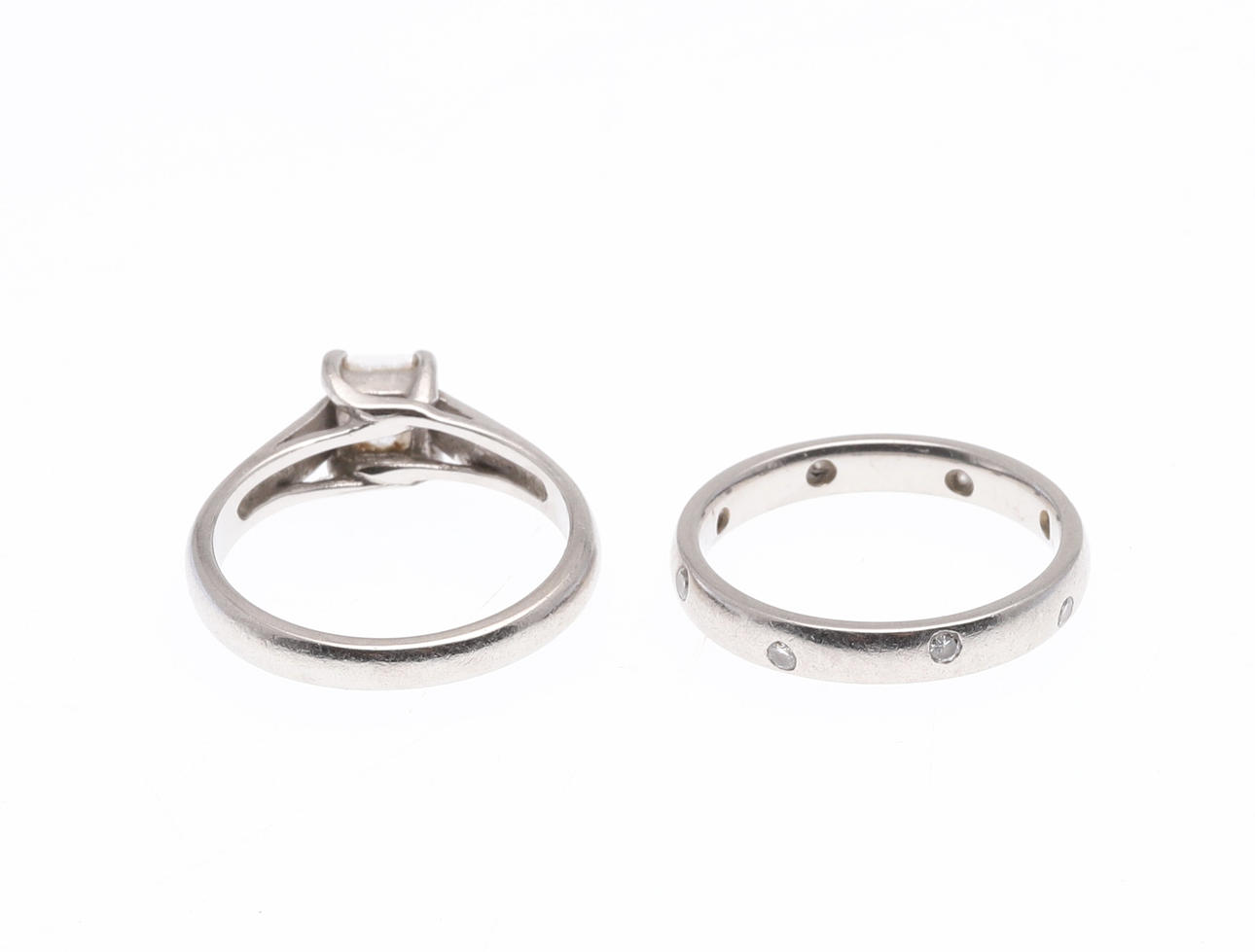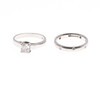 the princess-cut diamond weighs approximately 0.75 carats and is set in platinum, 5.2 grams, size L 1/2, together with a platinum wedding band, set throughout with circular-cut diamonds, 4.4 grams, size L.