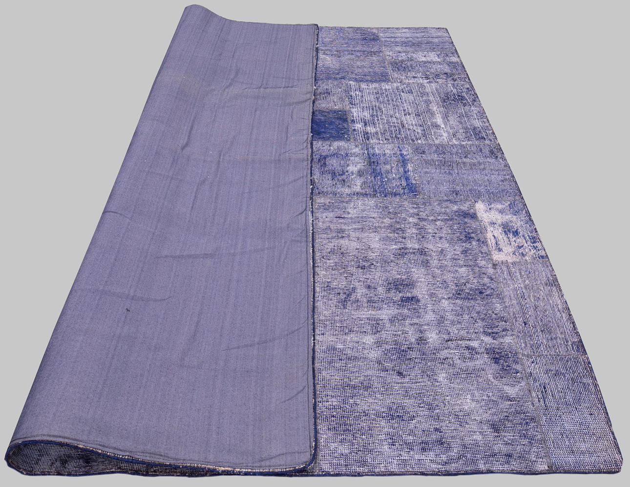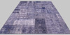 Patchwork carpet consisting of jointed carpet fragments in different purple-blue shades with varying texture.