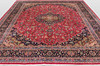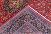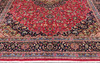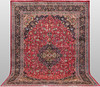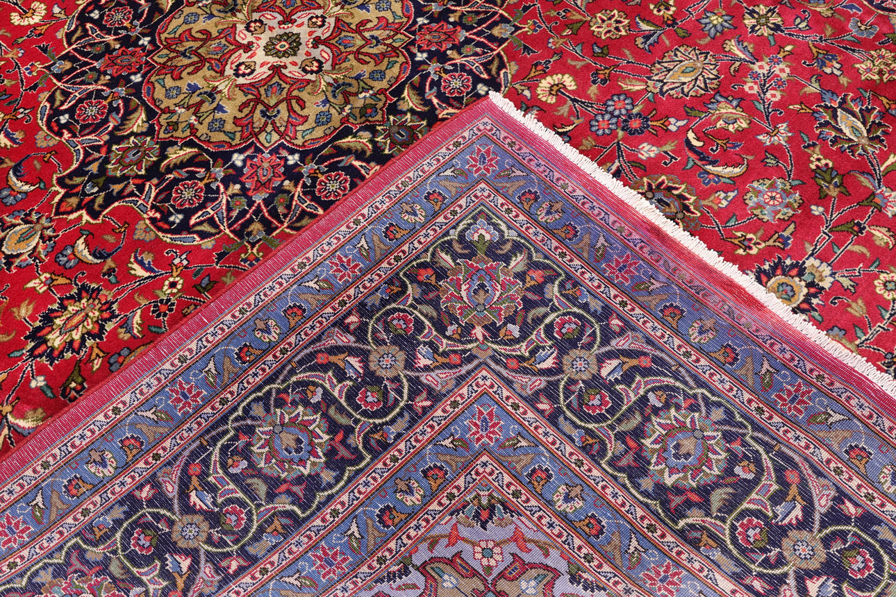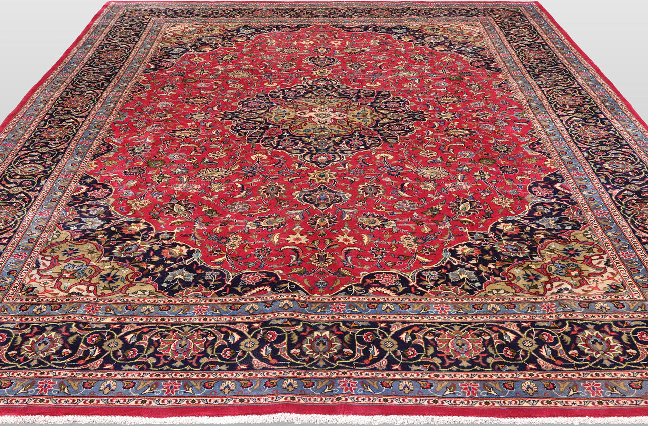 Meshed with red bottom color and a centrally placed medallion in dark blue and green. The center field is decorated with floral ornaments, palmettes and arabesques, and the corner portions follow the design language of the medallion. The border has a dark bottom with decoration of palm branches. The forelock is made of wool and the warp is of cotton.